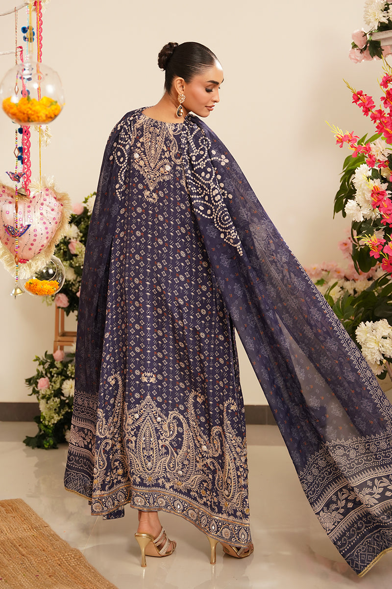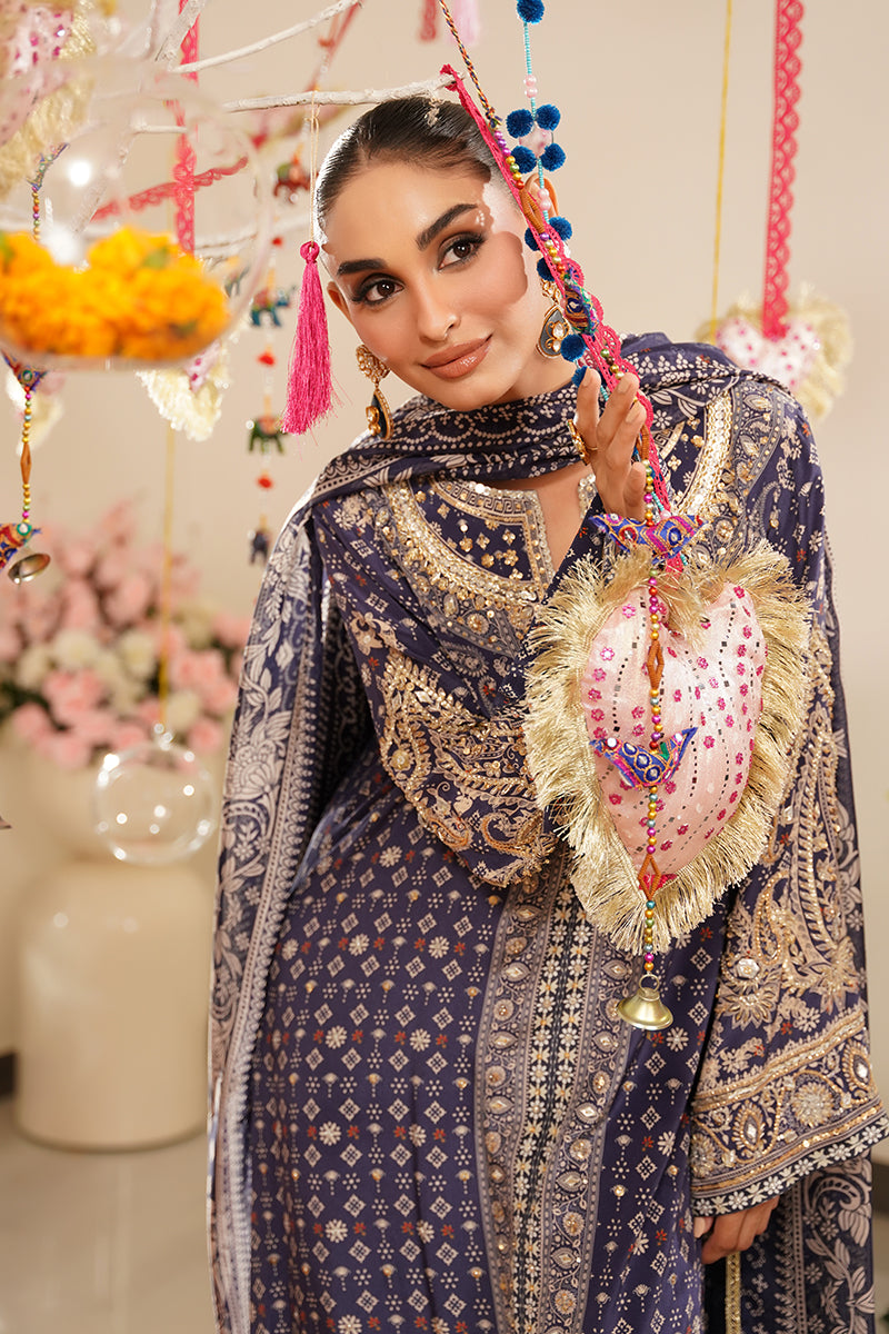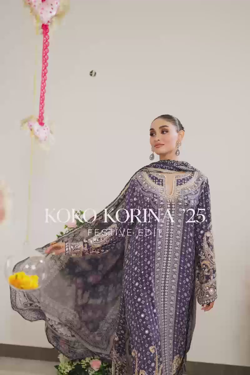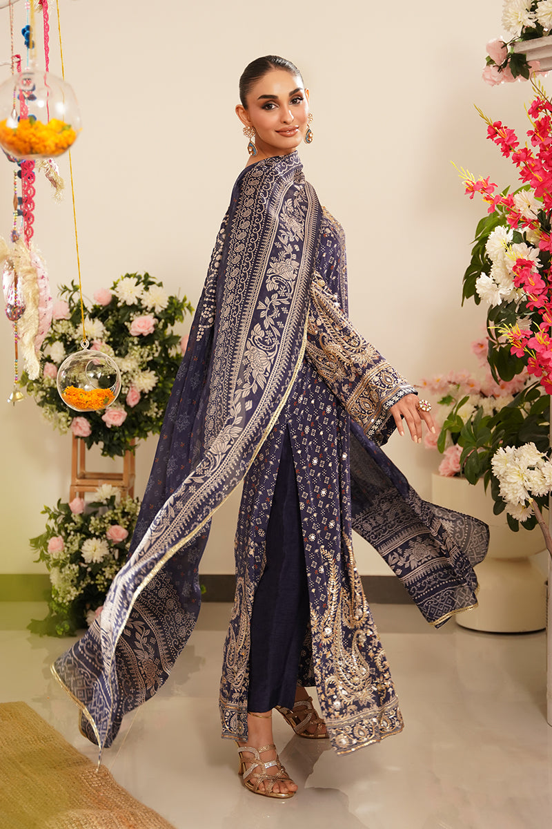 The look is paired with a printed tissue silk dupatta, finished with delicate gota lace that adds traditional elegance and a soft, festive shimmer. Completing the ensemble are classic straight pants, offering a clean and tailored finish to this versatile and graceful outfit.
