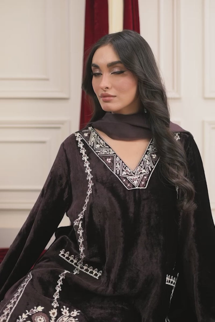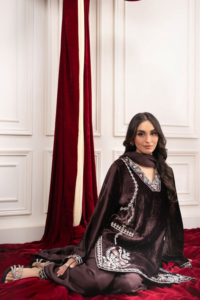 A choco brown velvet shirt adorned with delicate aari embroidery and functional side pockets, paired with a pure raw silk shalwar featuring intricate aari work on the hem. The look is completed with a silk dupatta finished with organza detailing, creating a refined ensemble that exudes understated luxury.