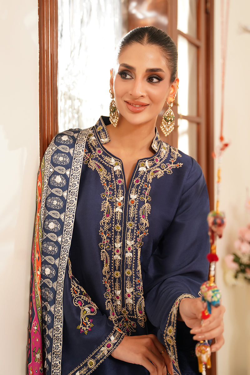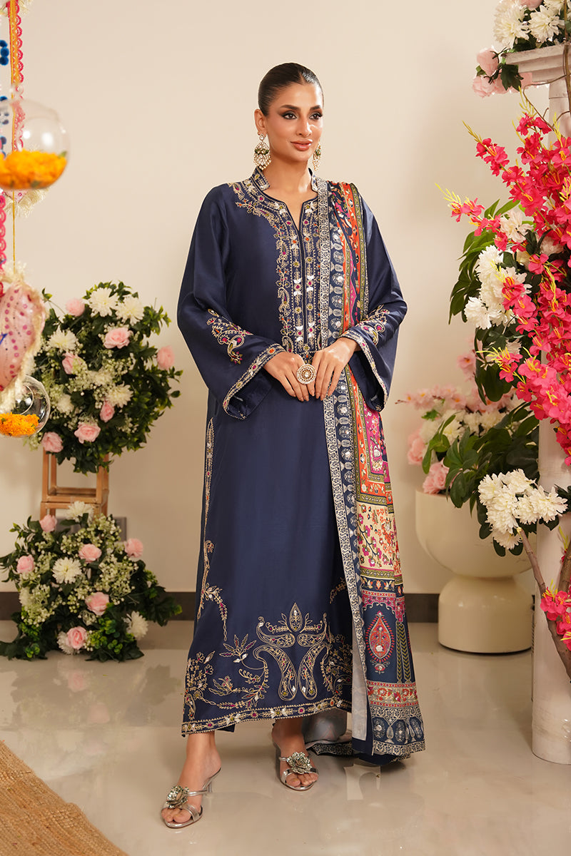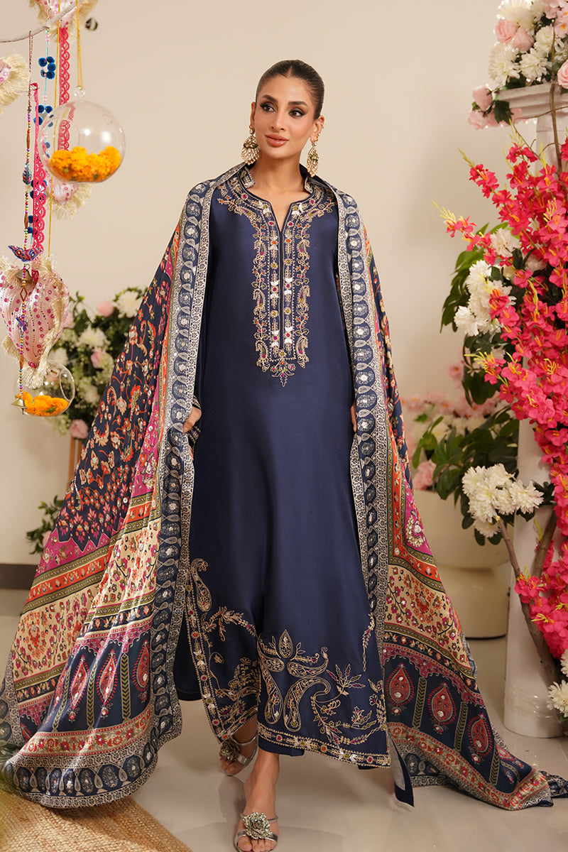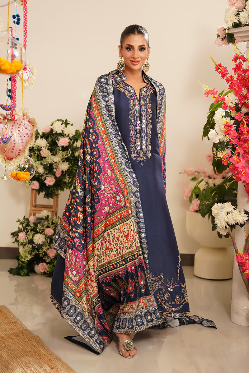Adding a luxurious touch, the ensemble is completed with a digitally printed charmeuse silk chaddar, featuring all-over embellishments that blend traditional craftsmanship with contemporary elegance. The chaddar’s fluid drape and intricate detailing make it a true statement piece.