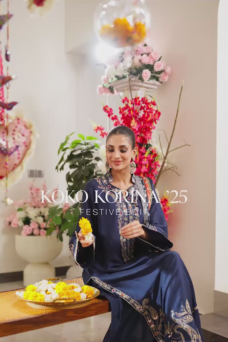 Elevate your festive wardrobe with this exquisite blue shirt crafted from pure raw silk, adorned with delicate embroidery in soft tones of beige, pinks, and orange, beautifully accented with silver gota work. The intricate detailing against the rich blue base creates a refined yet vibrant look, perfect for celebratory occasions.