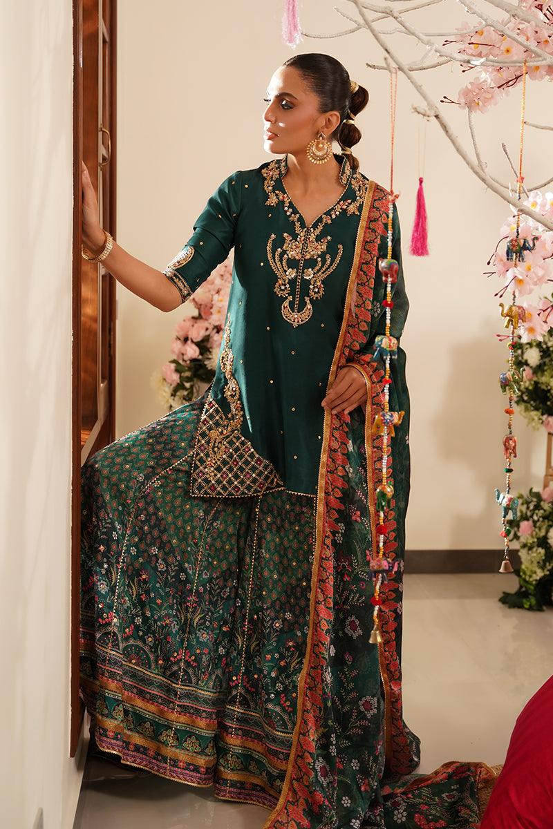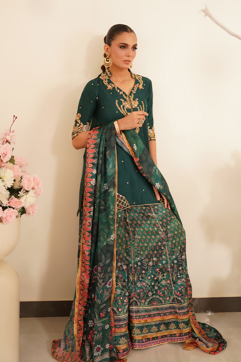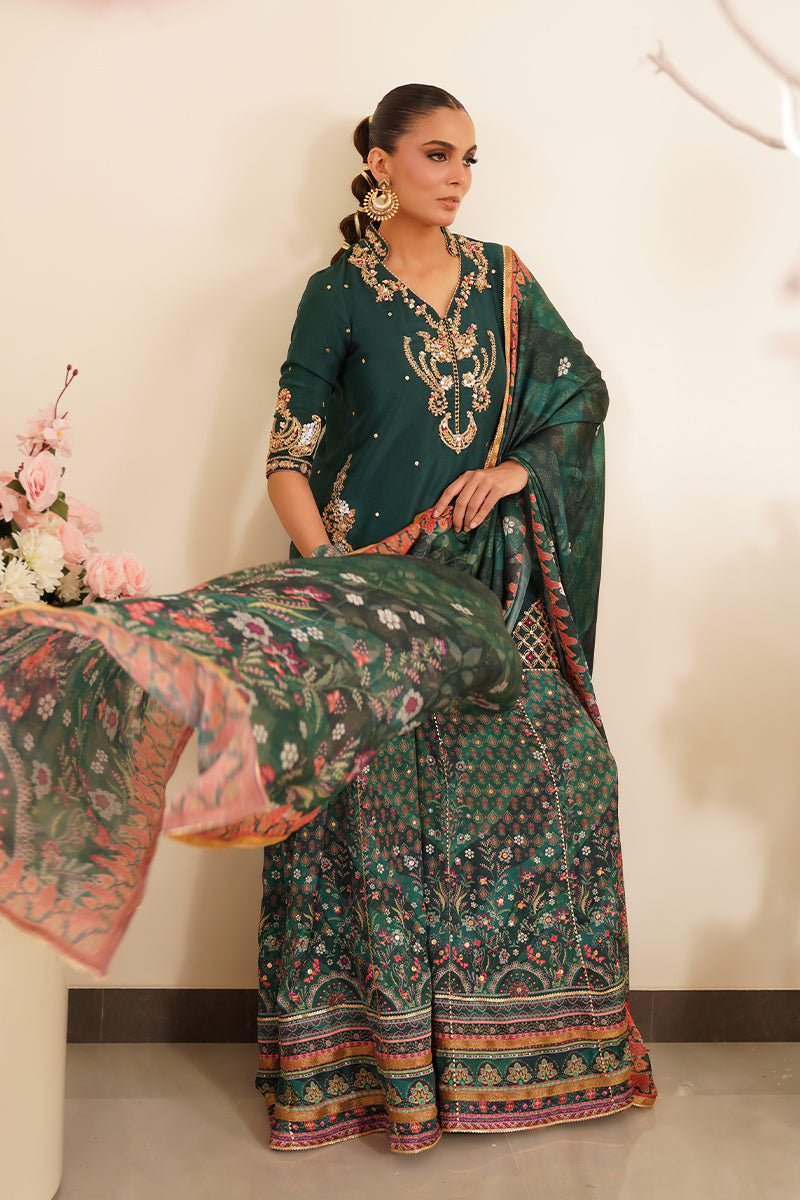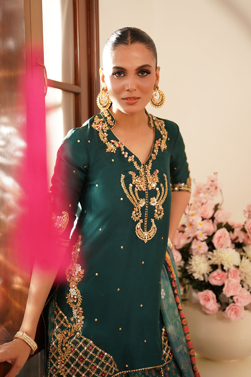 Exude timeless charm in this elegant green shirt crafted from pure raw silk, exquisitely adorned with traditional marori work and intricate hand embroidery featuring dabka, garari gota, and sparkling stones. The rich texture of raw silk beautifully enhances the detailed craftsmanship, making it a perfect statement piece for festive occasions. The shirt is paired with a printed green dhaka featuring delicate floral patterns and finished with gota detailing, adding a soft, traditional flair and movement to the ensemble. Completing the look is a printed tissue silk dupatta, light and graceful, enhanced with gota lace finishings for a touch of festive elegance.
