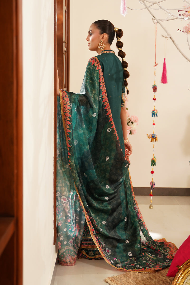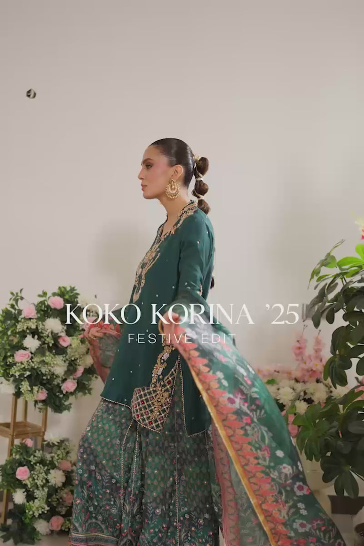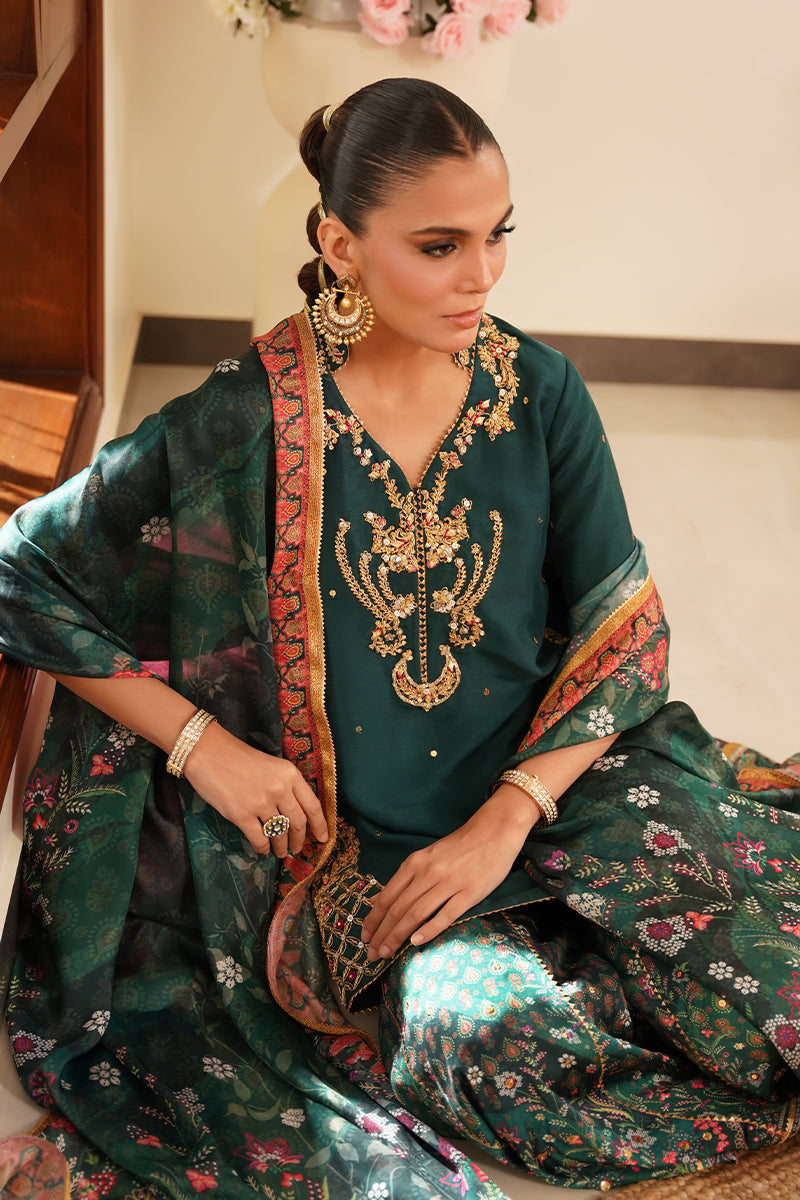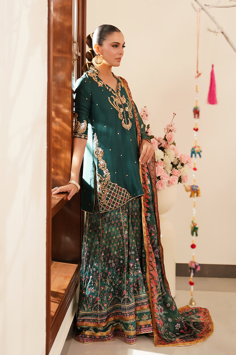 Exude timeless charm in this elegant green shirt crafted from pure raw silk, exquisitely adorned with traditional marori work and intricate hand embroidery featuring dabka, garari gota, and sparkling stones. The rich texture of raw silk beautifully enhances the detailed craftsmanship, making it a perfect statement piece for festive occasions. The shirt is paired with a printed green dhaka featuring delicate floral patterns and finished with gota detailing, adding a soft, traditional flair and movement to the ensemble. Completing the look is a printed tissue silk dupatta, light and graceful, enhanced with gota lace finishings for a touch of festive elegance.