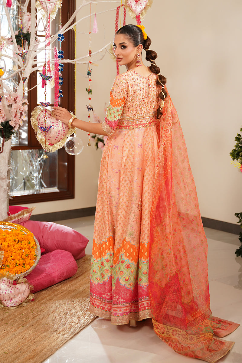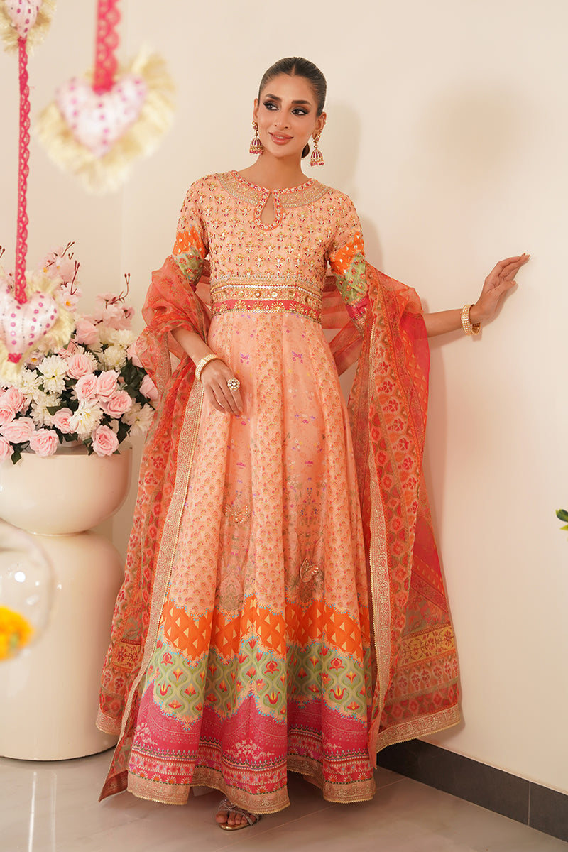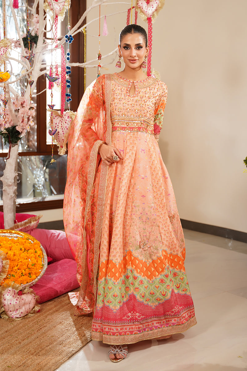 A standout detail is the addition of handworked 3D butterflies delicately placed along the ghera, adding a whimsical and artistic touch to the ensemble. The look is paired with a printed organza dupatta in vibrant, festive hues, offering a light, graceful contrast to the structured pishwas. Complete your outfit with optional straight pants in pure raw silk, available as an add-on, perfect for elevating the ensemble with a refined finish.