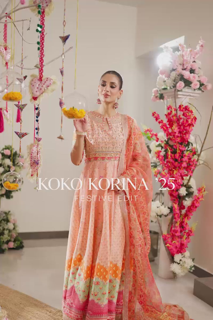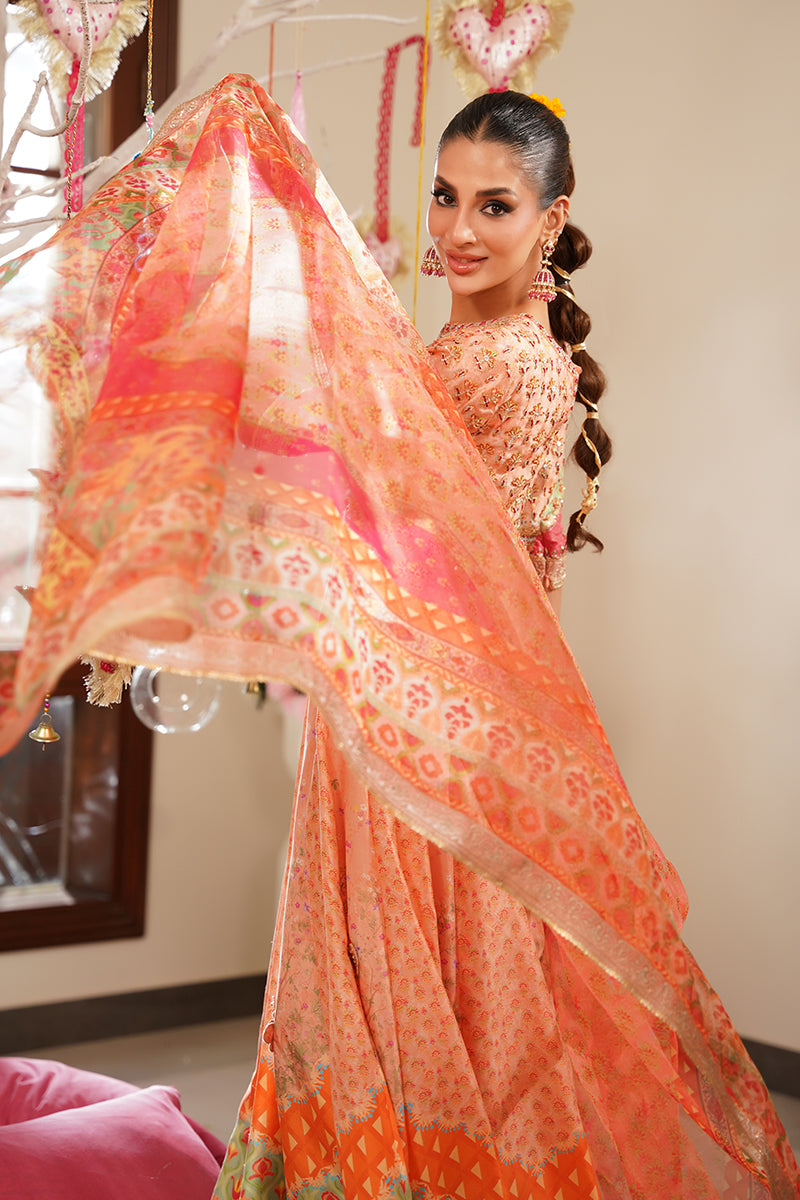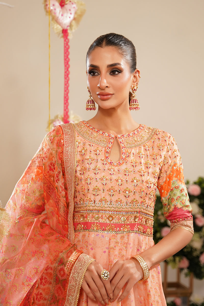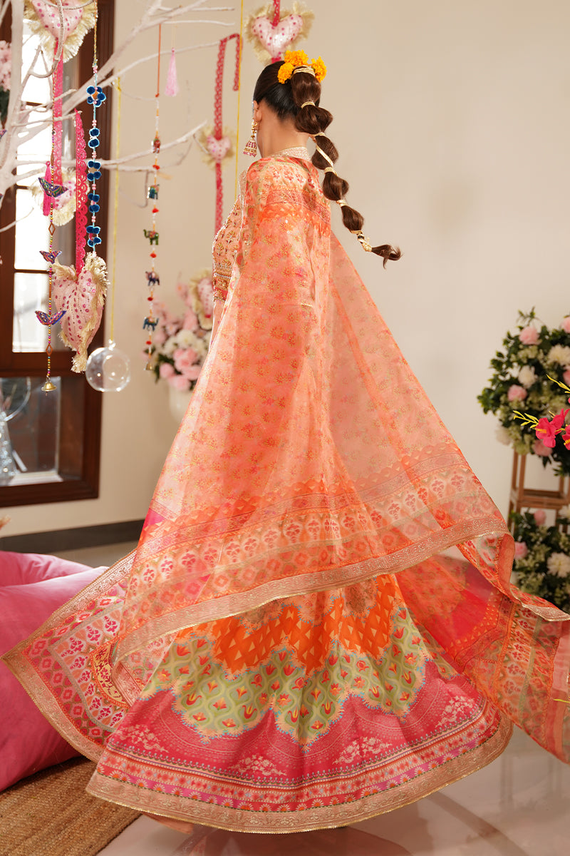 A standout detail is the addition of handworked 3D butterflies delicately placed along the ghera, adding a whimsical and artistic touch to the ensemble. The look is paired with a printed organza dupatta in vibrant, festive hues, offering a light, graceful contrast to the structured pishwas. Complete your outfit with optional straight pants in pure raw silk, available as an add-on, perfect for elevating the ensemble with a refined finish.