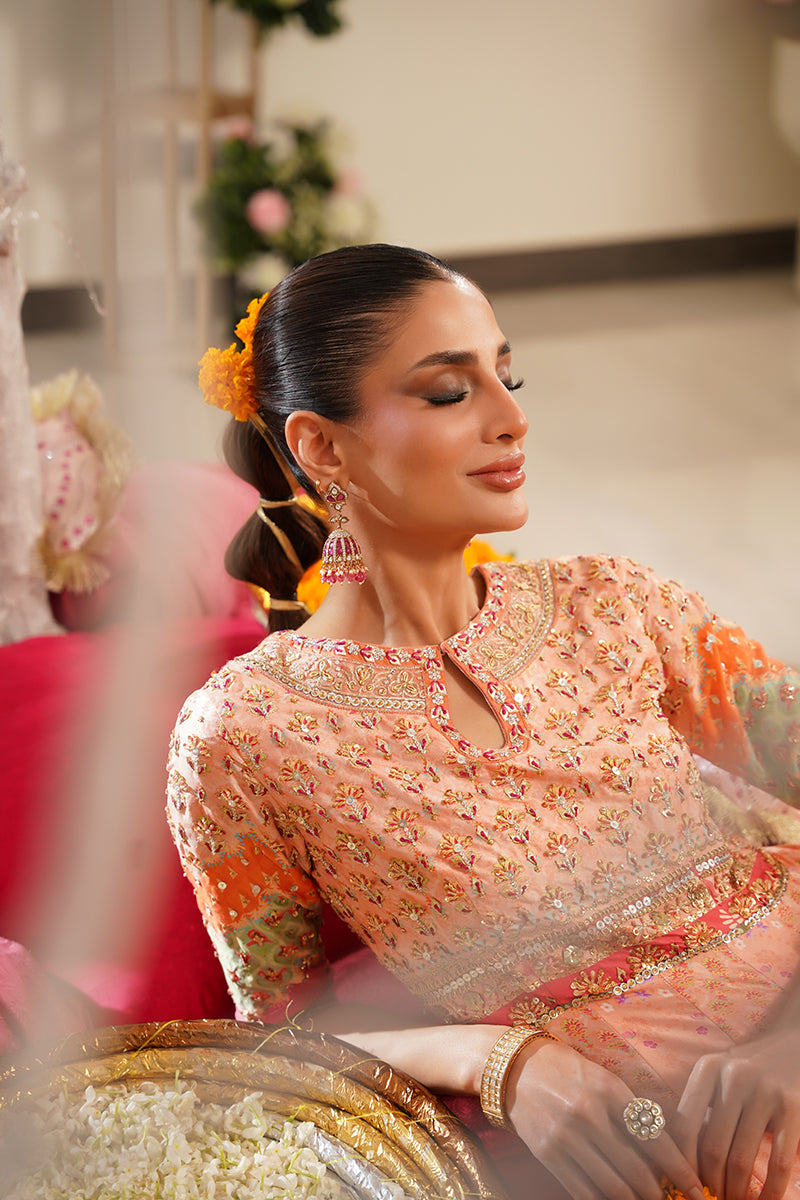 Step into a world of vibrant elegance with this beautifully crafted pink printed pishwas, designed with bold color blocking in shades of pink, orange, and green. The choli is richly adorned with intricate hand embroidery featuring gota, dabka, resham, and shimmering stones, creating a stunning interplay of texture and sparkle.