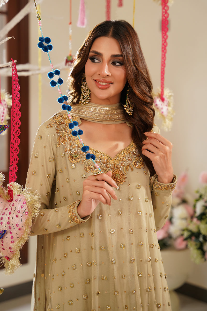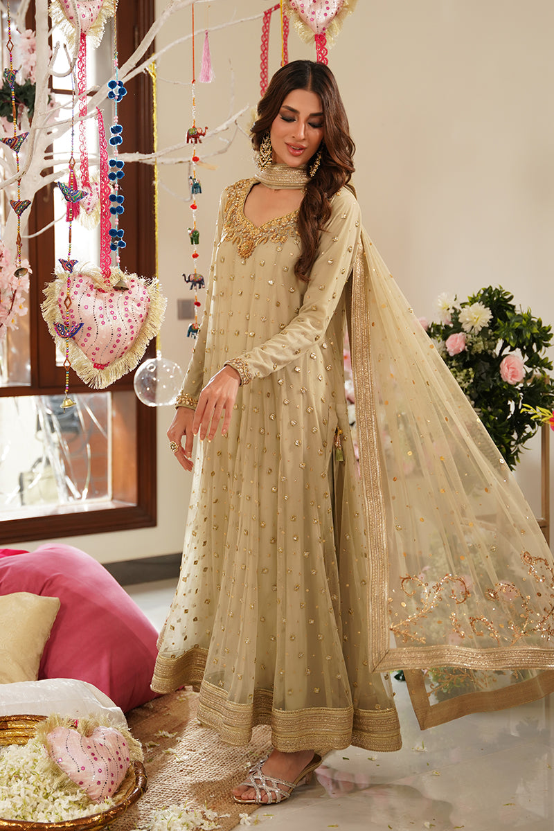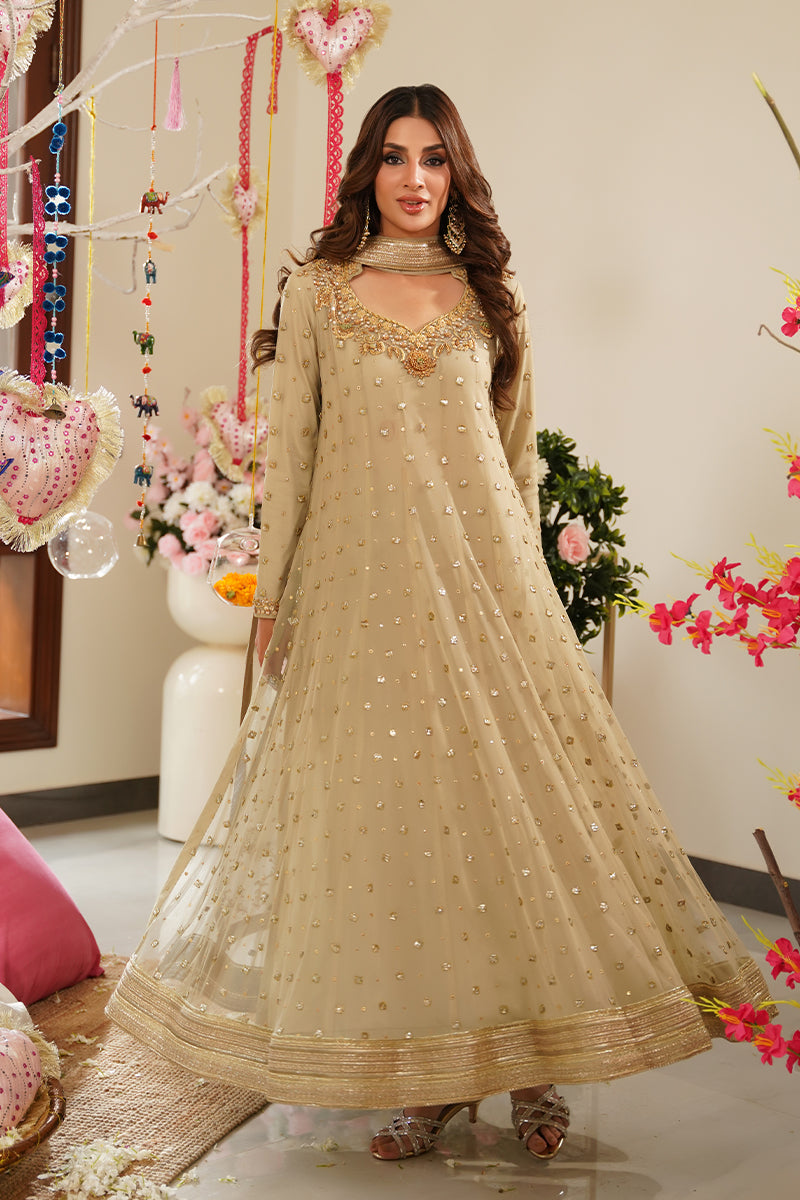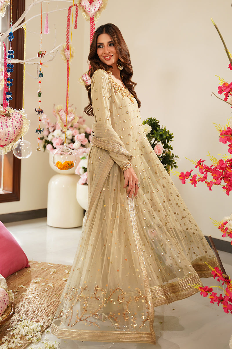 Ethereal in pistachio green, this net kalidar is a perfect blend of elegance and tradition. The silhouette features a heavily embellished neckline, while the hem is adorned with intricate gota-detailed border work that adds richness and depth. The entire flare is sprinkled with delicate chan gota, creating a soft shimmer with every movement.