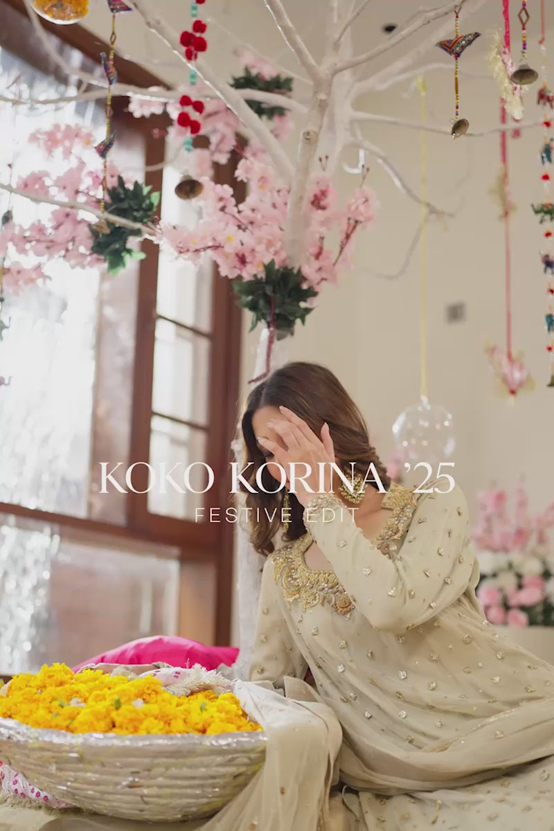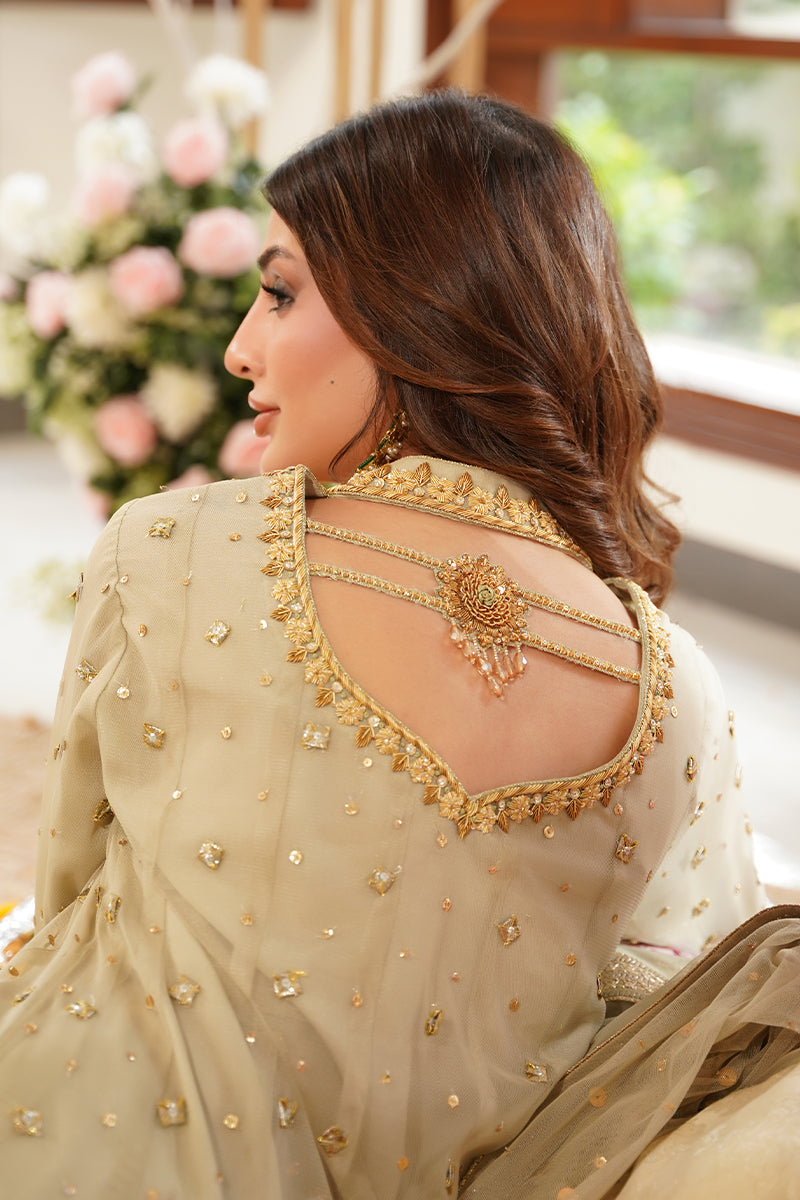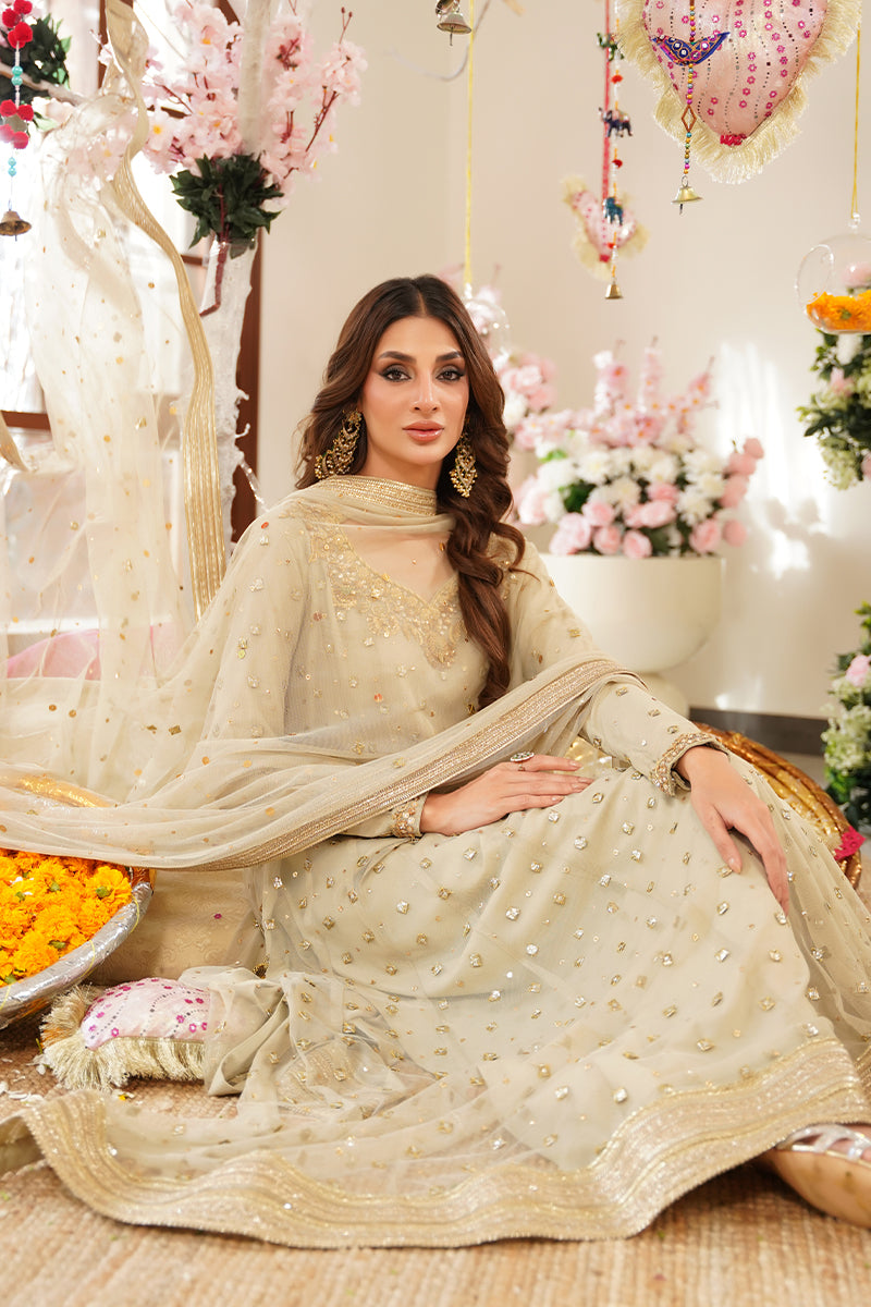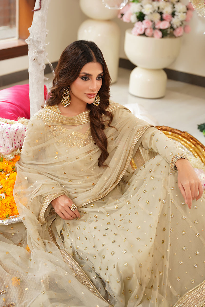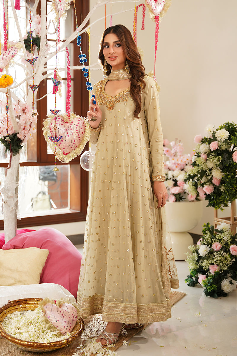 Ethereal in pistachio green, this net kalidar is a perfect blend of elegance and tradition. The silhouette features a heavily embellished neckline, while the hem is adorned with intricate gota-detailed border work that adds richness and depth. The entire flare is sprinkled with delicate chan gota, creating a soft shimmer with every movement.