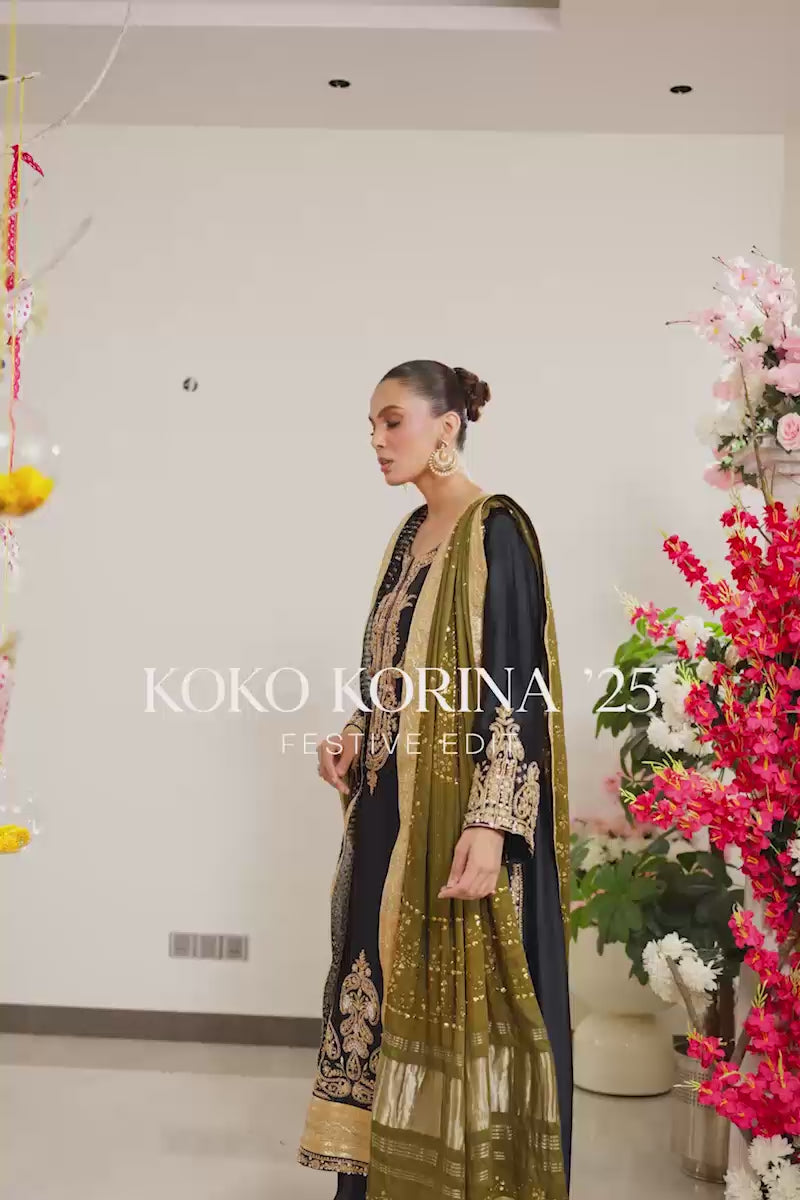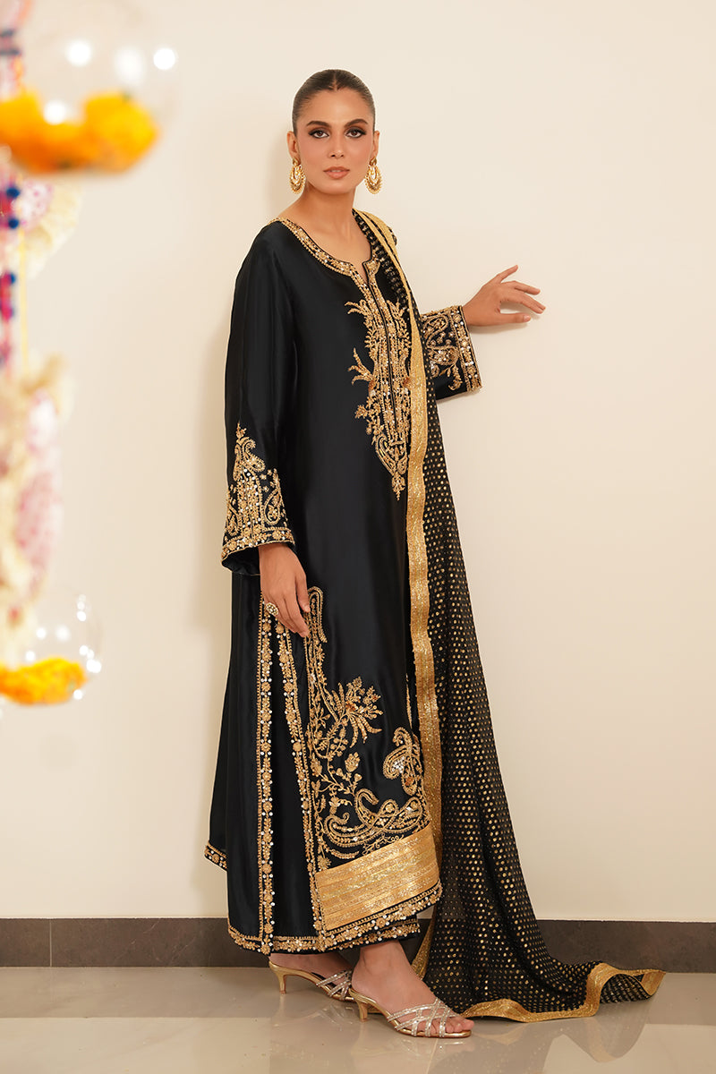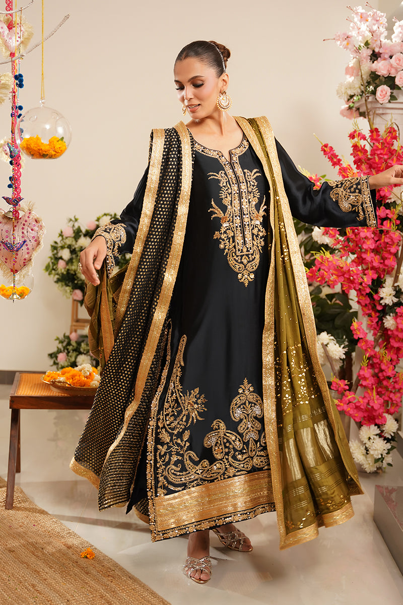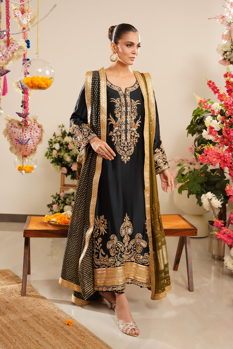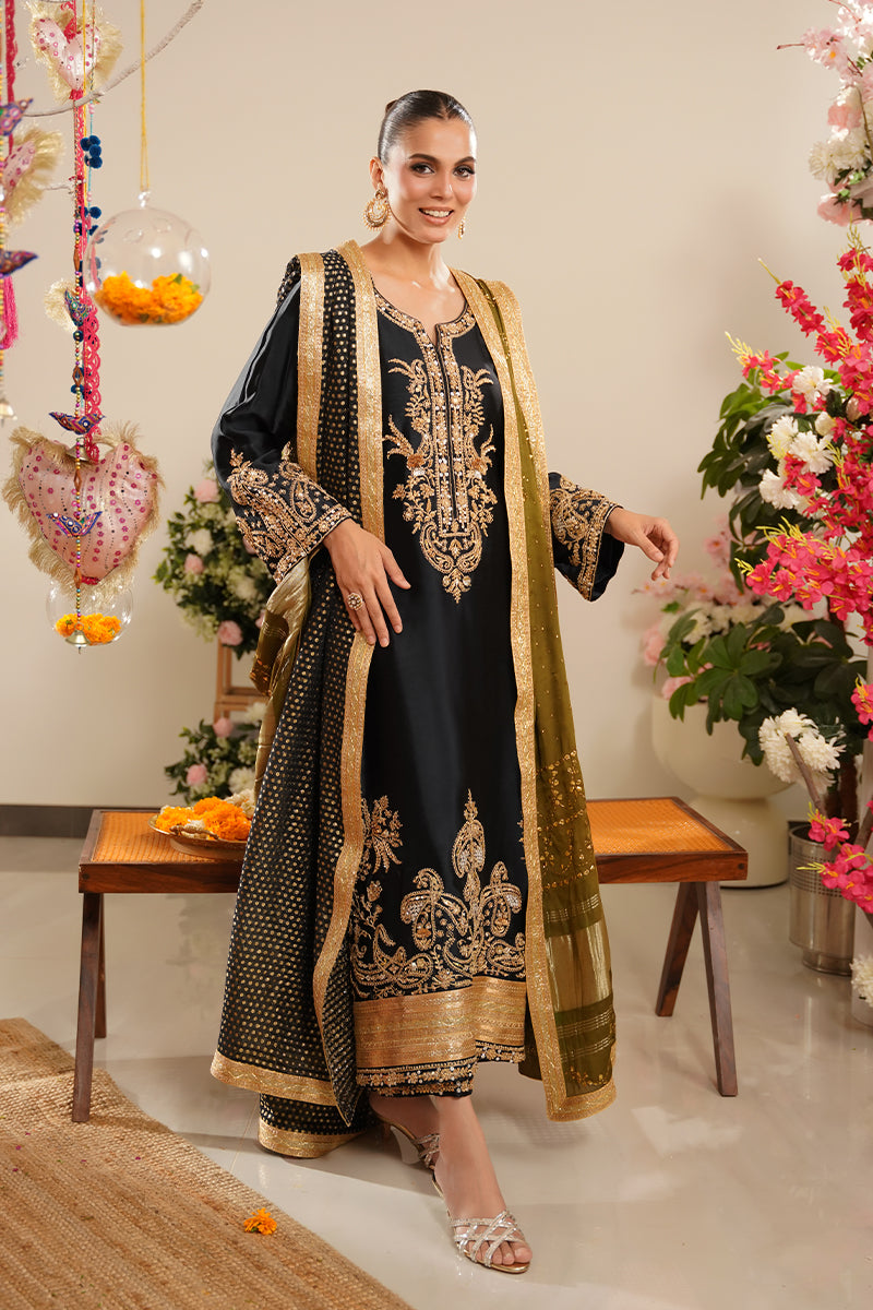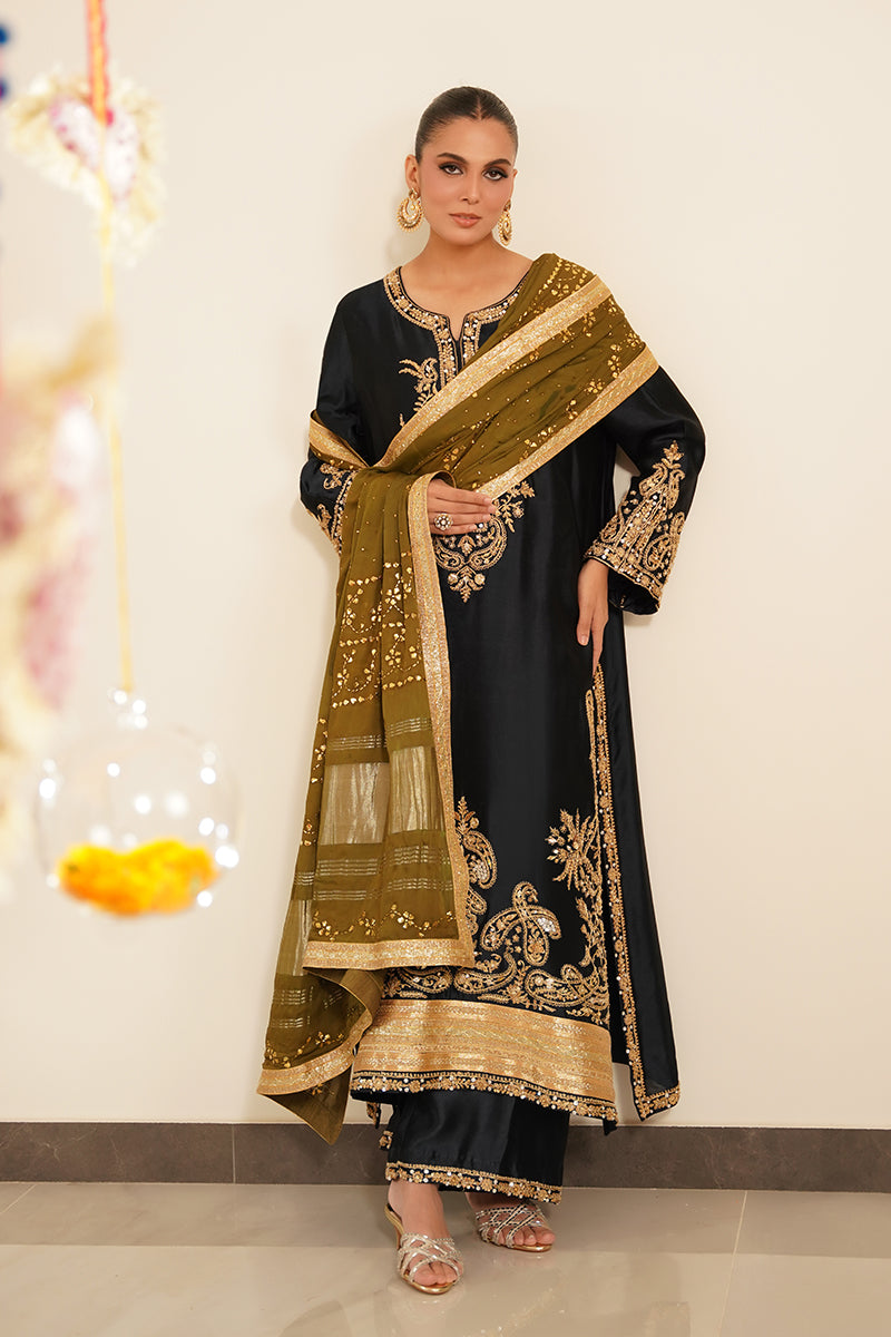Paired with matching sheesha silk straight pants, the silhouette remains classic yet refined, making it ideal for formal and festive occasions.