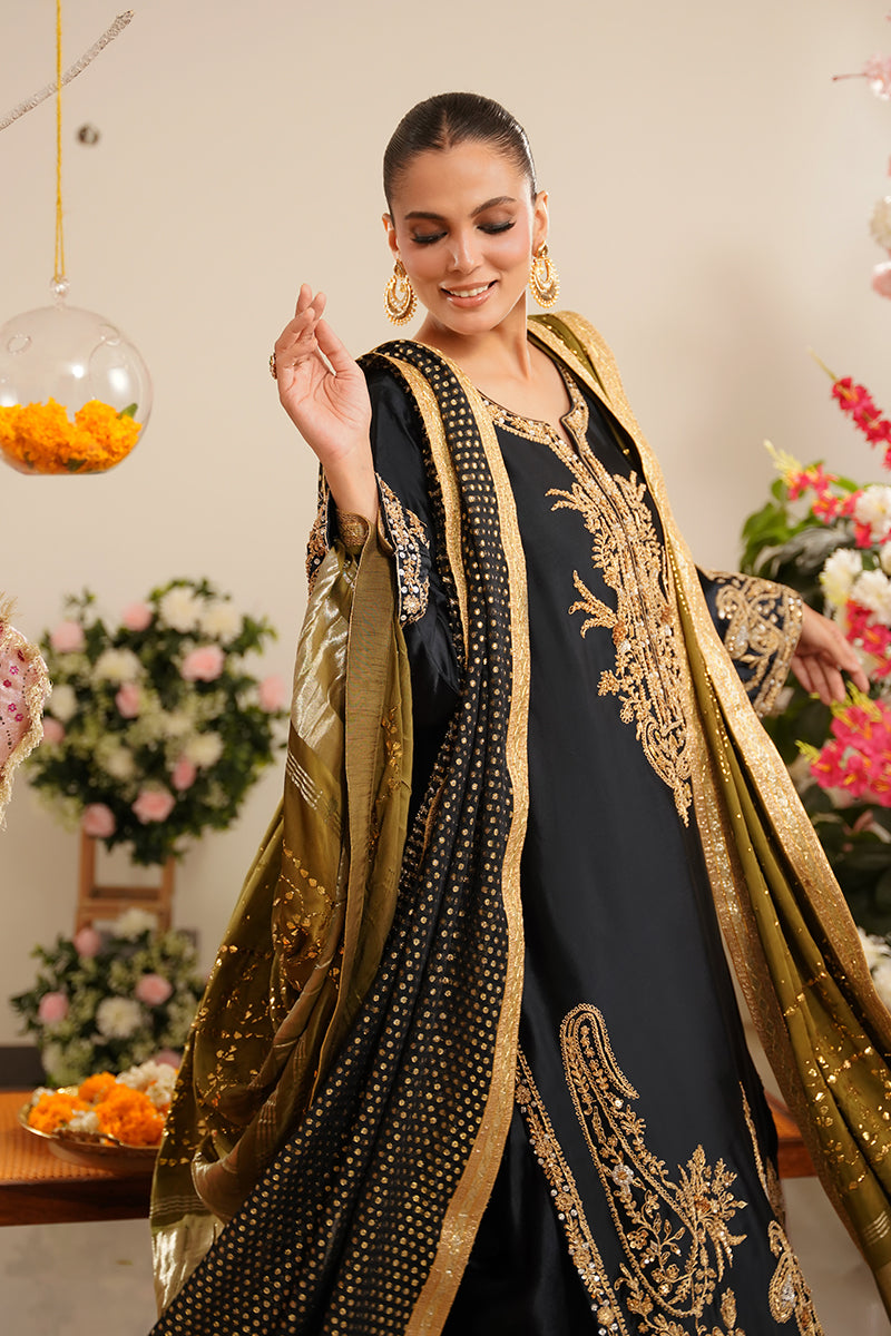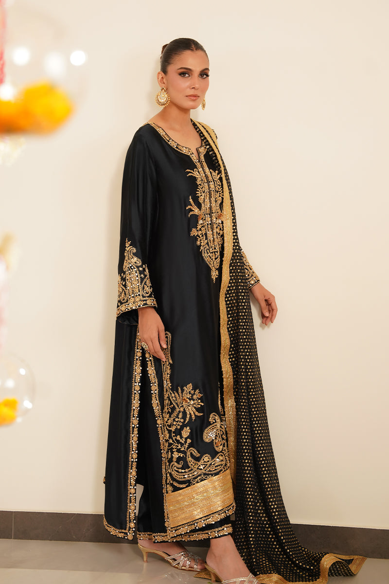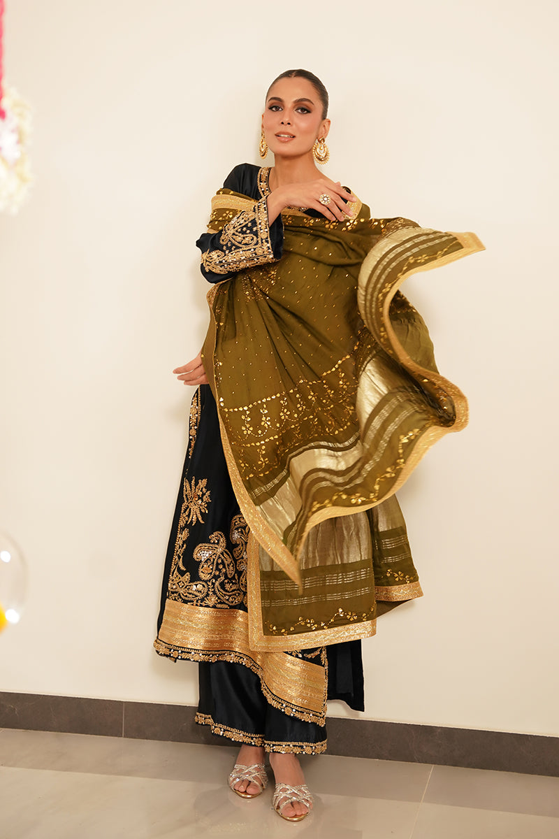 Turn heads in this regal deep blue shirt crafted from luxurious sheesha silk, featuring intricate marori work along the neckline and hem. The shirt is further elevated with hand embroidery in dabka, sitara, and gota, adding rich texture and a hint of festive sparkle. Gota borders at the hem complete the look with a traditional touch of finesse.