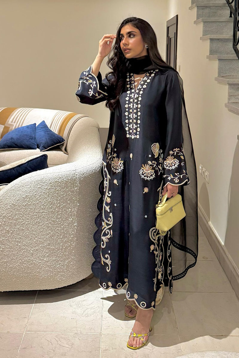 Make a statement this Eid! A luxurious black pure rawsilk Aari shirt that exudes elegance, featuring intricate Aari embroidery along the neckline, showcasing delicate craftsmanship and timeless beauty. The shirt is designed with a scalloped hem and scalloped sleeves, adding a soft, feminine touch to its sophisticated silhouette. The ensemble is completed with a flowing organza dupatta, adorned with lace details that create a delicate contrast to the deep richness of the rawsilk. Paired with straight pants made of pure rawsilk ( as an add on), the outfit combines comfort with style, creating a seamless, chic look perfect for any special occasion.