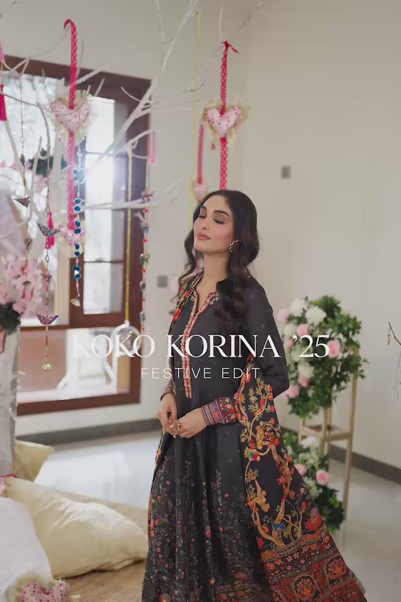 Bold and timeless, this black pure raw silk ensemble features vibrant floral prints in striking shades of red, orange, and green — creating a captivating contrast against the rich base. The neckline is delicately adorned with intricate handwork embellishments, adding a refined touch of craftsmanship and elegance. It is paired with a digitally printed crepe silk dupatta, featuring coordinated floral motifs and finished with self piping for a clean, tailored look.