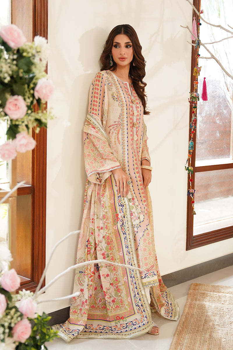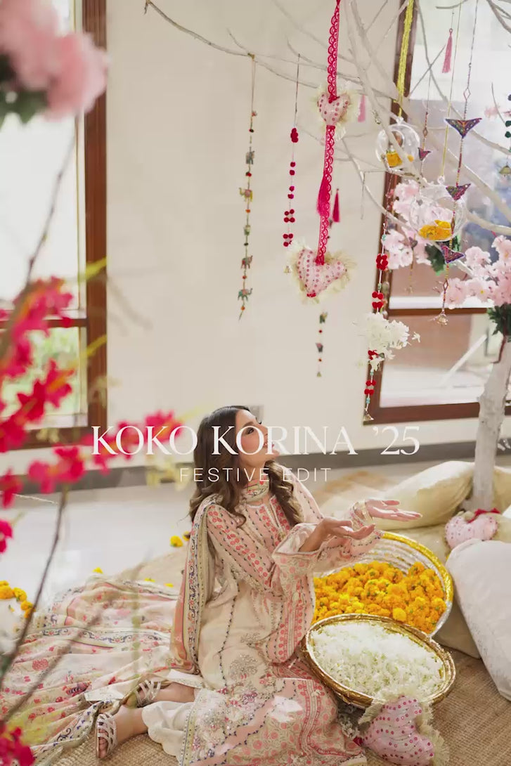 A soft vision in ivory, this pure raw silk ensemble features delicate floral prints in shades of pink, green, and blue — a perfect harmony of color and elegance. The print is tastefully elevated with hand embellishments that add subtle sparkle and depth, bringing the design to life with refined craftsmanship.