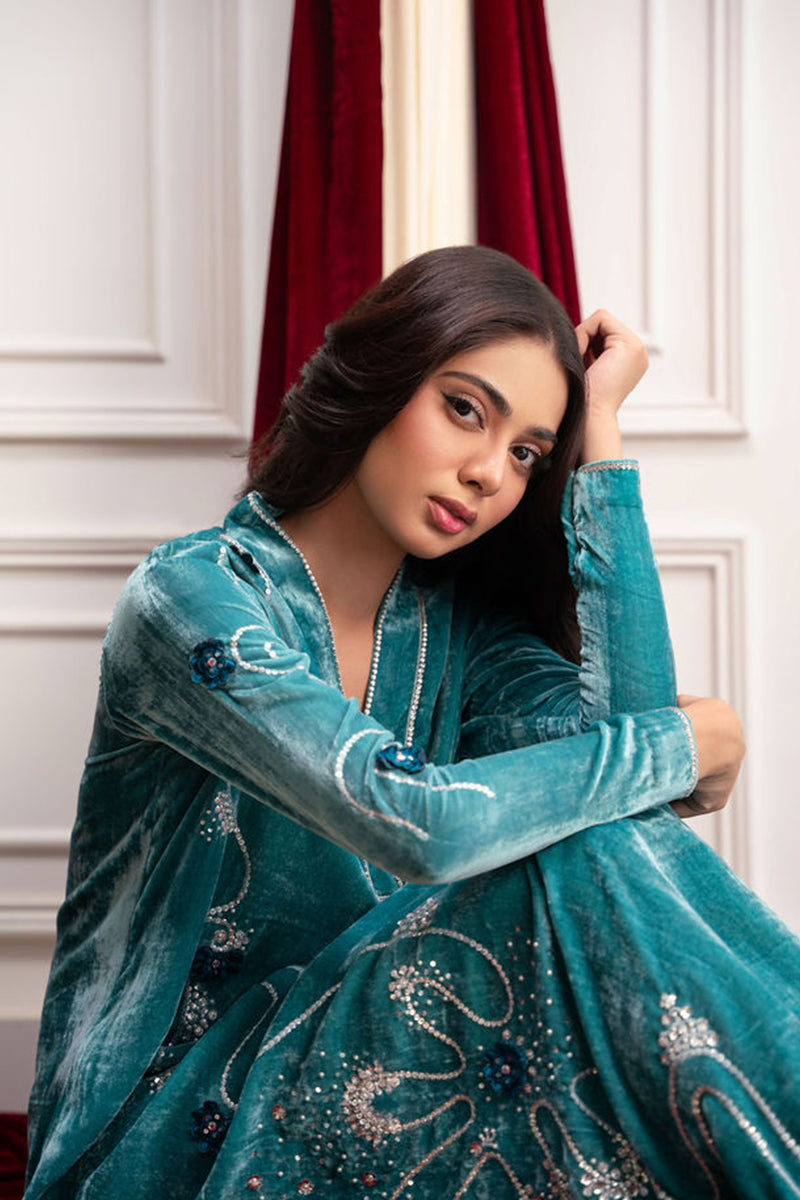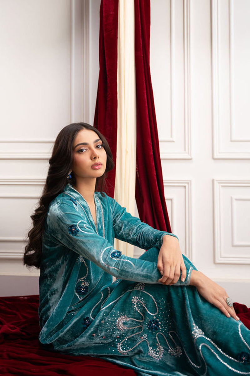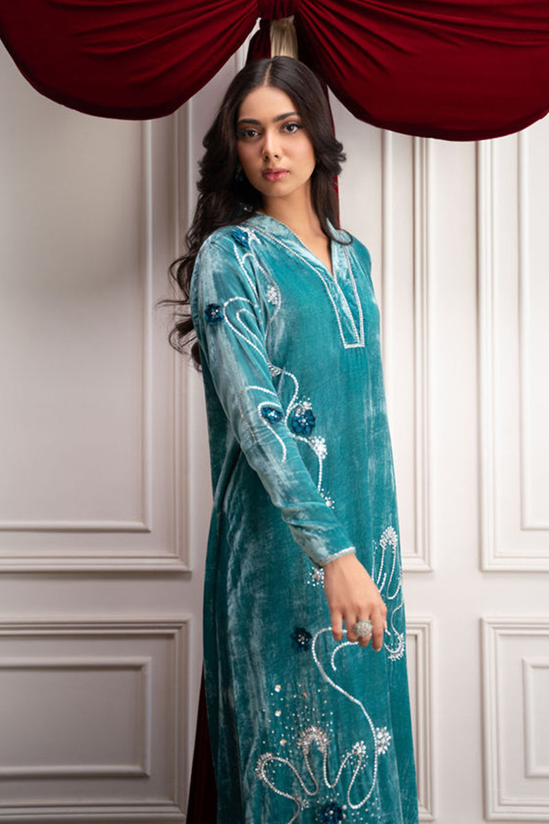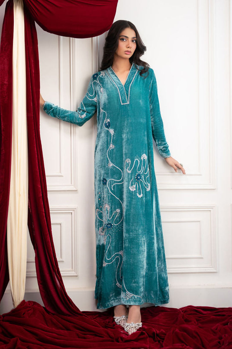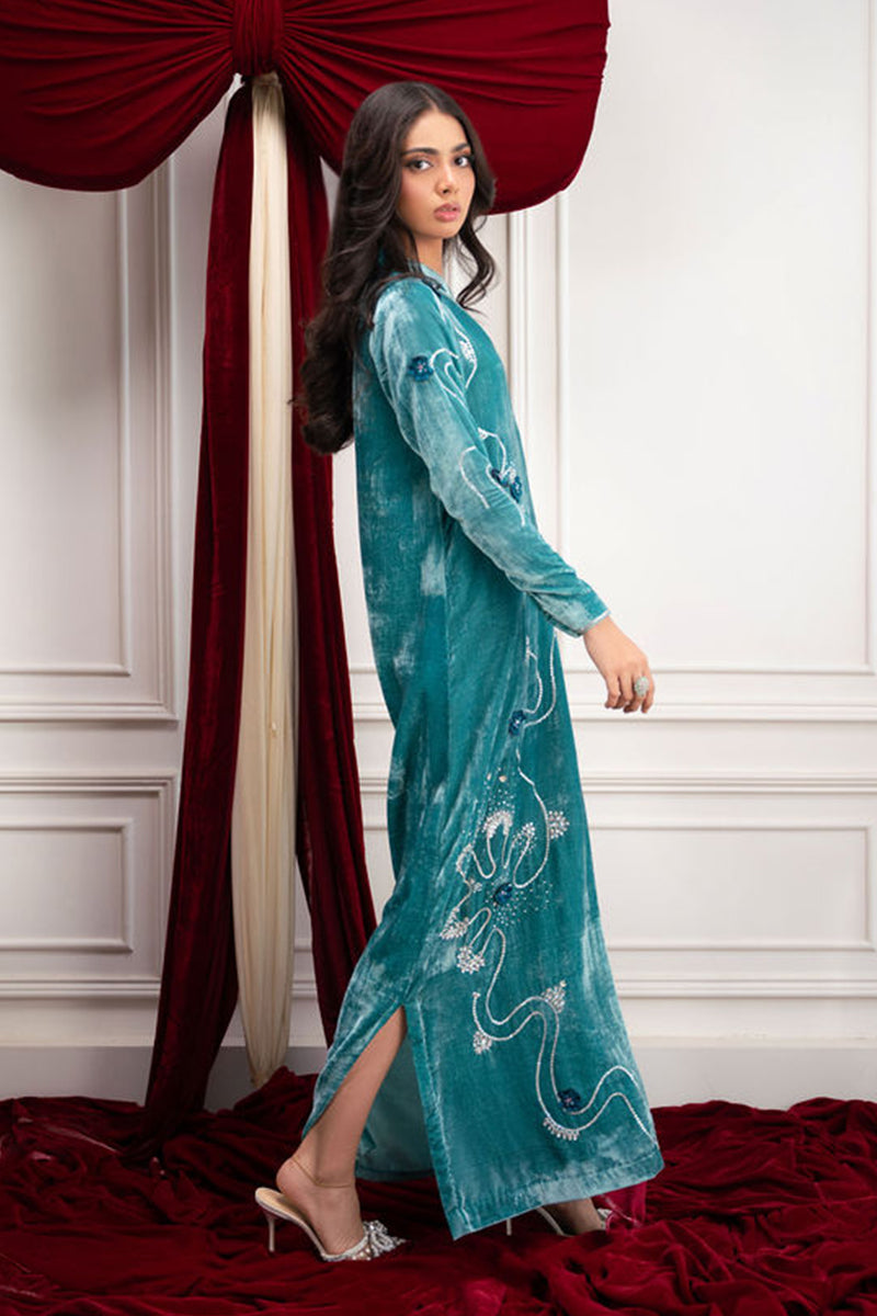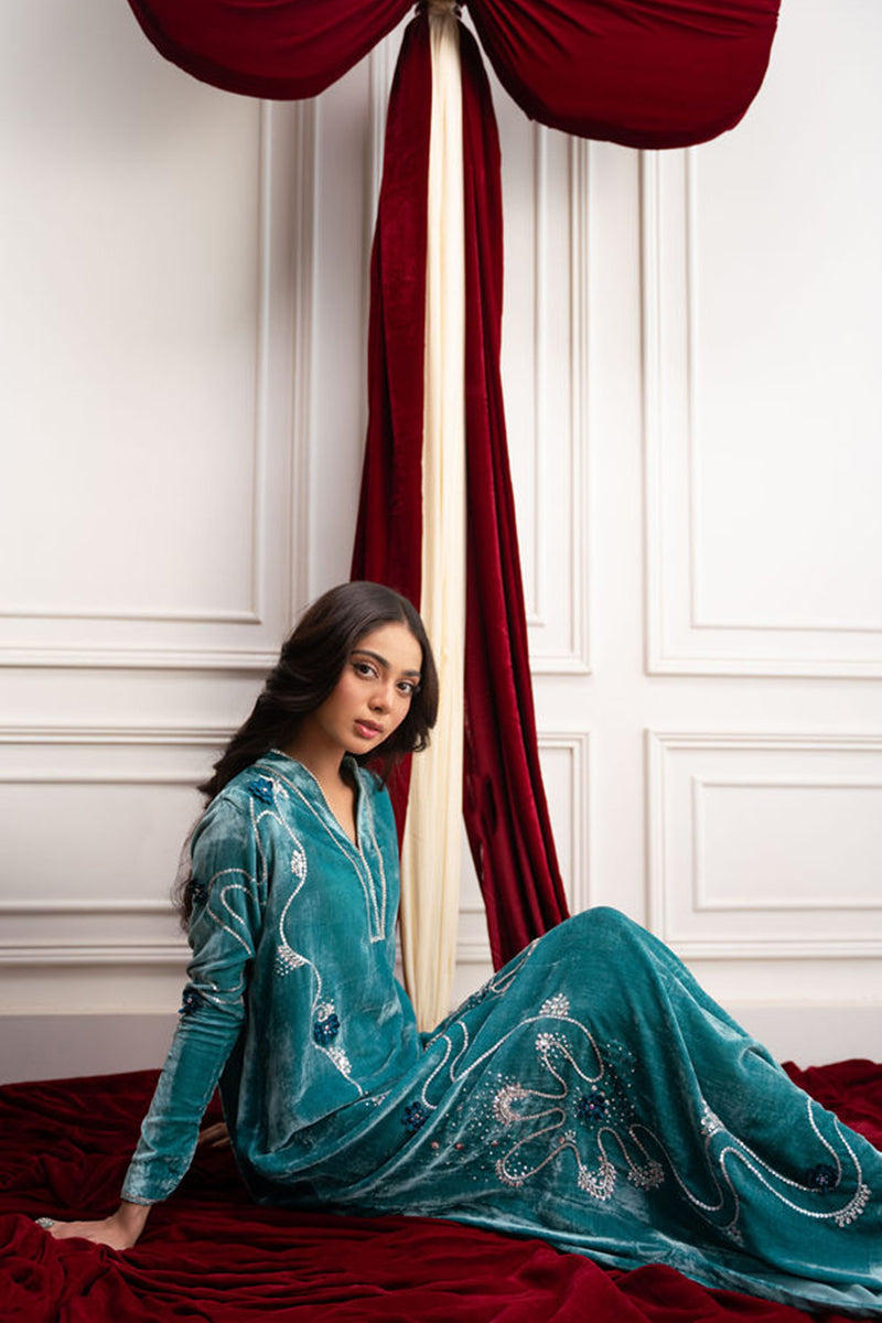 A striking turquoise-teal velvet kaftan-cut kurta featuring an abstract play of hand embellishments with Swarovski crystals, dabka, and intricate 3D resham floral patterns. The luxurious texture and contemporary detailing make it a statement piece that perfectly balances elegance and artistry.