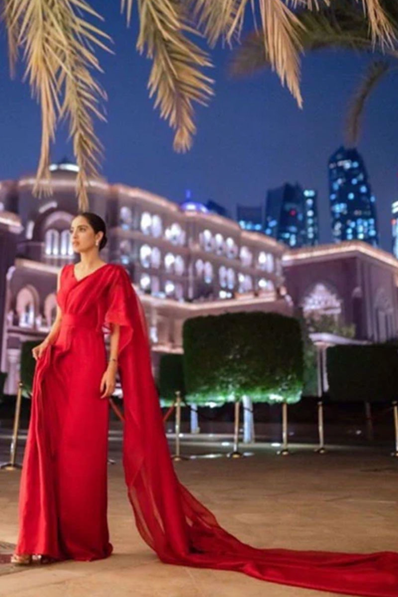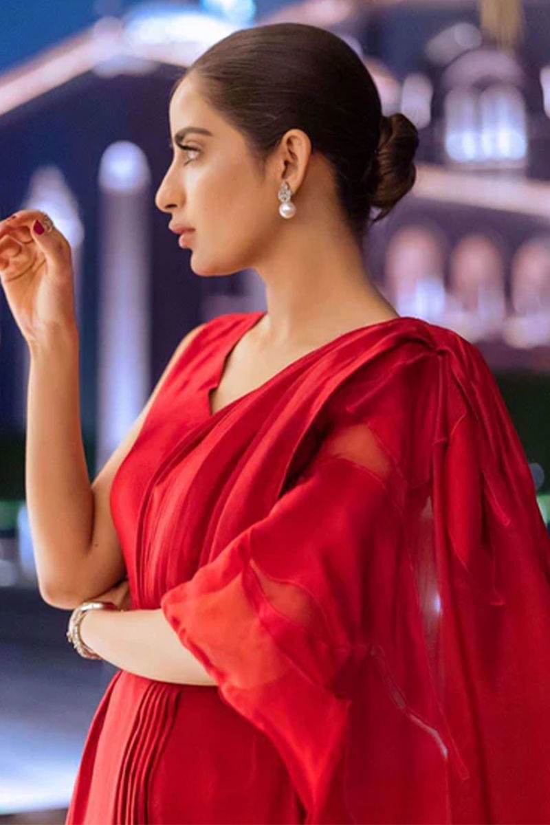 Look drop-dead gorgeous in a red Amna Arshad creation. Shirt: Silk