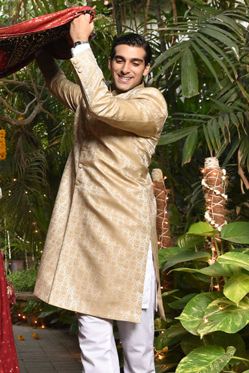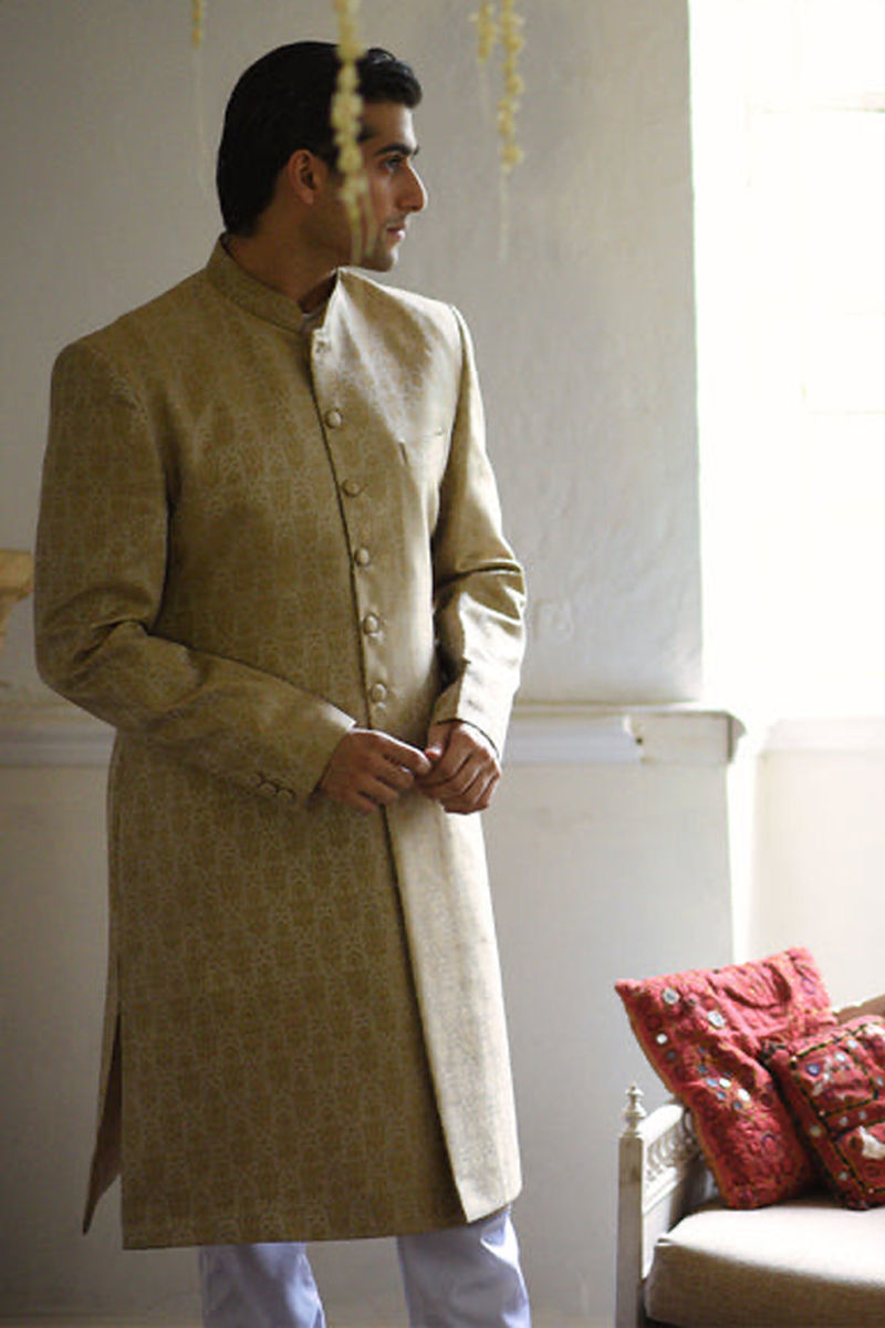 Cut from self jamawar in earthy tones of beige and gold, a perfect sherwani for your nikkah or shaadi.