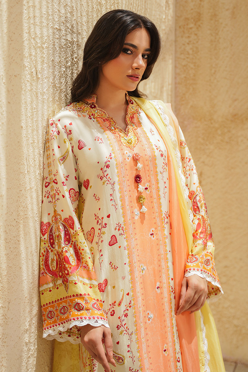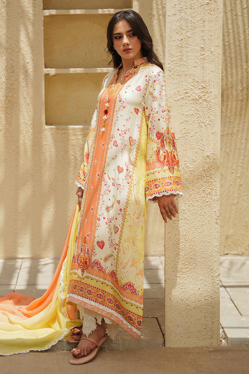 An exquisite ivory printed kurta crafted in pure rawsilk, beautifully featuring a vibrant play of coral, lime, and green hues for a refreshing statement. The intricate print is delicately enhanced with shimmering mirror work, traditional gota kinari, pearls, and fine resham detailing, adding depth and elegance to every detail. Paired with offwhite pants, this ensemble is completed with a graceful two-toned tissue silk dupatta finished with delicate lace, creating the perfect blend of festive charm and timeless sophistication. Model is wearing an add on slip