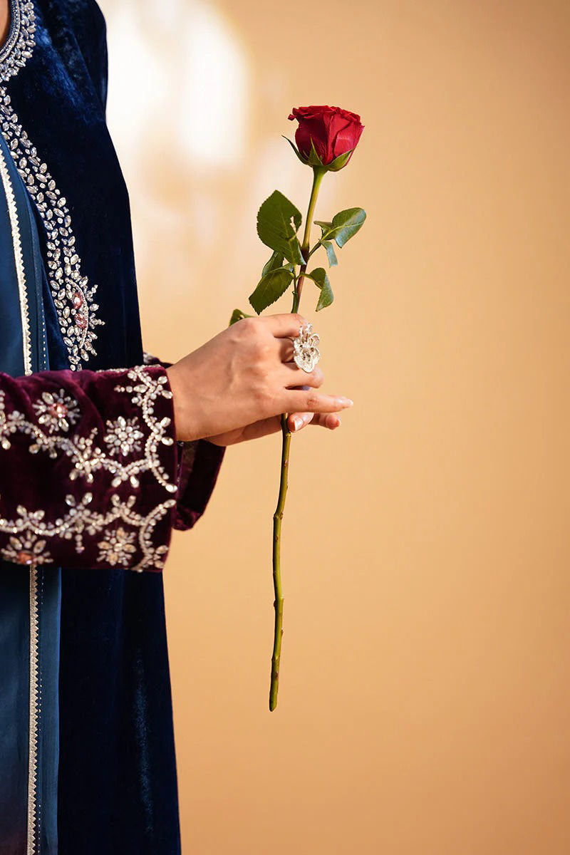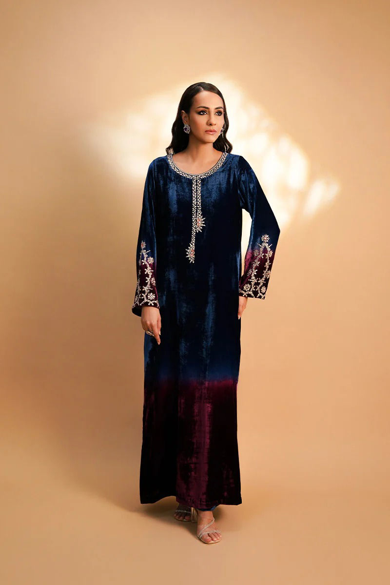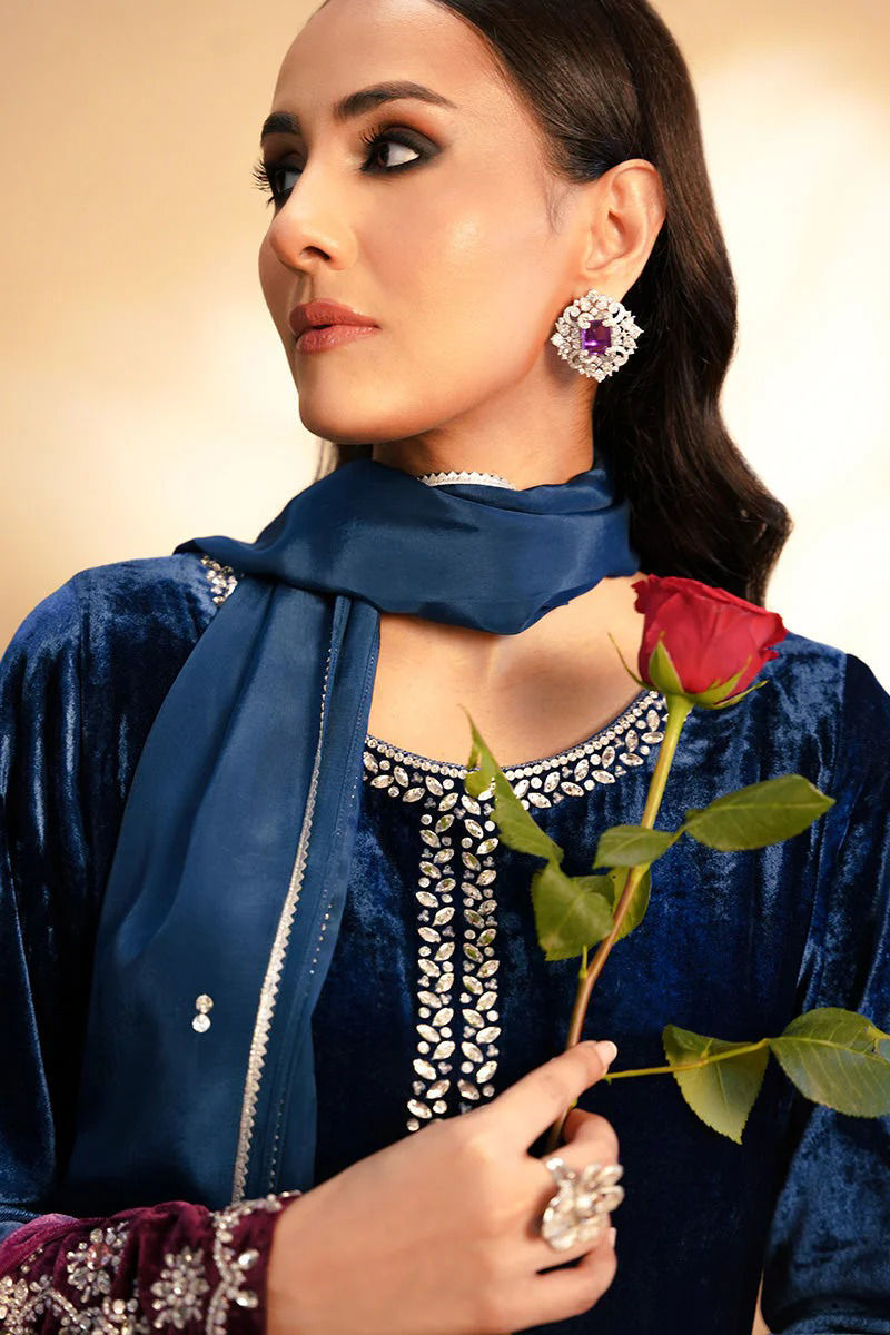 Embrace opulence with this stunning velvet outfit in an ombre of deep blue and plum, crafted to exude elegance and grace. This ensemble features exquisite handwork with crystal and swarvoski details on the neckline and sleeves.Paired with a wide width pants , this outfit offers a flattering silhouette that moves with fluidity. The ensemble is completed with chan on tissue silk dupatta. Pair it up with your sparkly heels and diamond earrings to turn heads around. You can flaunt it year round by converting it into silk.