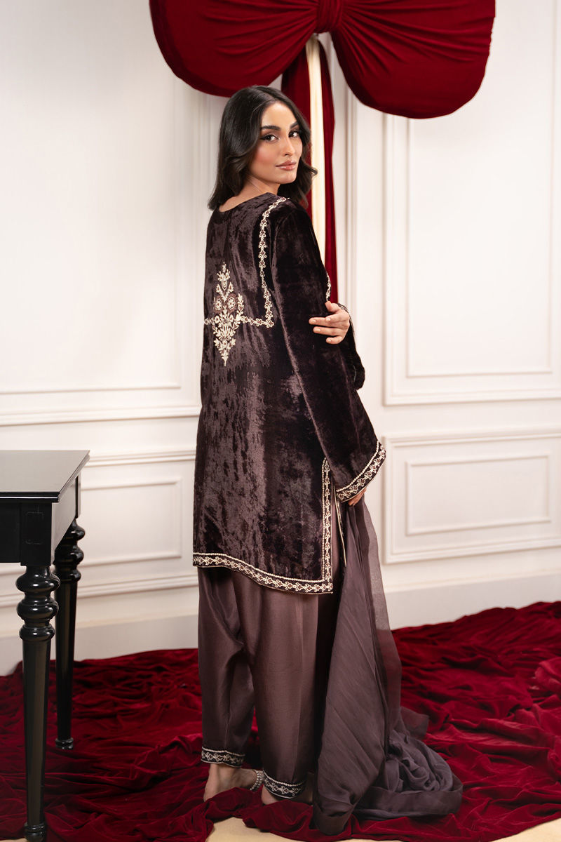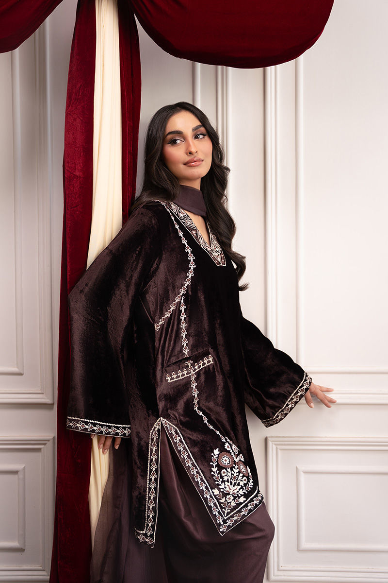 A choco brown velvet shirt adorned with delicate aari embroidery and functional side pockets, paired with a pure raw silk shalwar featuring intricate aari work on the hem. The look is completed with a silk dupatta finished with organza detailing, creating a refined ensemble that exudes understated luxury.Shirt Length: 34''Model Height: 5'5