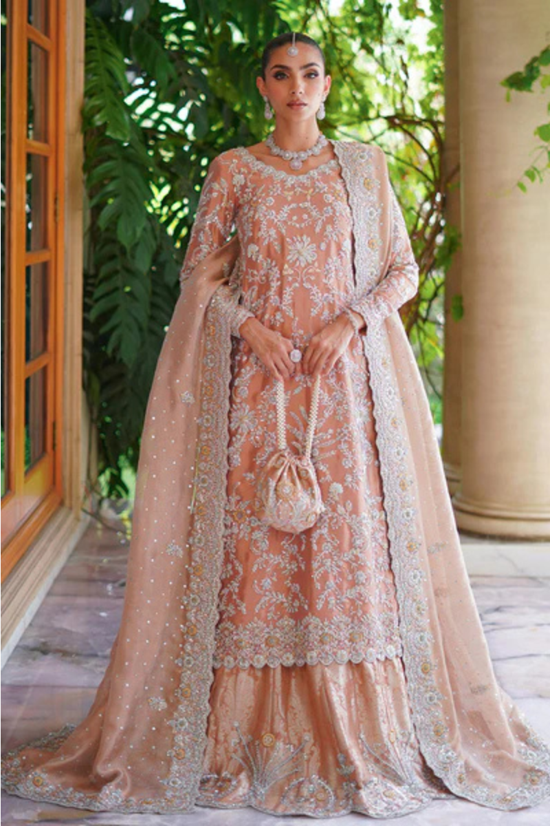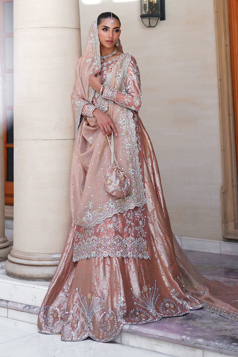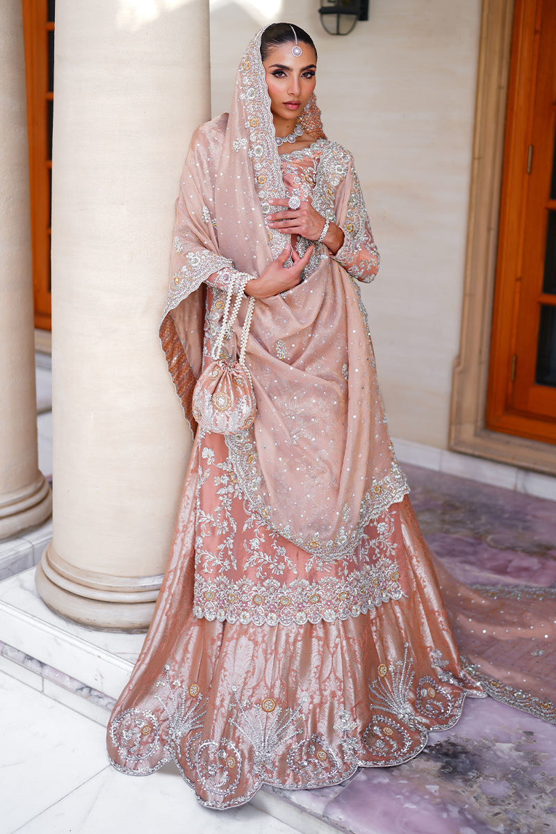 Radiating regal grace, this coral-pink bridal ensemble is crafted from the finest fabrics a pure tissue shirt, paired with a voluminous pure jamawar lehenga, and a flowing pure zari net dupatta. The outfit is adorned with exquisite silver handwork of dabka, Swarovski stones, and sitara, kissed with delicate touches of gold tilla for a subtle warmth. A matching hand-embellished pouch accompanies the outfit as a graceful add-on, completing the look with refined charm. This bridal masterpiece embodies timeless grandeur with contemporary finesse.