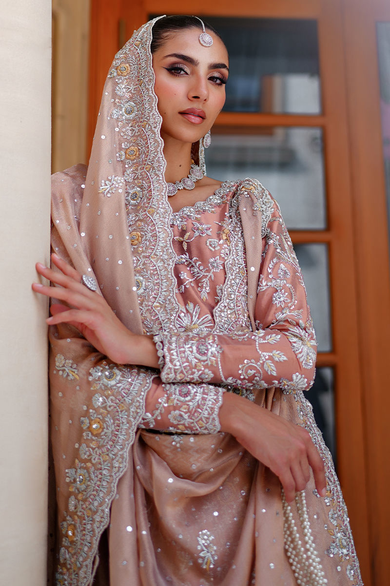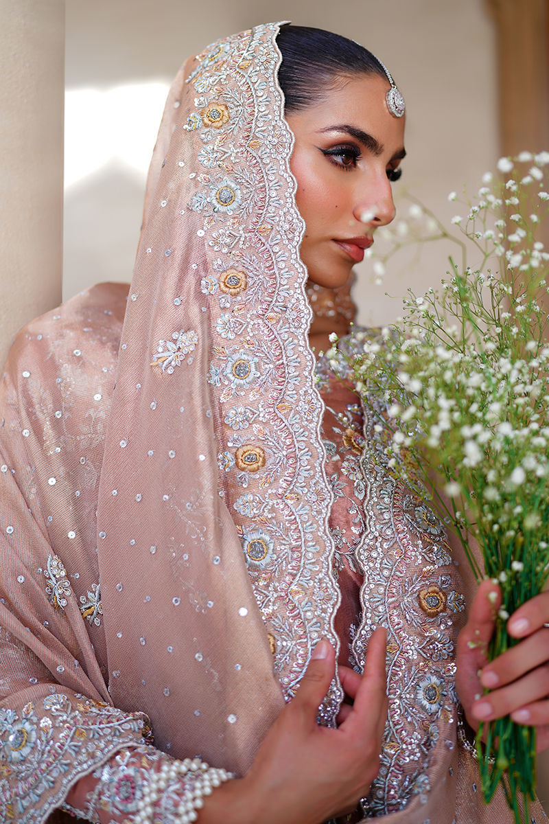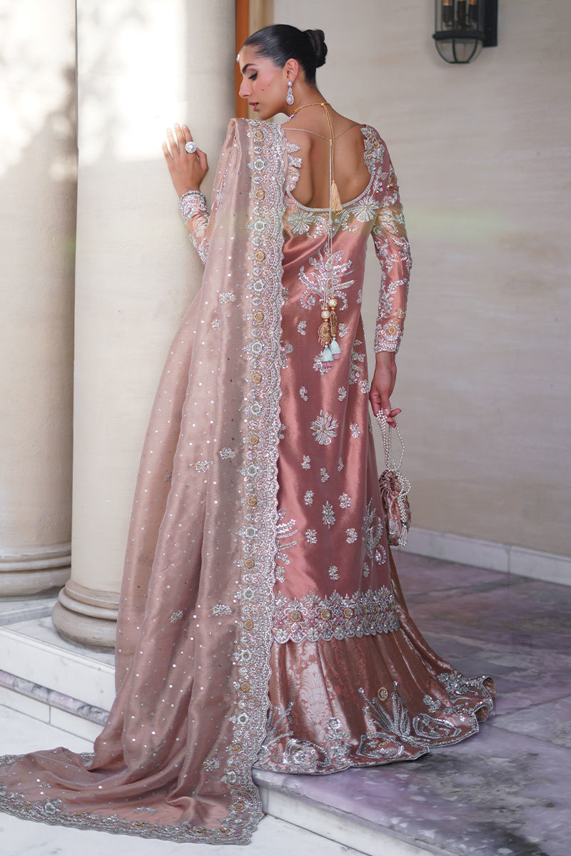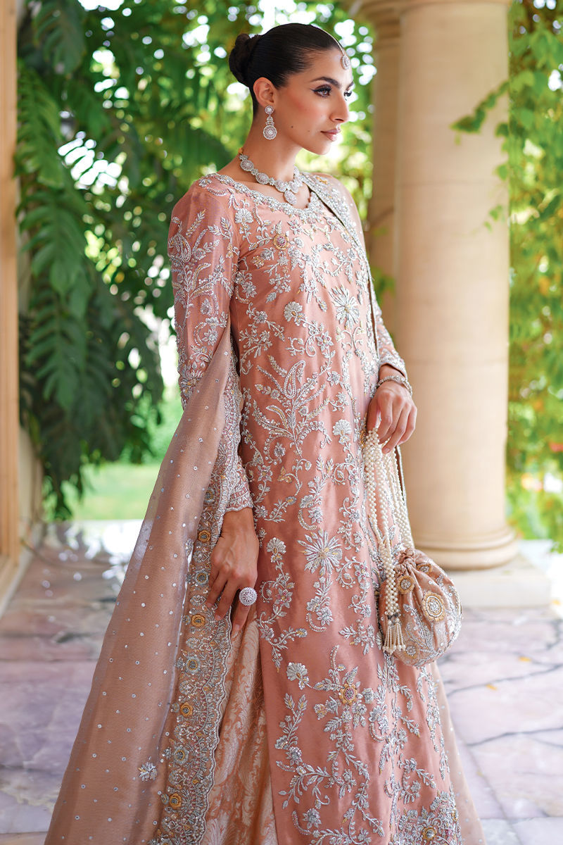 Radiating regal grace, this coral-pink bridal ensemble is crafted from the finest fabrics a pure tissue shirt, paired with a voluminous pure jamawar lehenga, and a flowing pure zari net dupatta. The outfit is adorned with exquisite silver handwork of dabka, Swarovski stones, and sitara, kissed with delicate touches of gold tilla for a subtle warmth. A matching hand-embellished pouch accompanies the outfit as a graceful add-on, completing the look with refined charm. This bridal masterpiece embodies timeless grandeur with contemporary finesse.