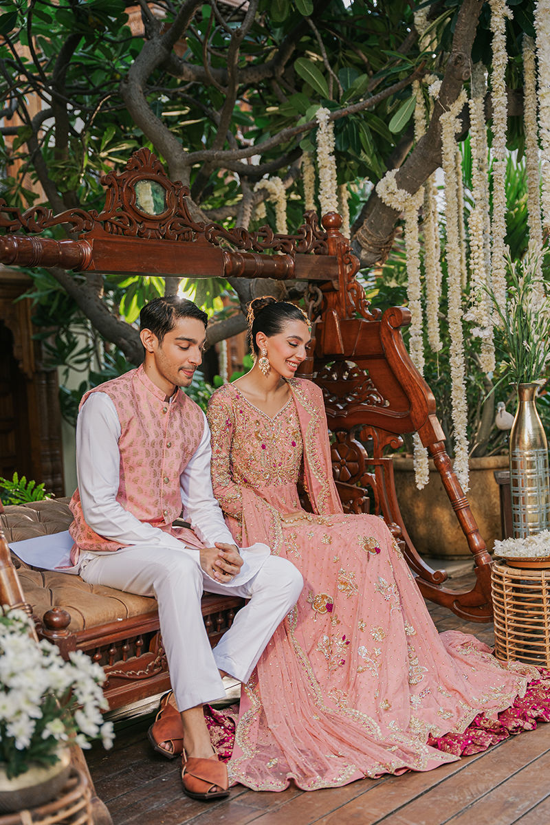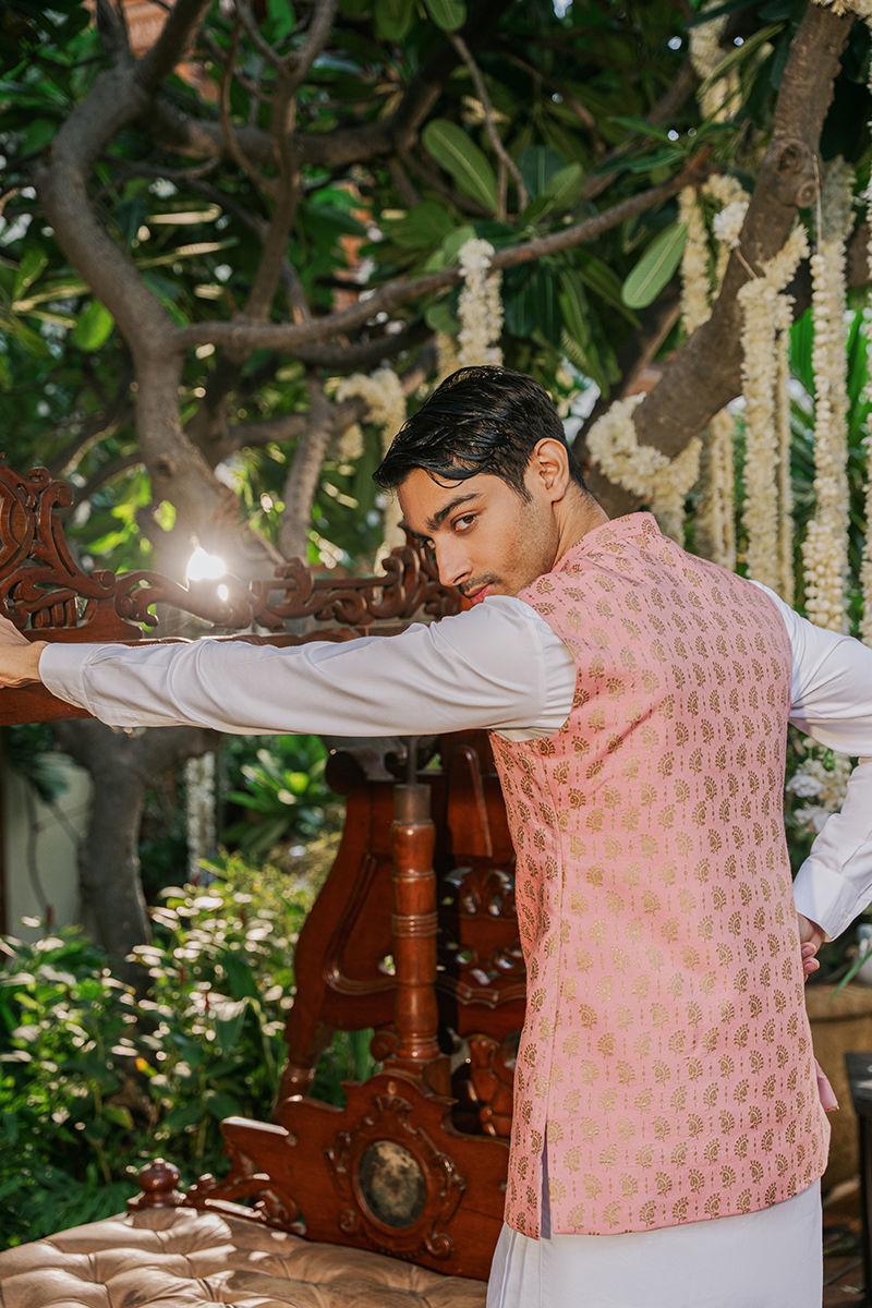 This classic ensemble features a kurta and pajama set tailored from rich cotton fabric, ensuring both comfort and sophistication. The kurta is designed with a timeless cut, offering a refined yet relaxed fit that is perfect for a variety of occasions. To add a touch of modern style, the outfit is paired with a cool pink-toned screen-printed waist coat. The waist coat is crafted from high-quality fabric that features an intricate screen print, introducing a contemporary flair to the classic kurta and pajama set. Choose classic loafers or dress shoes in a neutral shade, such as beige or brown, to complement the rich cotton fabric of the kurta and pajama.