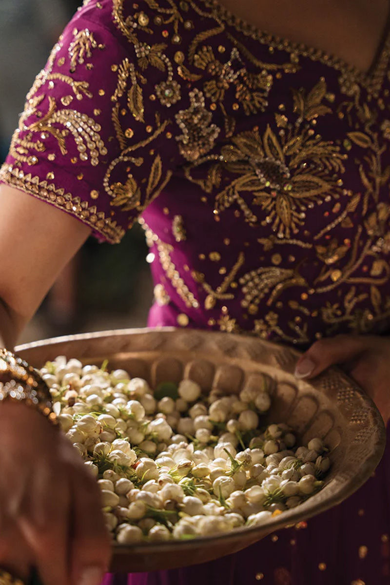 Ananya: This stunning magenta net pishwas combines elegance and grandeur with its captivating design and intricate detailing. It is lavishly adorned with zardozi work, meticulously applied to create elaborate patterns and designs that exude opulence. The screen printed lehenga, paired with the pishwas, is designed to complement its grandeur. It features a paneled construction with delicate gota dori detailing along the panels, creating a cohesive and elegant look. The dupatta contrasts beautifully with the magenta pishwas, featuring a rich combination of green, mint, and gold tones. It is adorned with intricate block print patterns that add depth and texture, creating a visually stunning contrast with the solid magenta of the pishwas. This magenta net pishwas, with its intricate zardozi work and contrasting dupatta, creates a striking and sophisticated look that is perfect for any grand occasion. Lehenga: Kattan silk Shirt: Net Dupatta: Organza