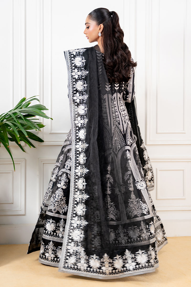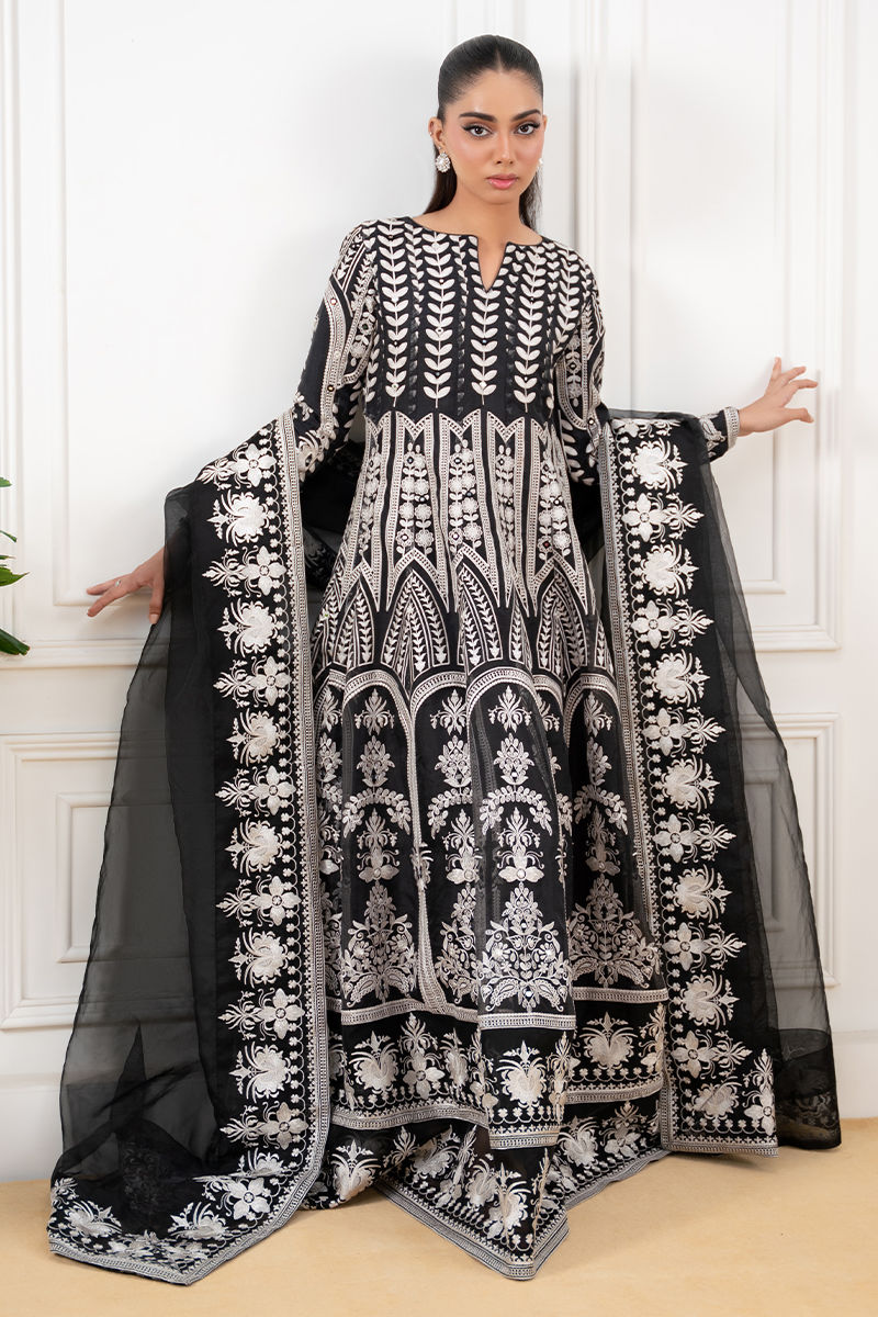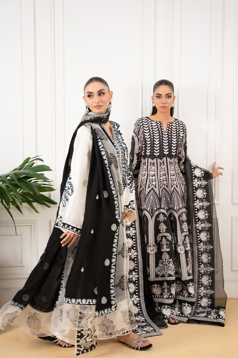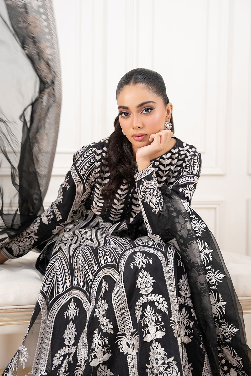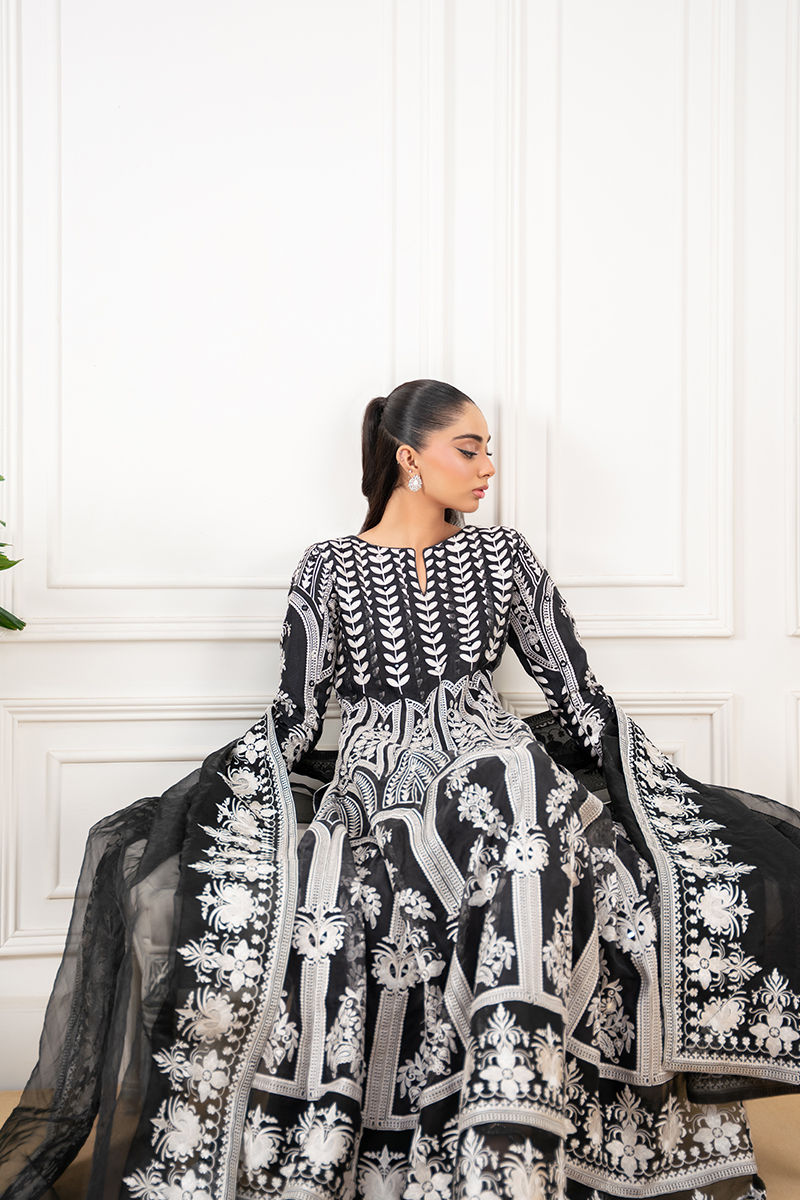 A timeless black organza pishwas, intricately adorned with delicate ivory-toned embroidery and shimmering shisha work, exuding elegance with every detail. The flowing silhouette is complemented by a sheer organza dupatta, finished with finely embroidered borders that add a touch of grace. Paired with sleek silk pants, this ensemble is a perfect blend of classic charm and refined sophistication.