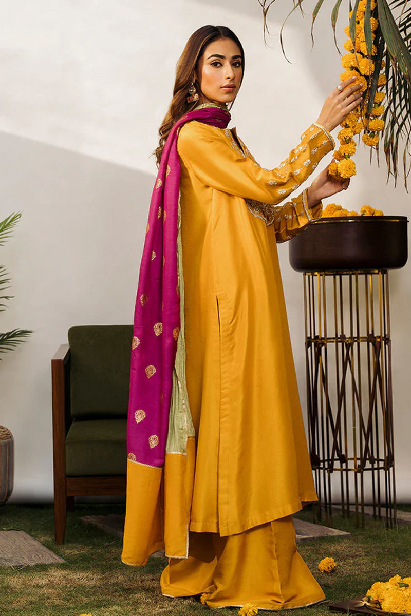 Just wow! Festivities all year around in this marigold pure rawsilk shirt with intricate hand worked of pearls, Gota, stones and dabka. Complimenting dupatta on silk is an art where pista green crushed is merged with magenta and gold screw print. The marigold in the dupatta brings everything together. Festive in-house tassels at the back is no less…. And is giving dholki/mayun vibe. Pure Rawsilk Pants/ Dhaka comes as Add On Shirt: Raw Silk Dupatta: Raw Silk