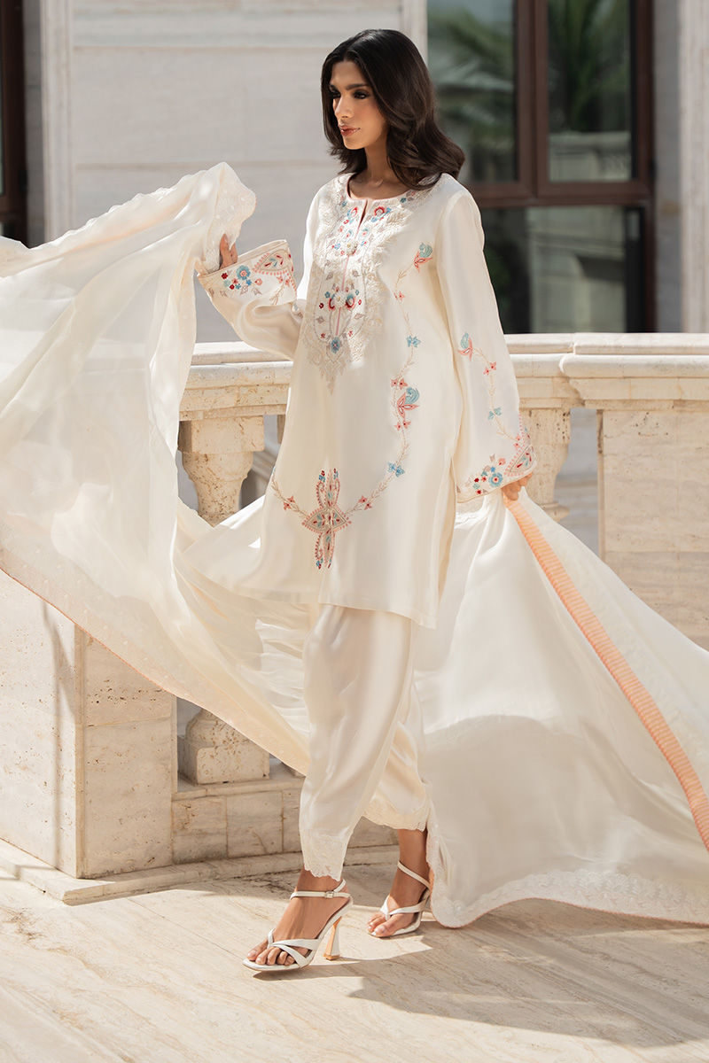 An elegant ivory sheesha silk set featuring a chic short shirt paired with a classic shalwar, designed for timeless festive appeal. The shirt is beautifully adorned with embroidery in soft yet popping tones, creating a refined contrast against the ivory base, while the shalwar is finished with a delicately embroidered hem for added detail. Completing the look is a luxurious silk dupatta, accented with subtle pink piping and an embroidered border lace that adds a graceful hint of color. Model is wearing 34" Length.A