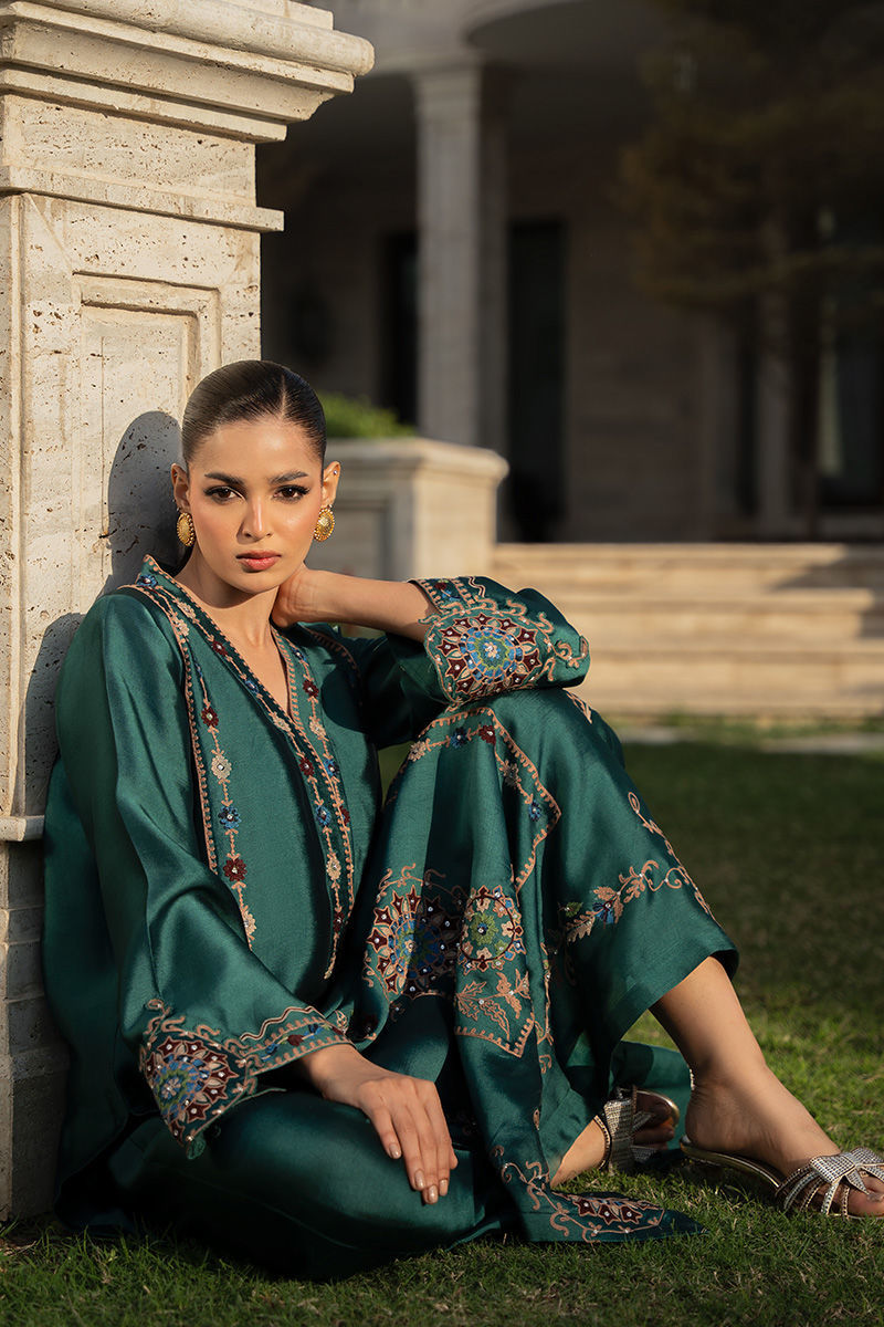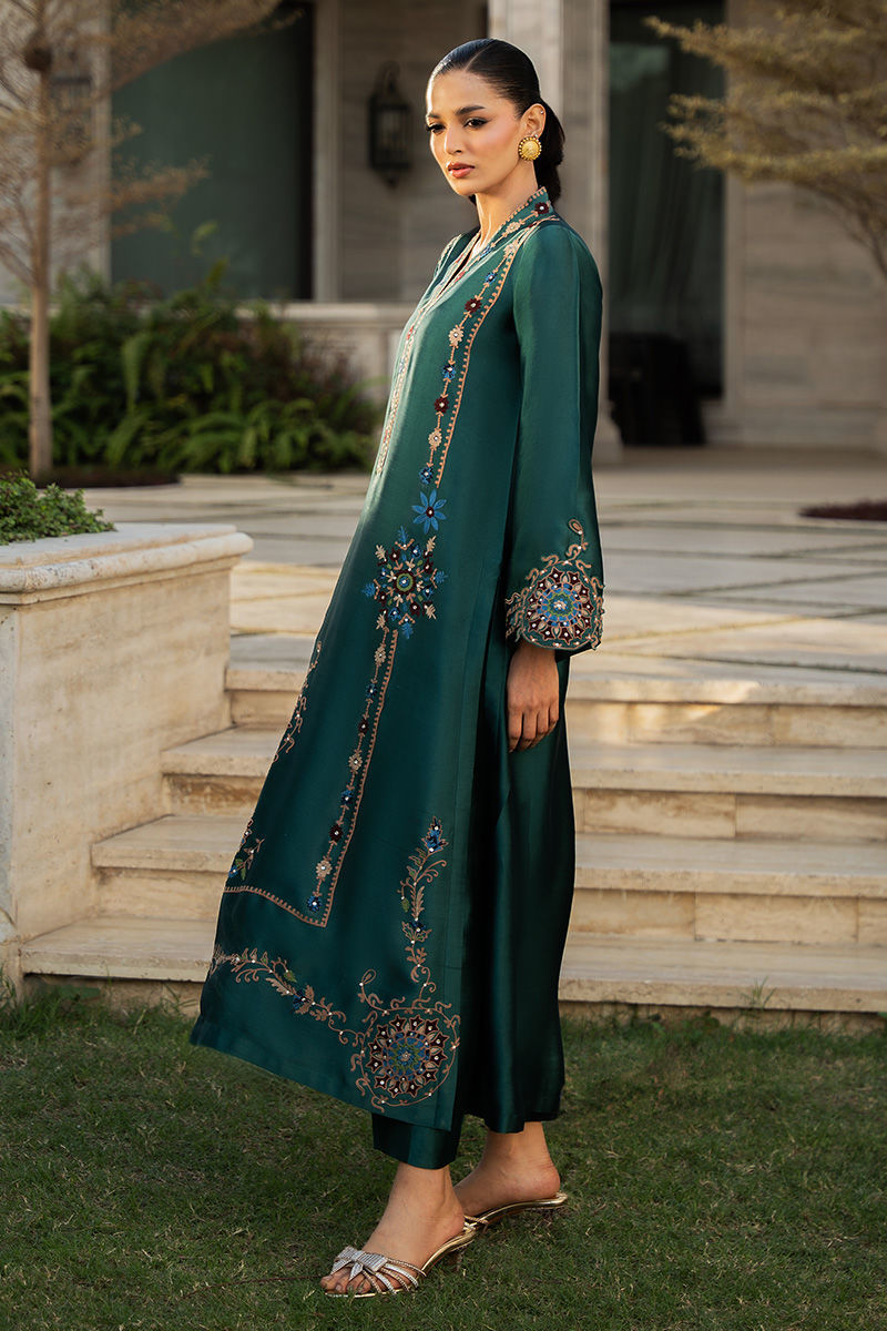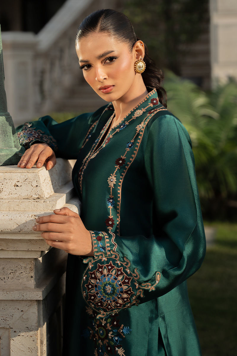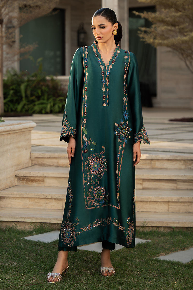 A rich green sheesha silk shirt adorned with intricate aari embroidery in warm tones of maroon, brown, and ivory, accentuated with sparkling Swarovski crystals. The sleeves feature a striking cutout bohemian aari motif, adding a playful yet elegant touch. Paired with straight pants for a complete, refined look. Model is wearing 52" Length