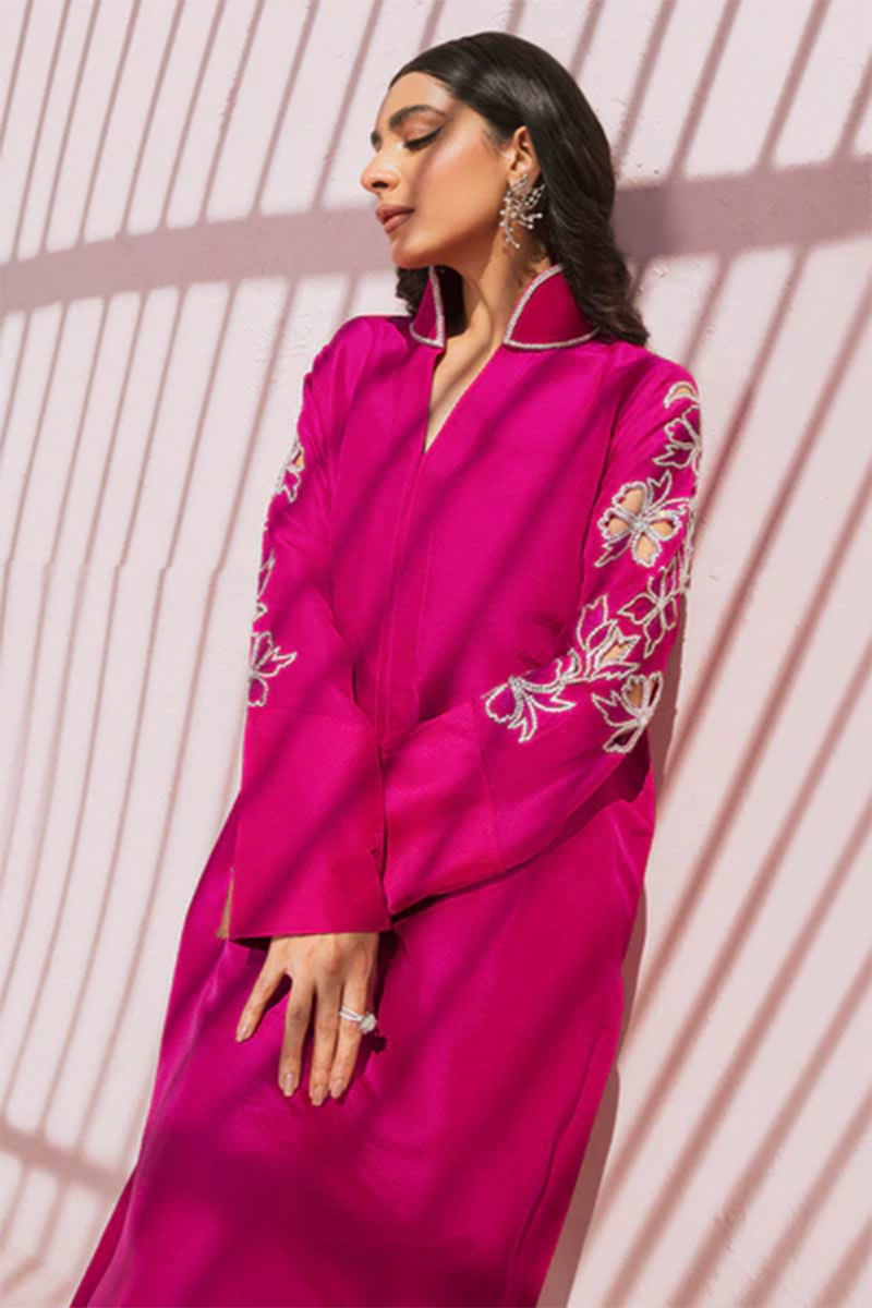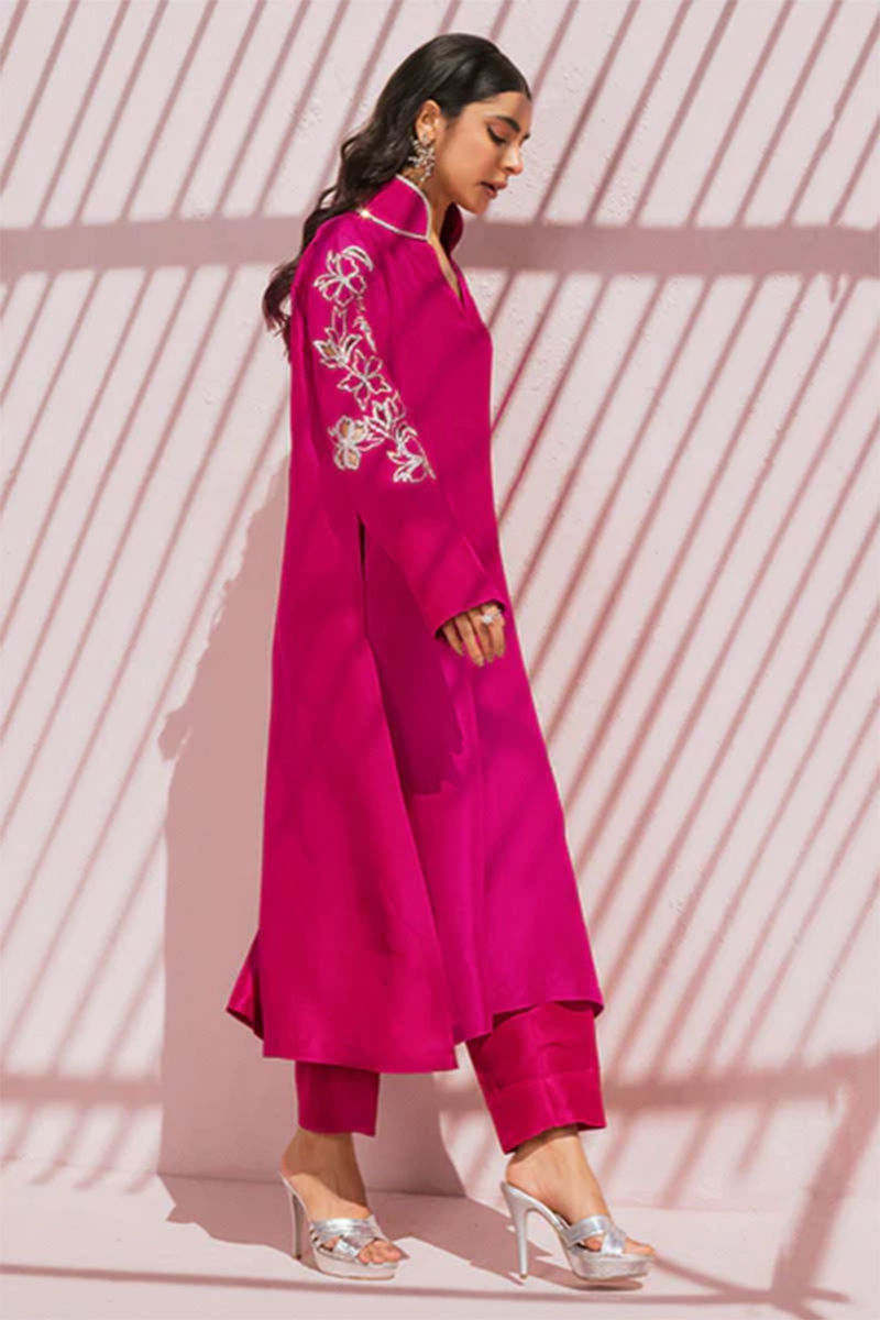 A Forever Flattering Silhouette cut from pure raw silk in the hottest shade of pink! Fully handworked sleeves with Swarovski Crystals and cutwork details are enough to turn heads around !! Walk around with confidence! Less is more!Shirt: Raw SilkPant: Raw Silk