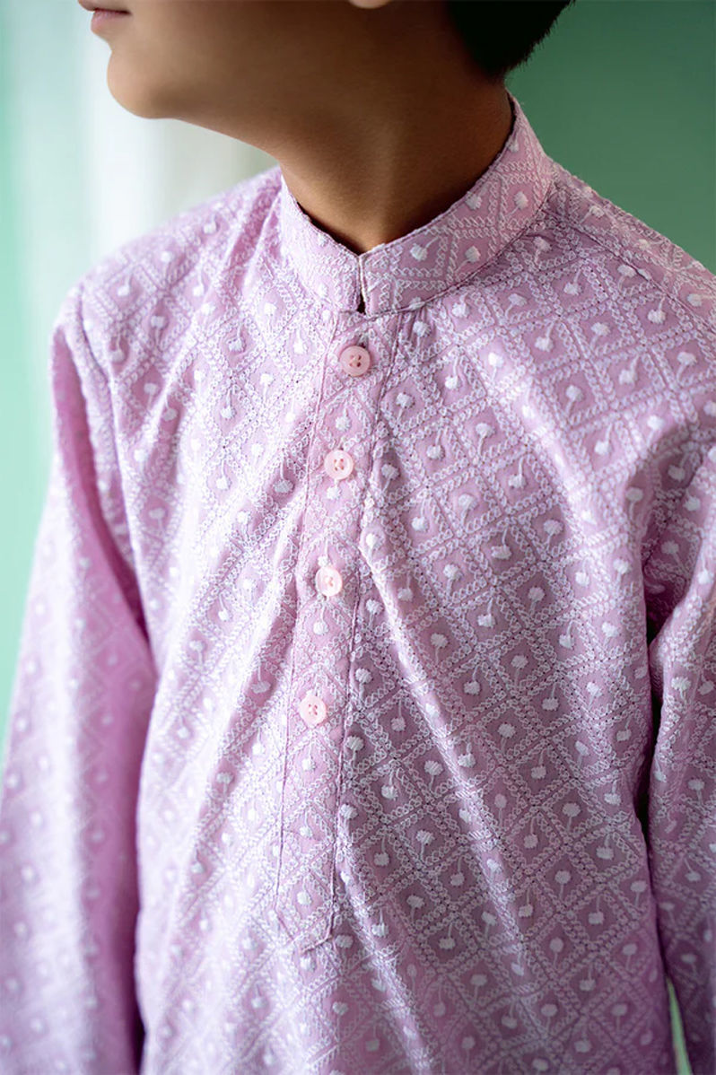 A refined boy's kurta made from soft Schiffli fabric in a calming lavender shade, combining traditional craftsmanship with contemporary style. The delicate Schiffli embroidery adds a touch of texture and elegance to the kurta, with its signature open-thread design that creates a light, airy effect. The kurta features a relaxed yet tailored fit, offering comfort without compromising on style. The subtle lavender color gives the outfit a fresh, understated look, perfect for casual or semi-formal events. Paired with crisp white cotton pants, this ensemble creates a balanced and harmonious contrast, offering a clean, polished appearance. Shirt length: 25" , Model height : 3'8