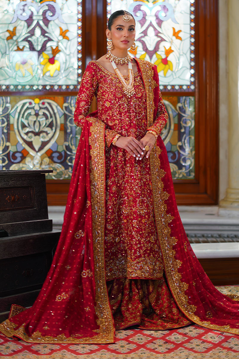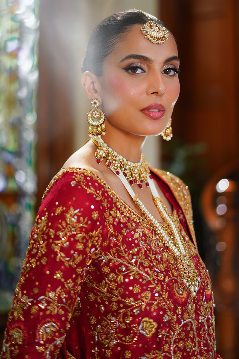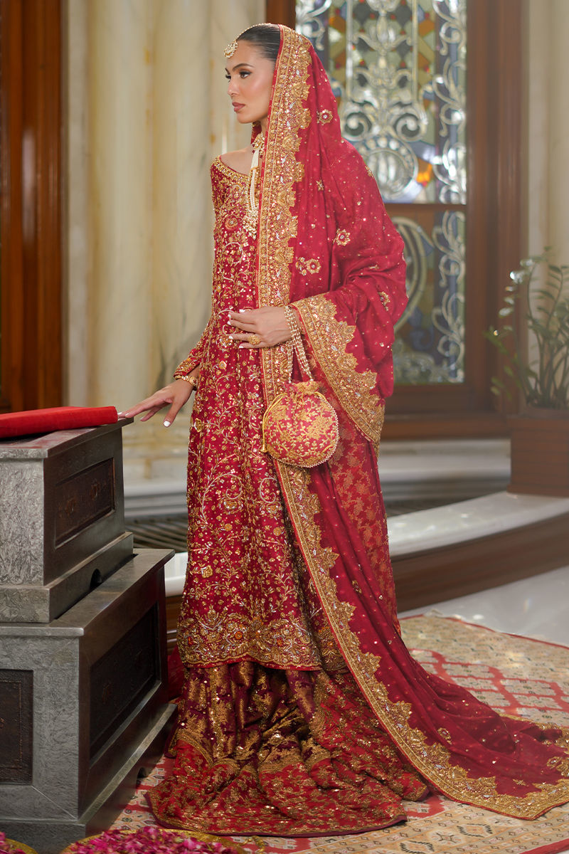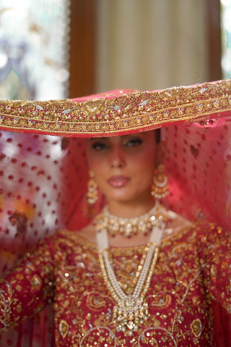 An ode to classic bridal grandeur, this red ensemble is meticulously handcrafted to perfection. The pure cotton net shirt and dupatta are richly adorned with gold dabka embroidery, forming an intricate floral jaal layout enhanced with sitara, moti, stones, and resham detailing. Paired with a voluminous pure jamawar lehenga in contrasting tones of red and maroon, the look exudes depth and royal opulence. A hand-worked pouch completes the set, adding a graceful finishing touch. This bridal masterpiece blends timeless tradition with refined artistry, making it a true heirloom piece.