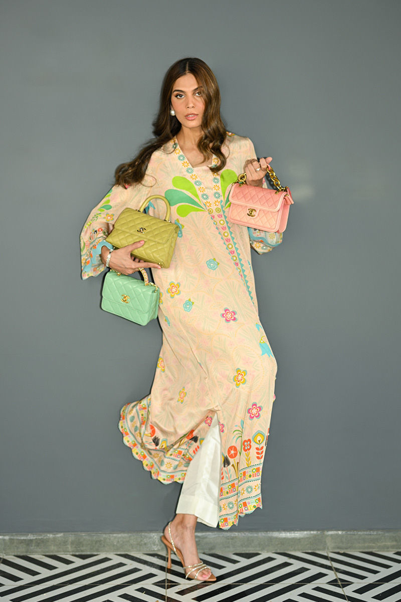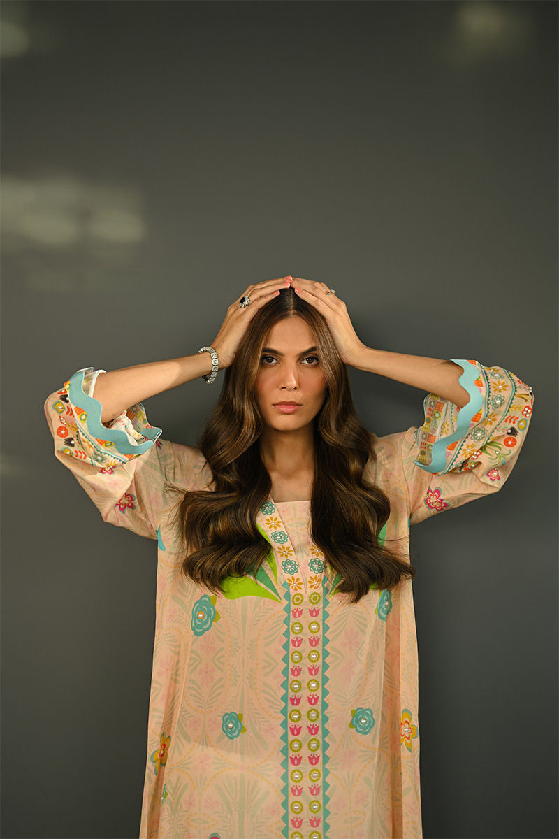 This peach pure crepe printed loose fit shirt features a delicate floral pattern that adds a soft, feminine touch to your wardrobe. The warm peach hue is complemented by subtle, yet vibrant flowers and leaf motives. Its relaxed, flowing silhouette offers both comfort and style, making it perfect for casual days or laid-back outings. The breathable fabric ensures you stay cool, while the soft color and floral print bring a refreshing, effortless vibe to your summer wardrobe. Pants are an add on. Shirt maximum length 56 Model height 5'11 Shirt: Pure Crepe Pant: Pure Raw Silk