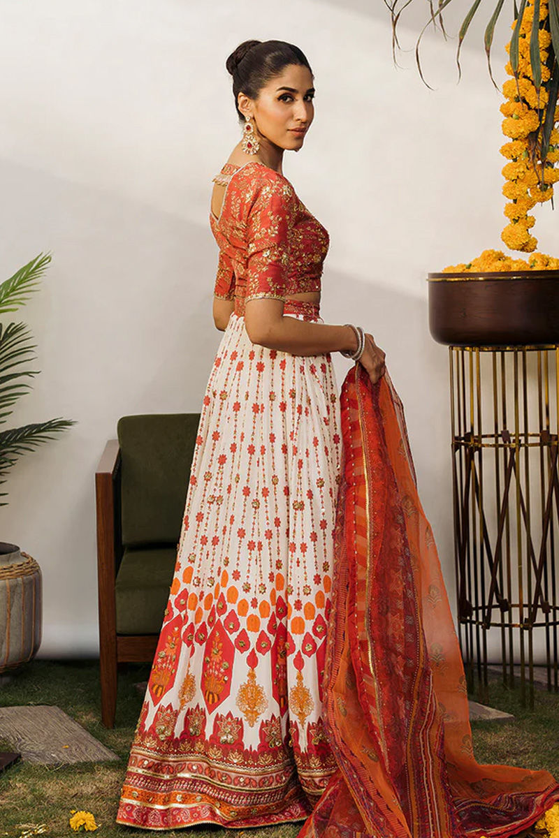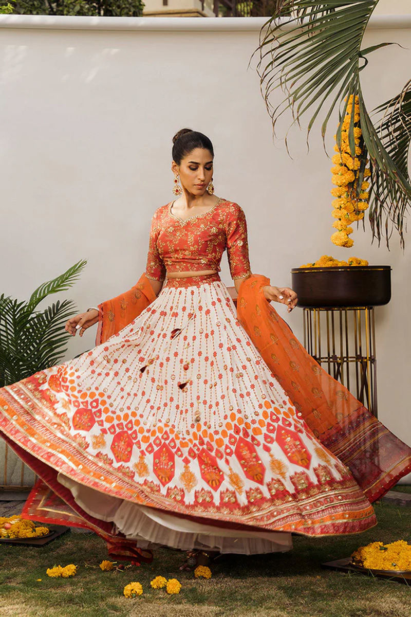 We can’t take our eyes off this lehnga choli on pure raw silk Geometric and floral prints on a flowy lehnga and classic choli. Playful Gota on lehnga is sprayed all over to create an impact and intricate tassles adds that ethnic vibe. Choli is also an all Gota worker with hand embellishments of kora dabka and resham. Printed organza dupattta is as exciting as the lehnga choli which compliments the whole look. This season rep this on mehndis, dholkis and mayuns. Lehenga: Raw SilkRaw Silk Choli: Raw Silk Dupatta: Raw Silk