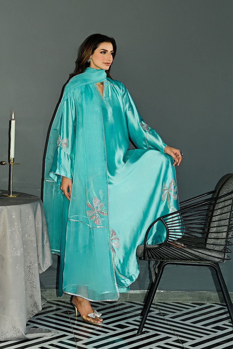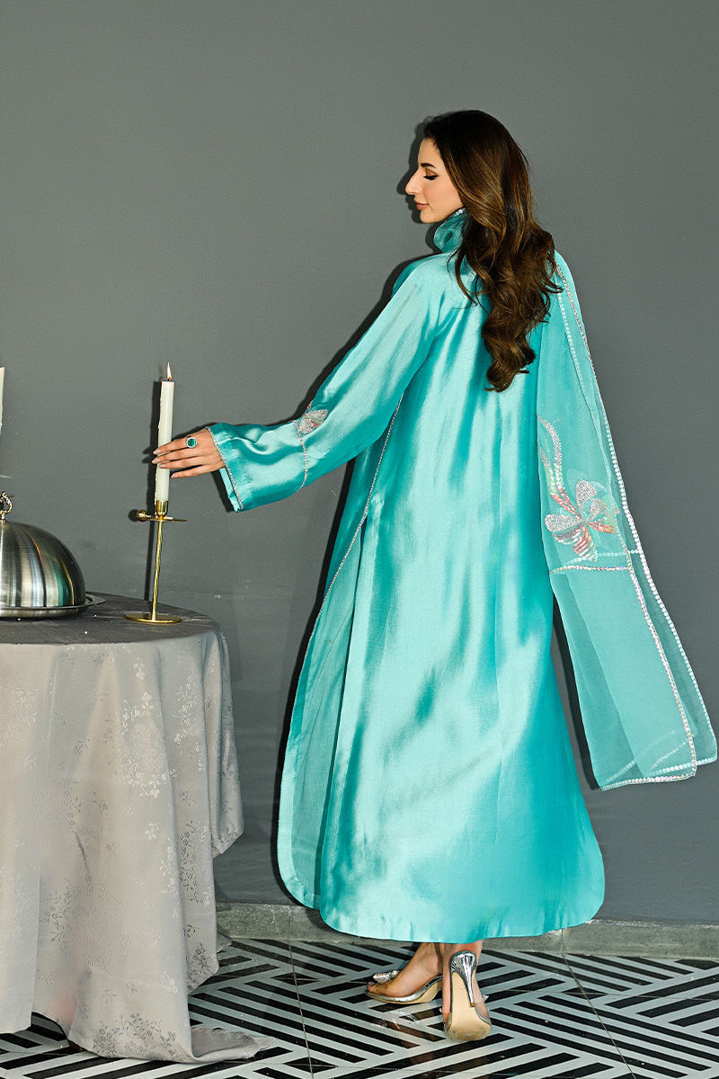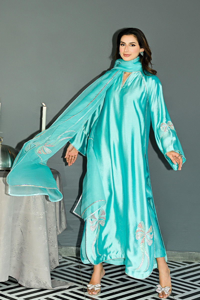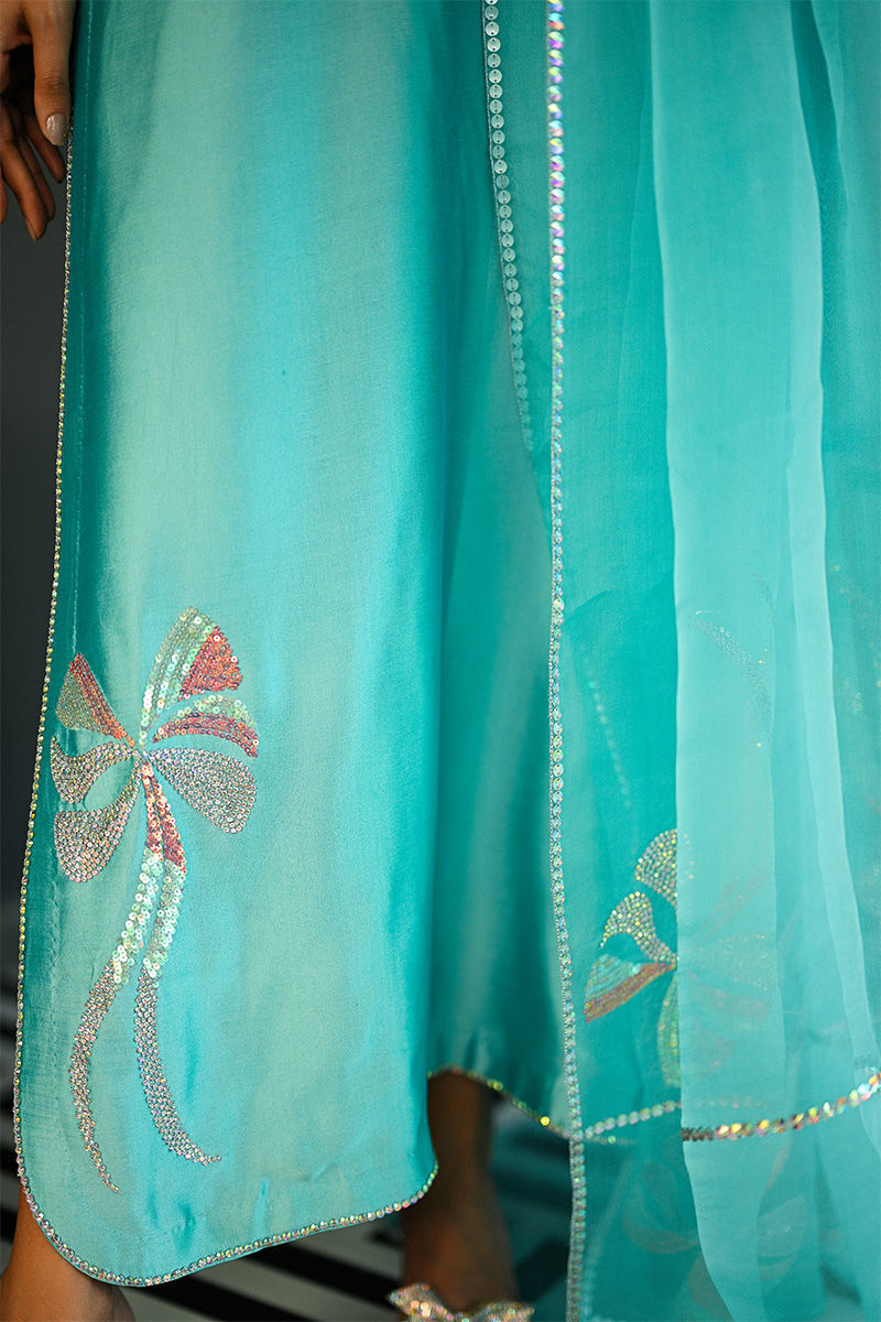 This captivating turquoise sheesha silk shirt and pant set features a unique round hem and striking halter sleeve cuts, offering a blend of modern design and traditional elegance. The shirt is intricately adorned with Swarovski crystals, adding a touch of sparkle and luxury to the fabric. Hand-embellished bows grace the hem and sleeves, creating a delicate, feminine touch that enhances the overall charm of the piece. Paired with this stunning shirt is a soft organza duppatta, beautifully embellished with matching Swarovski crystal bows, tying the look together with grace and sophistication. This ensemble is perfect for someone looking to make a statement with a perfect balance of glamour and refinement. Duppata is an add on. Shirt maximum length 55Model height 5"9