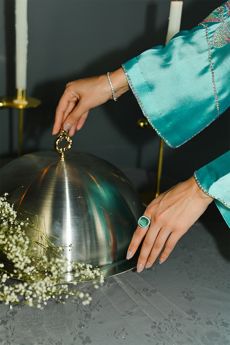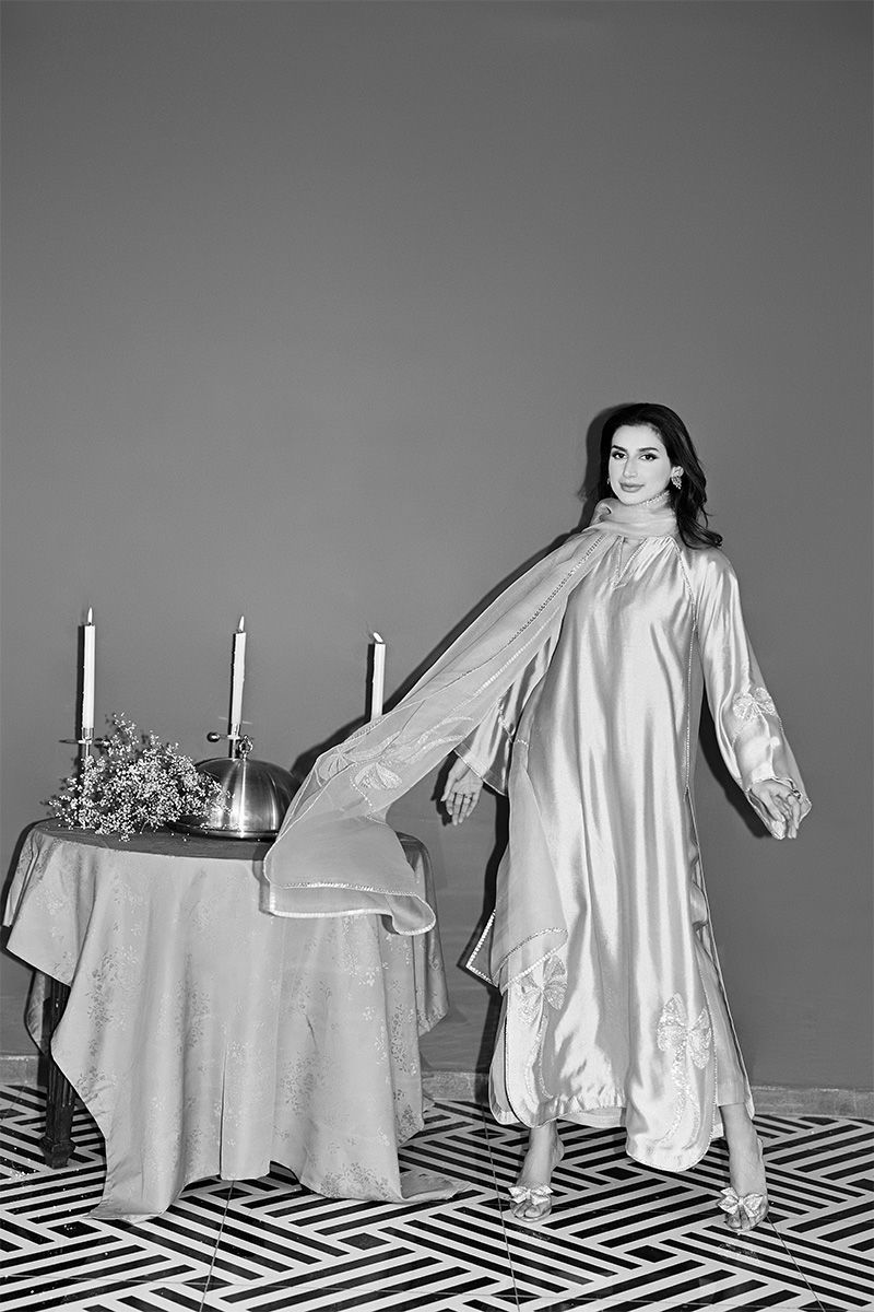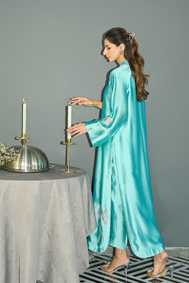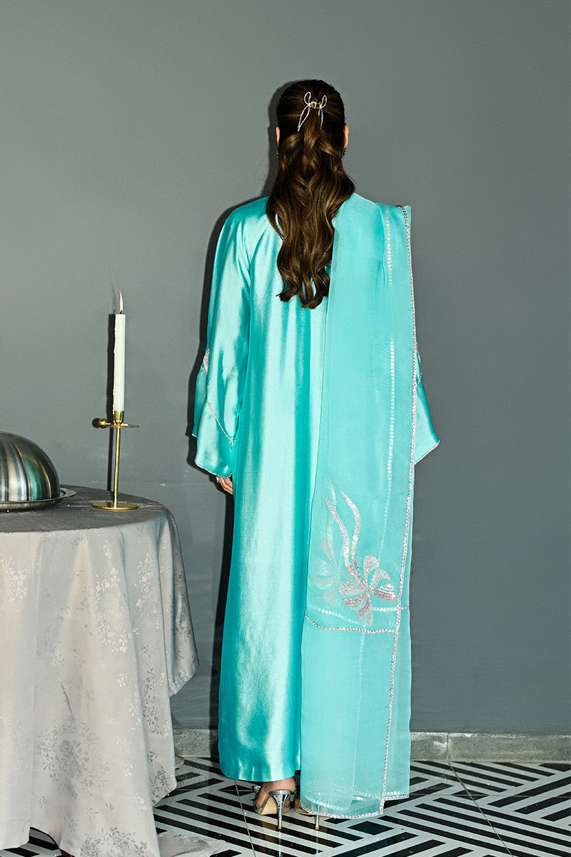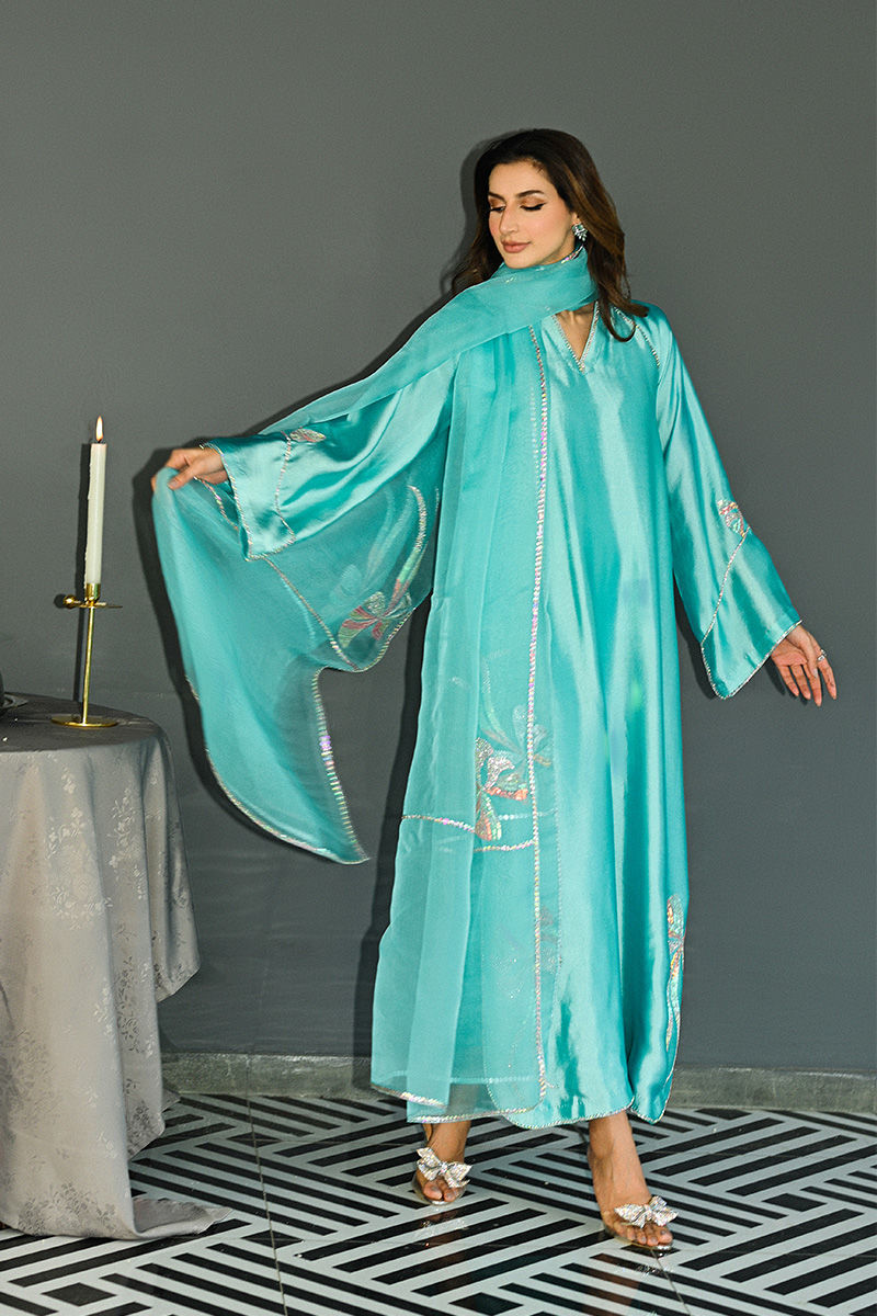 This captivating turquoise sheesha silk shirt and pant set features a unique round hem and striking halter sleeve cuts, offering a blend of modern design and traditional elegance. The shirt is intricately adorned with Swarovski crystals, adding a touch of sparkle and luxury to the fabric. Hand-embellished bows grace the hem and sleeves, creating a delicate, feminine touch that enhances the overall charm of the piece. Paired with this stunning shirt is a soft organza duppatta, beautifully embellished with matching Swarovski crystal bows, tying the look together with grace and sophistication. This ensemble is perfect for someone looking to make a statement with a perfect balance of glamour and refinement. Duppata is an add on. Shirt maximum length 55Model height 5"9