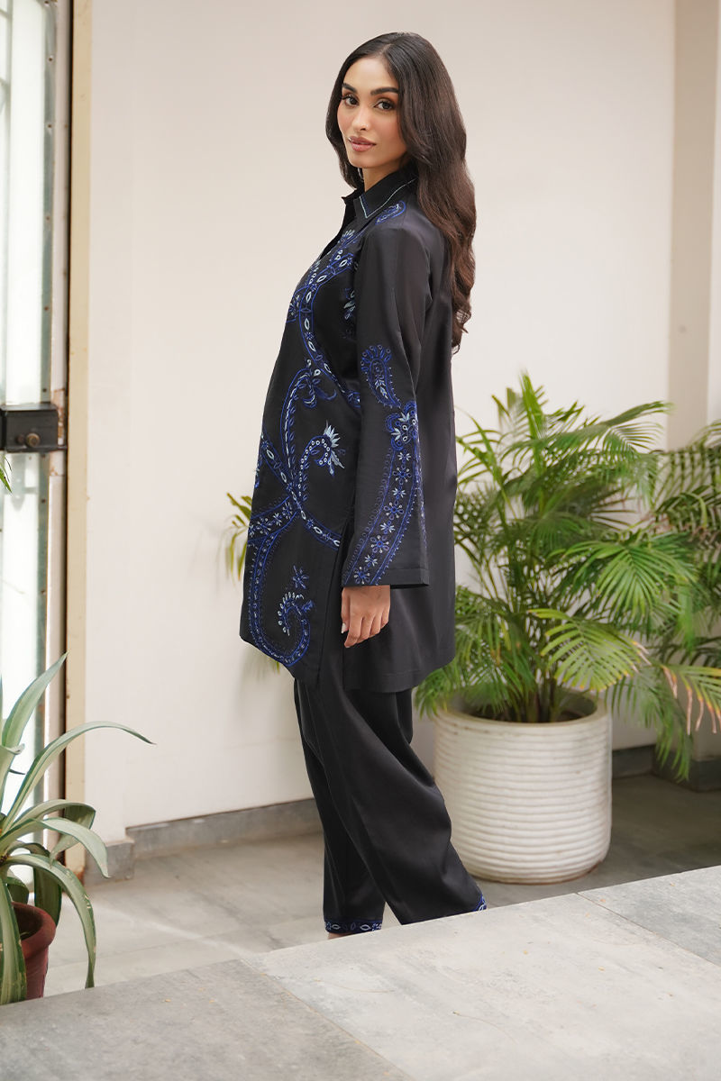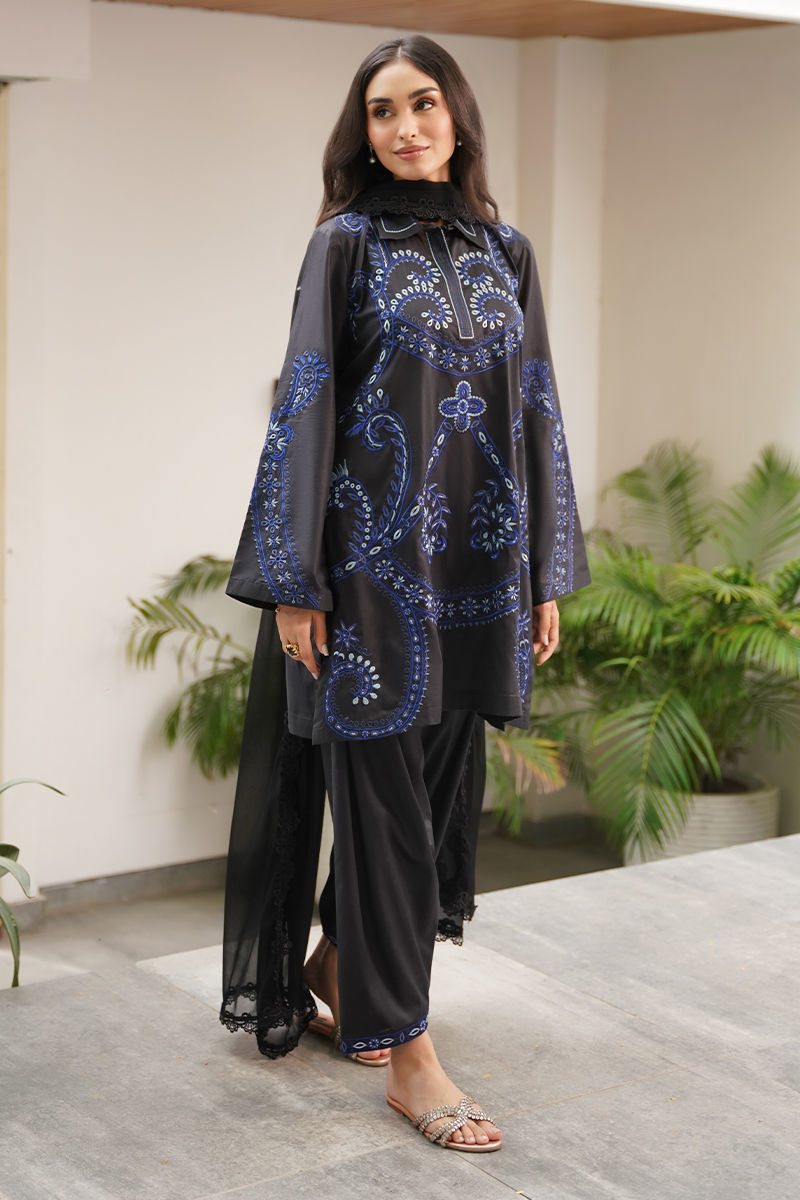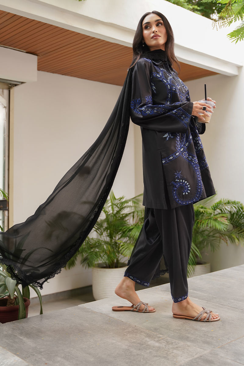 Striking and sophisticated, this black shirt and shalwar set exudes modern elegance. Tailored in a sleek silhouette, the shirt features a smart collar and is adorned with contemporary embroidery in vivid shades of blue — adding a bold, artistic contrast to the deep black base. Paired with a classic shalwar and available with a flowing black chiffon dupatta as an add-on, this ensemble transitions effortlessly from day to evening with refined style. maximum shirt length:33 Model height:5'5