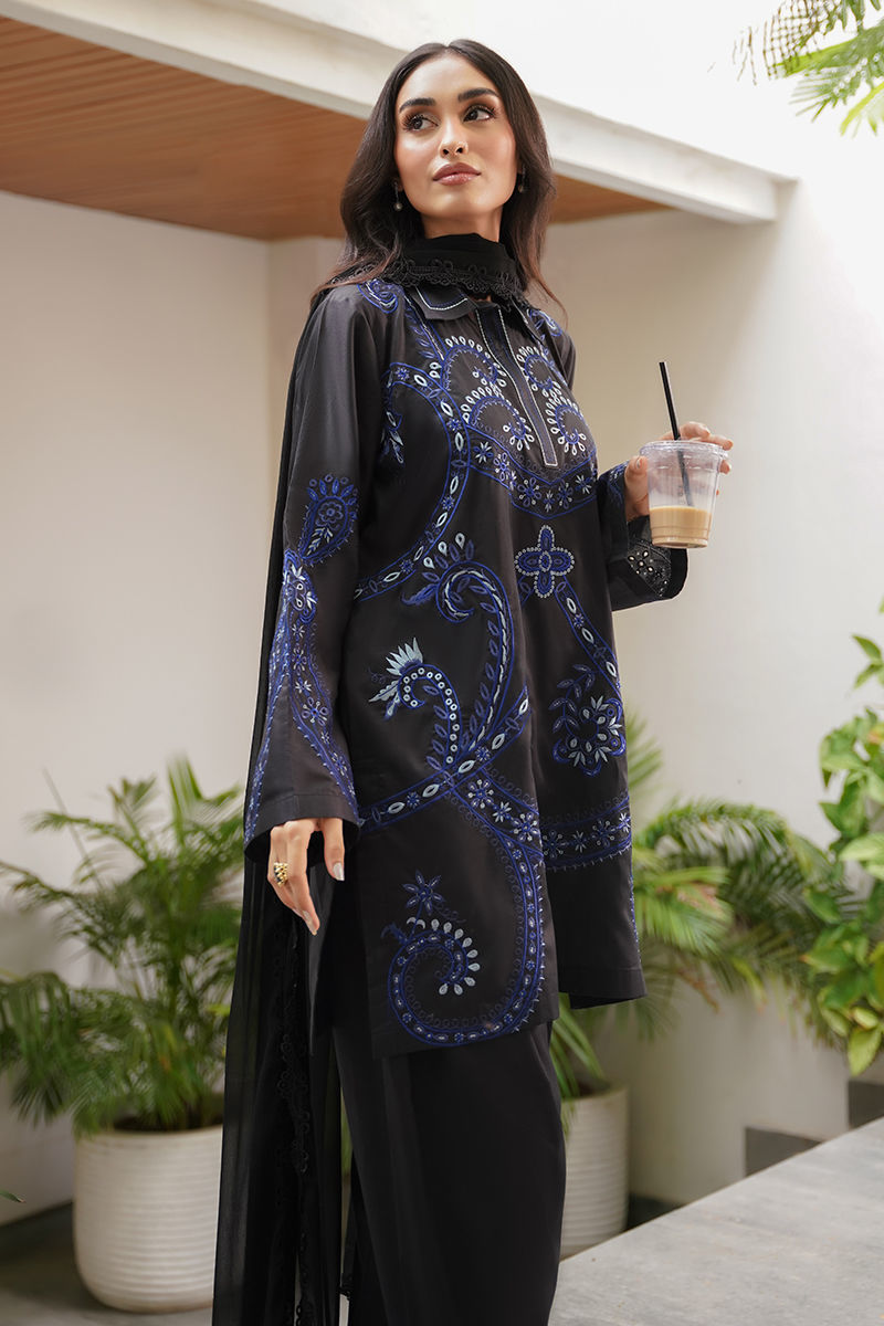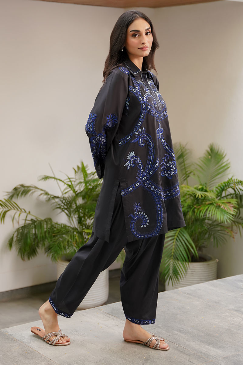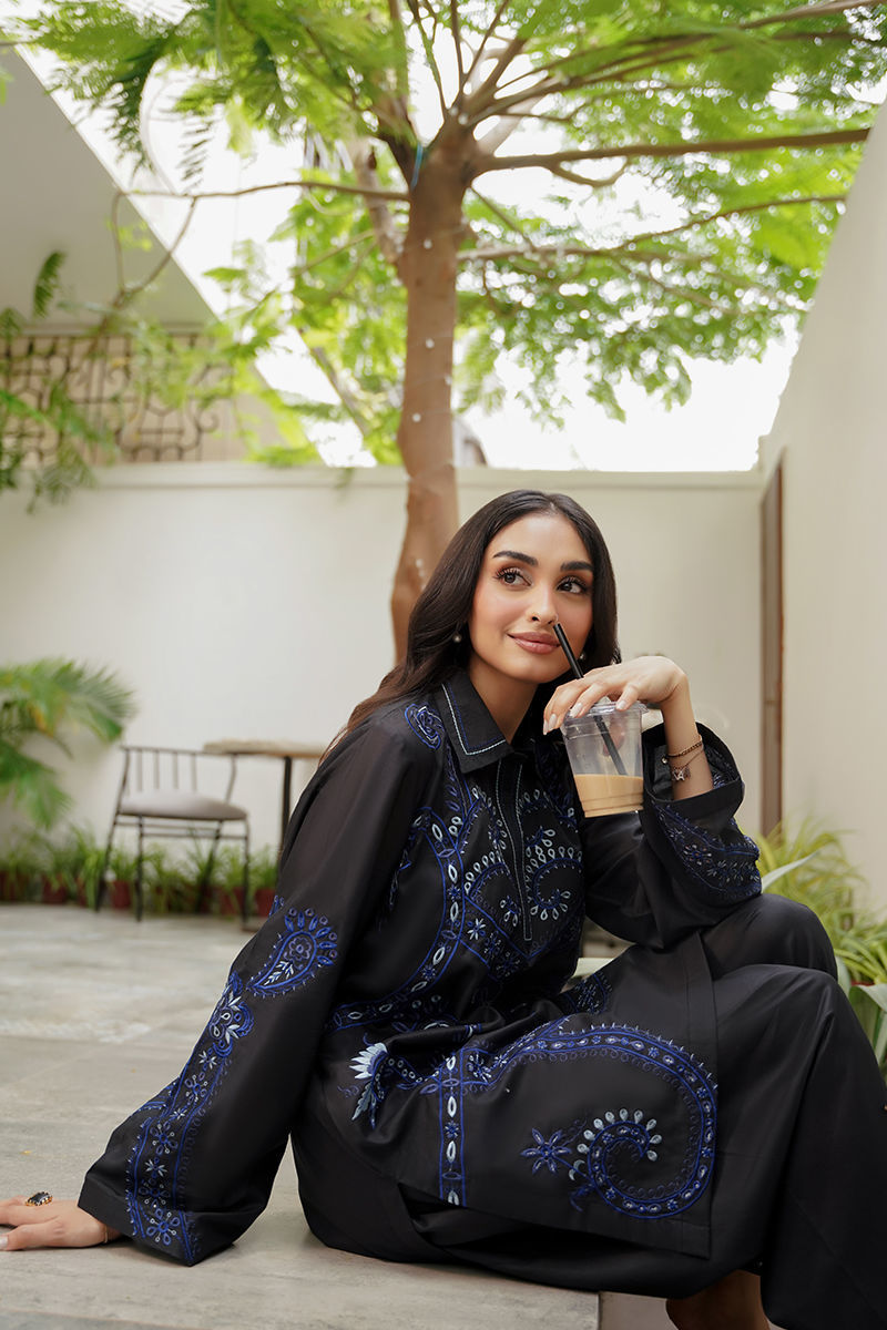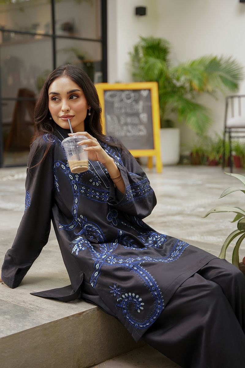 Striking and sophisticated, this black shirt and shalwar set exudes modern elegance. Tailored in a sleek silhouette, the shirt features a smart collar and is adorned with contemporary embroidery in vivid shades of blue — adding a bold, artistic contrast to the deep black base. Paired with a classic shalwar and available with a flowing black chiffon dupatta as an add-on, this ensemble transitions effortlessly from day to evening with refined style. maximum shirt length:33 Model height:5'5