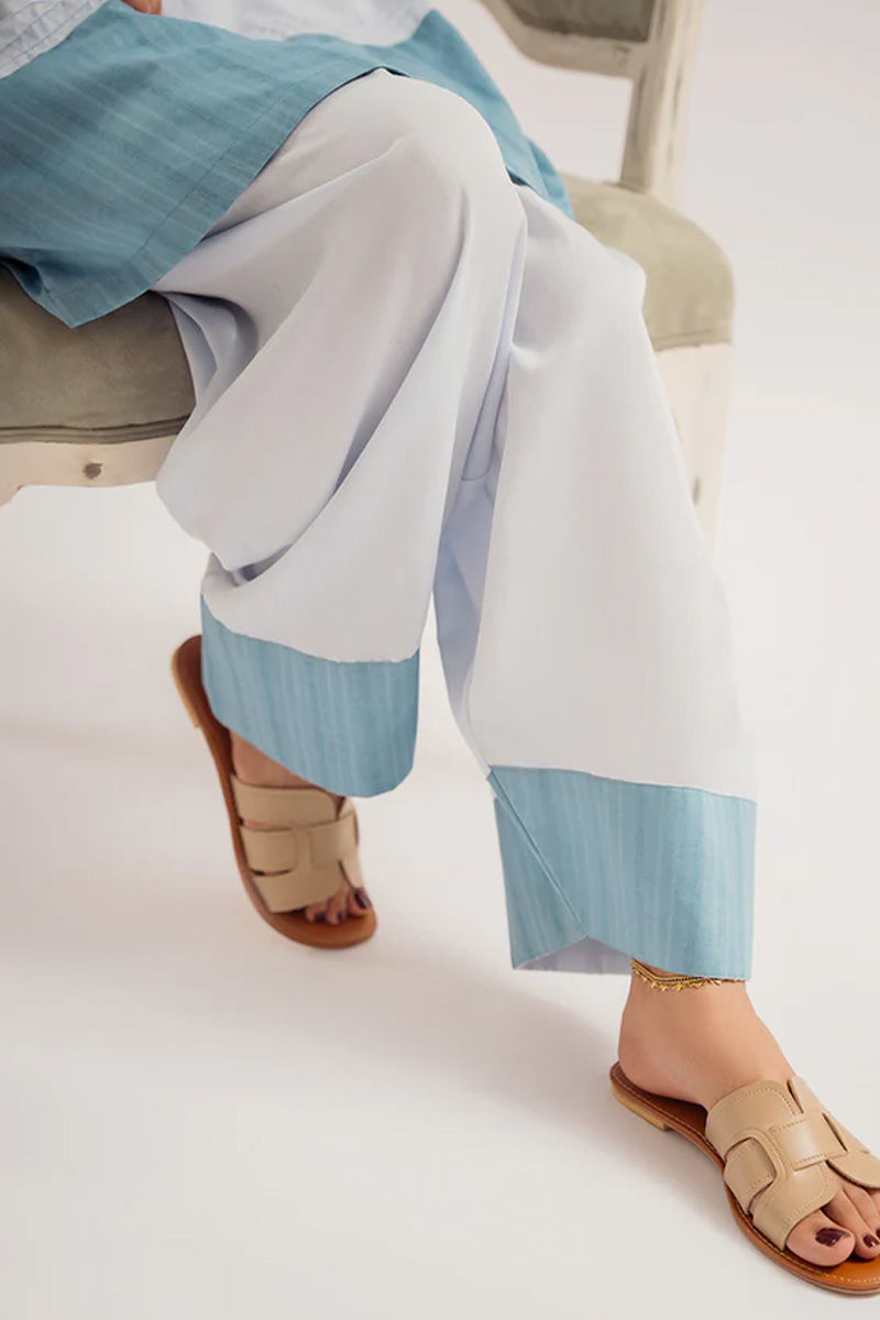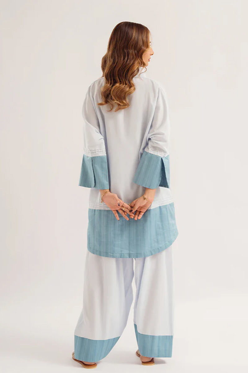 Step into effortless elegance with this exquisite ensemble.The short shirt, in a soothing light blue shade, boasts a clean, minimalist design that accentuates its simplicity and sophistication. Delicate tassels adorn the neckline, adding a subtle hint of charm and movement.The shalwar's fluid drape offers comfort and ease of movement, while its understated elegance complements the structured silhouette of the shirt.