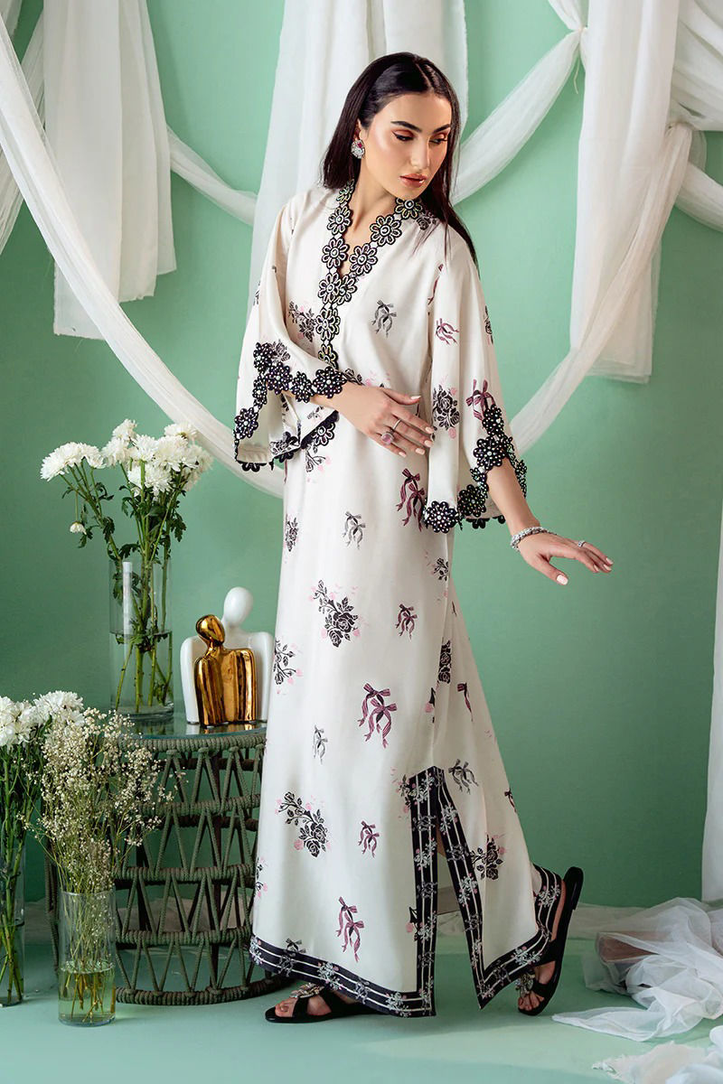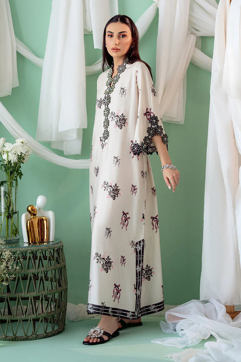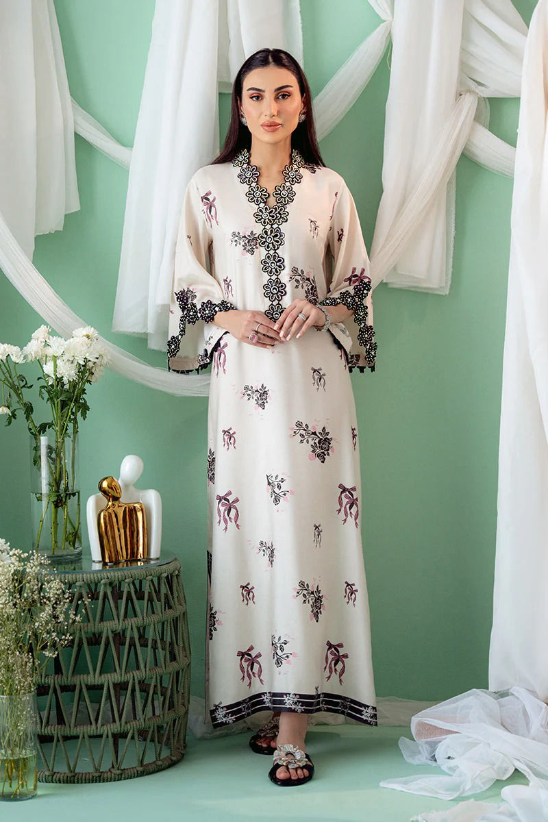 An exquisite Khaddi Silk ivory kurta with a striking black bow and floral print, designed in a graceful kaftan cut. The soft ivory silk fabric serves as a beautiful canvas for the bold floral motifs, which delicately intertwine with the classic black bow design, creating a stunning visual contrast. The overlap neckline adds a modern, flattering silhouette, while the hand-embroidered details around the neckline and sleeves. Maximum shirt length : 56" , Model height : 5'9