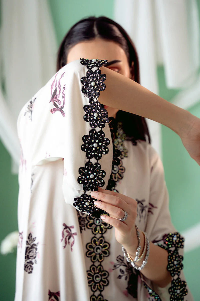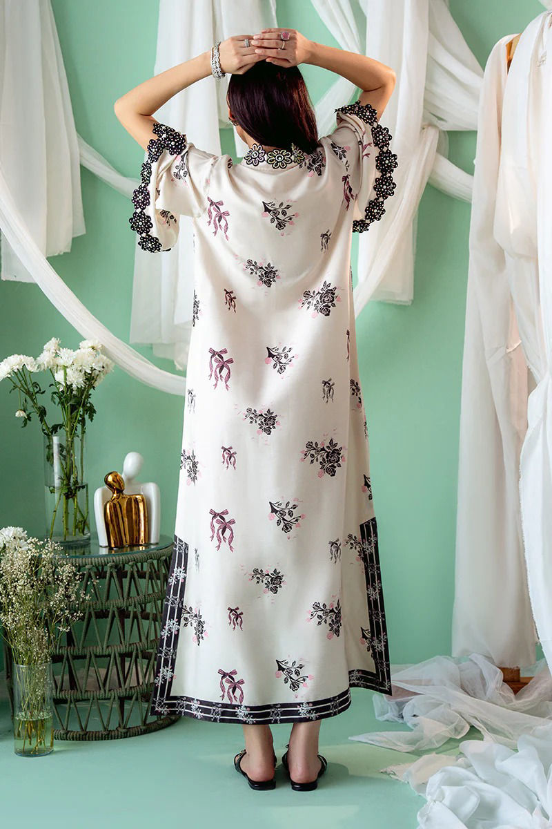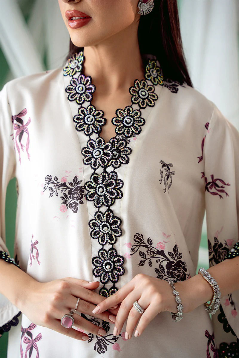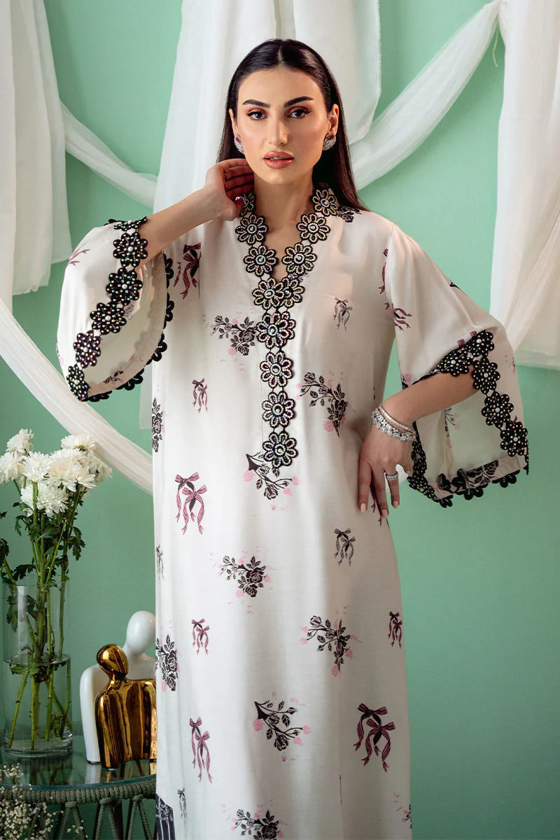 An exquisite Khaddi Silk ivory kurta with a striking black bow and floral print, designed in a graceful kaftan cut. The soft ivory silk fabric serves as a beautiful canvas for the bold floral motifs, which delicately intertwine with the classic black bow design, creating a stunning visual contrast. The overlap neckline adds a modern, flattering silhouette, while the hand-embroidered details around the neckline and sleeves. Maximum shirt length : 56" , Model height : 5'9