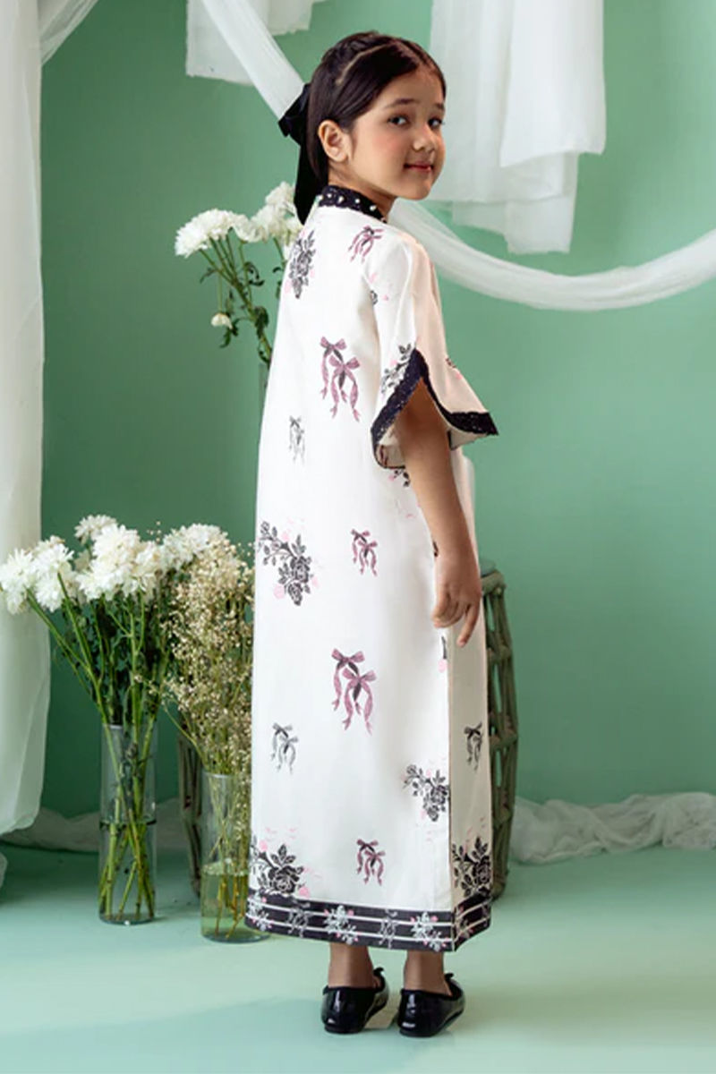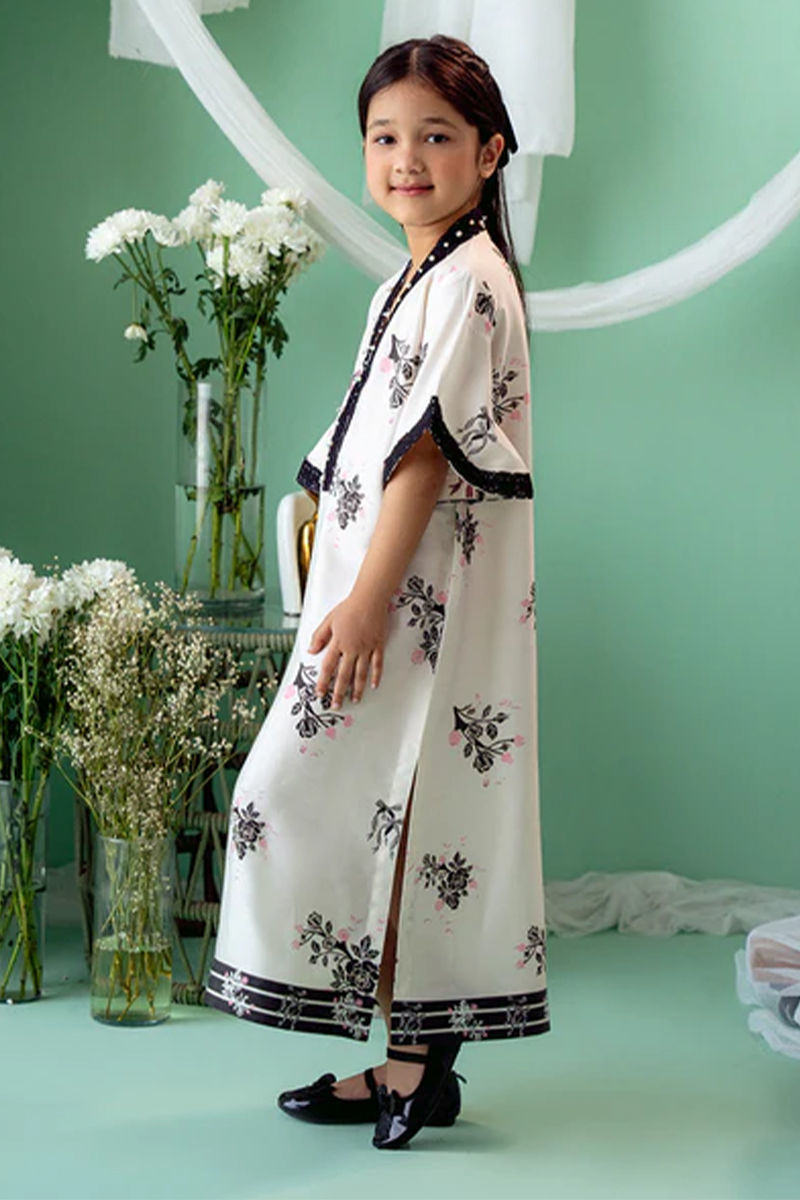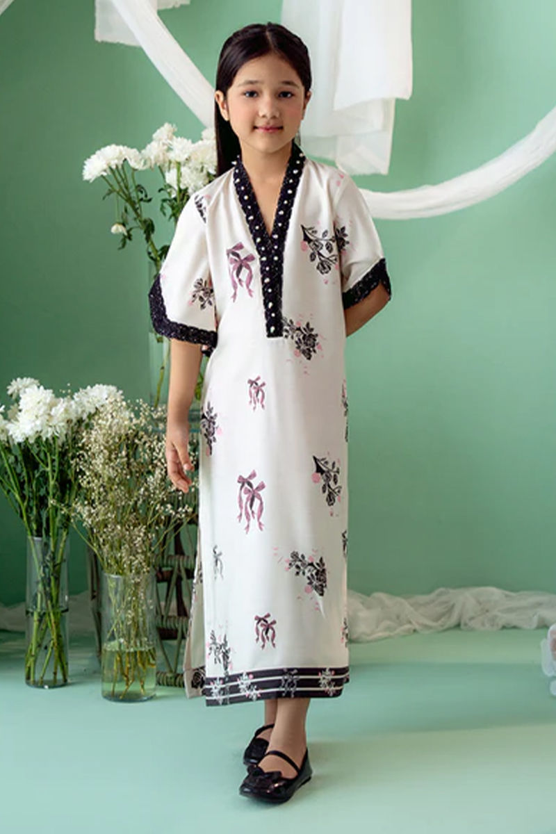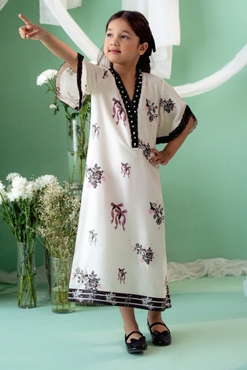 An exquisite Khaddi Silk ivory kurta with a striking black bow and floral print, designed in a graceful kaftan cut. The soft ivory silk fabric serves as a beautiful canvas for the bold floral motifs, which delicately intertwine with the classic black bow design, creating a stunning visual contrast. The overlap neckline adds a modern, flattering silhouette, while the hand-embroidered details around the neckline. Shirt length : 36" , Model height : 3'9