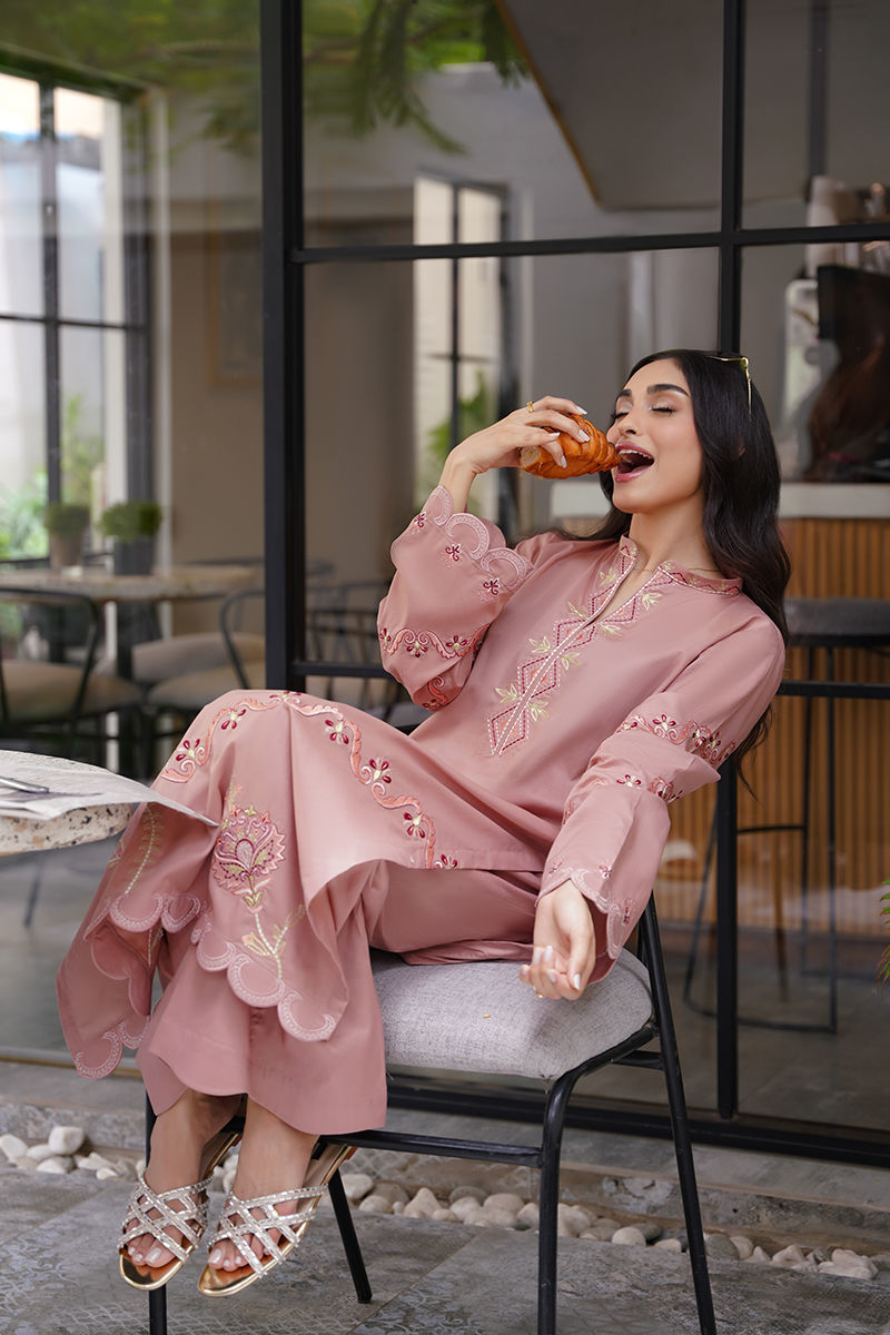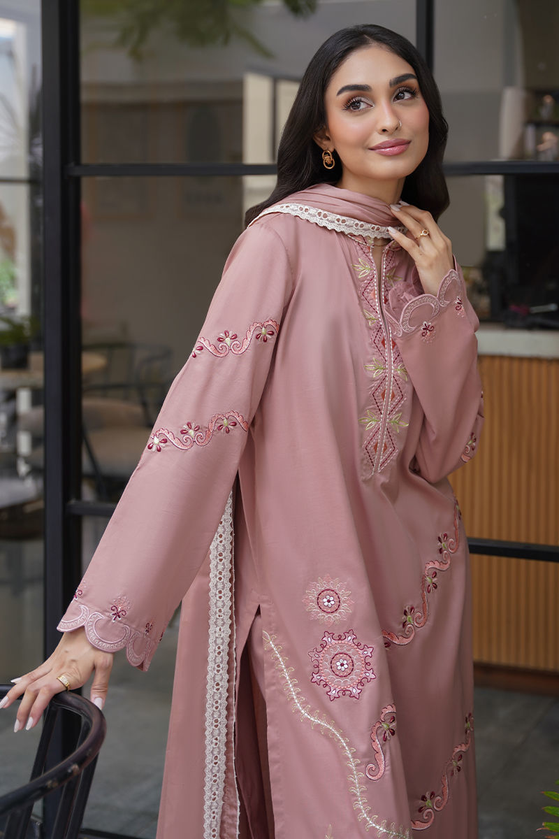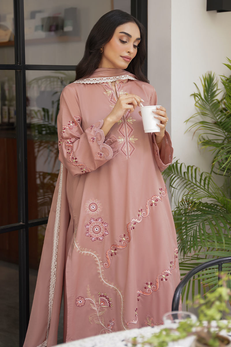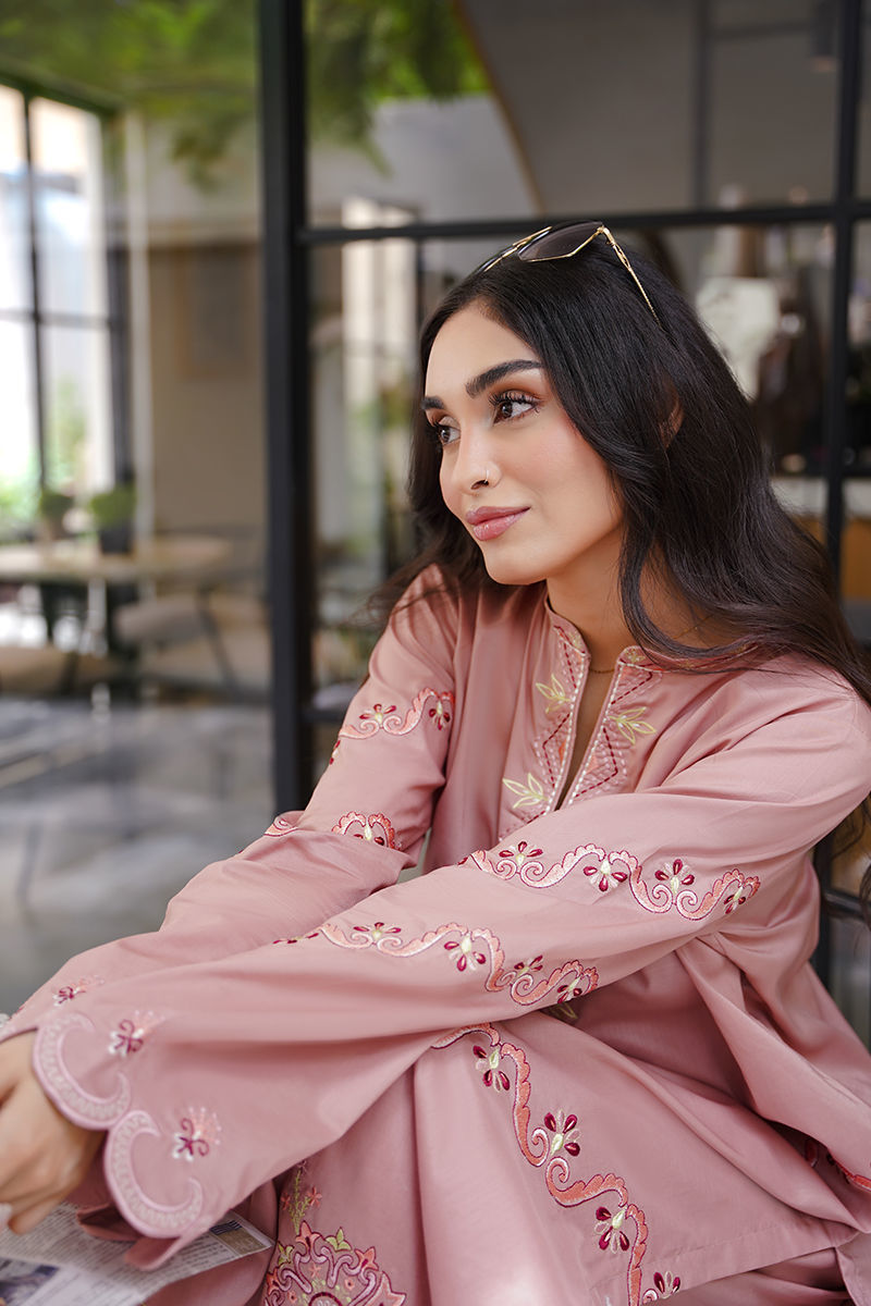 Soft yet striking, this pink long shirt is a celebration of intricate artistry and feminine charm. Adorned with delicate embroidery in tones of ivory, blush pink, and rich reds, the design weaves geometric and floral patterns together for a modern yet timeless look. Paired with coordinated pants for an effortlessly elegant silhouette, the ensemble is elevated further with an optional silk dupatta — luxuriously lightweight and beautifully finished with lace detailing for a graceful, refined touch. Perfect for luncheons or intimate gatherings! maximum shirt length:46 Model height:5'5 Style: Loose Fit Shirt: Cambric Lawn Dupatta: Tissue Silk Trouser: Cambric Lawn