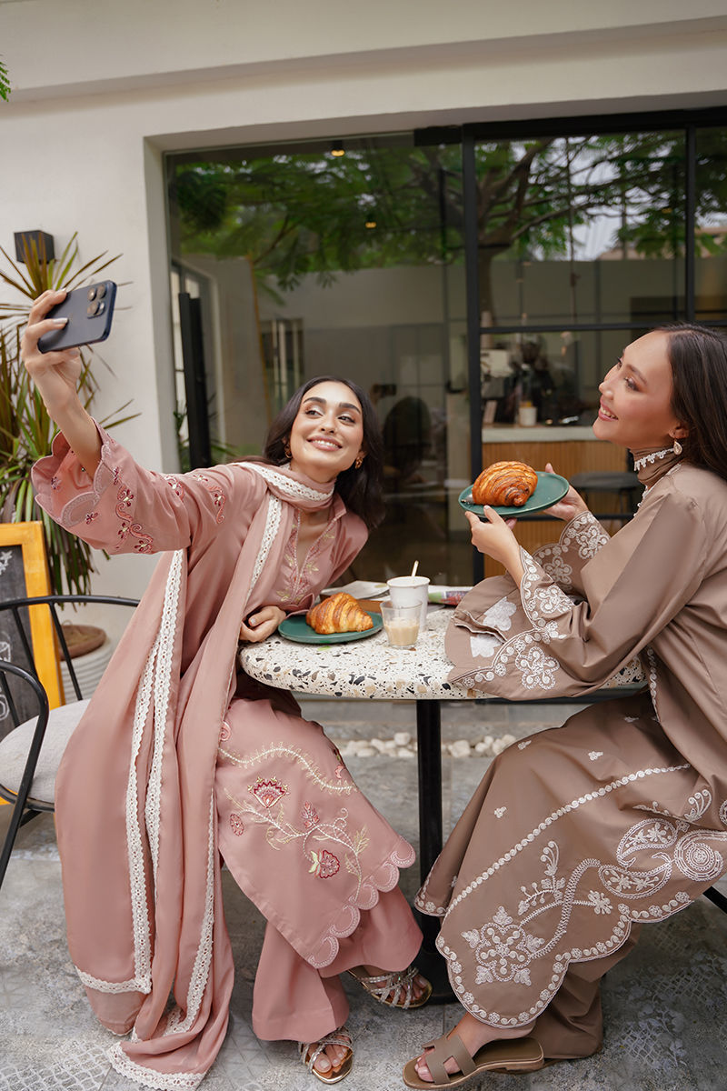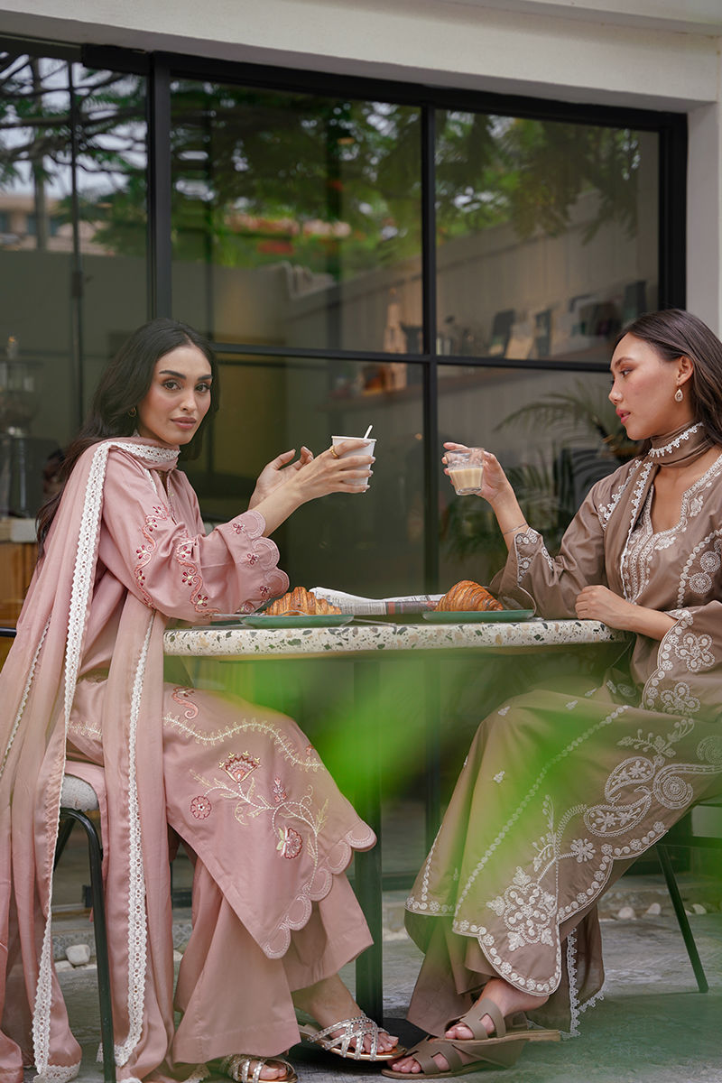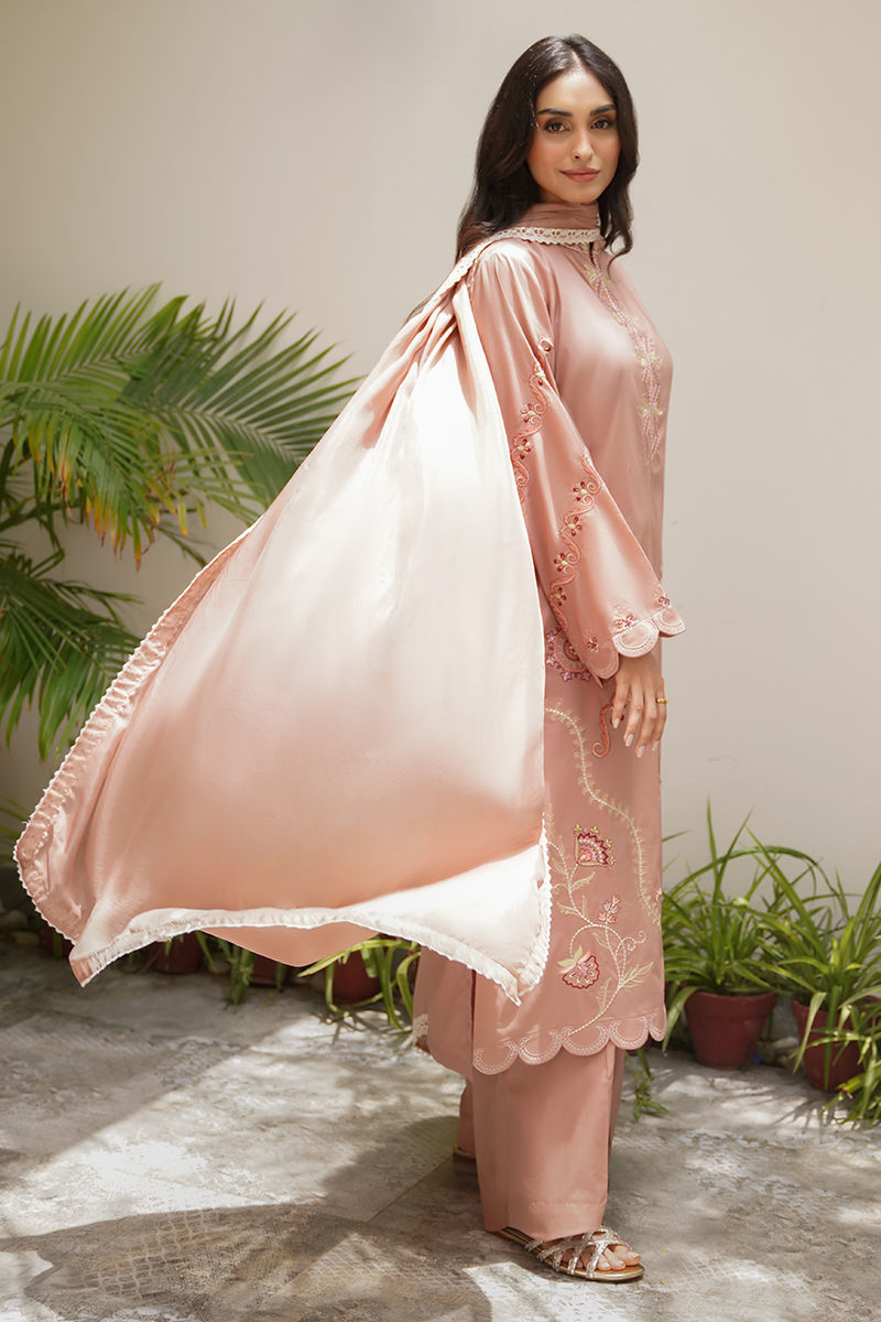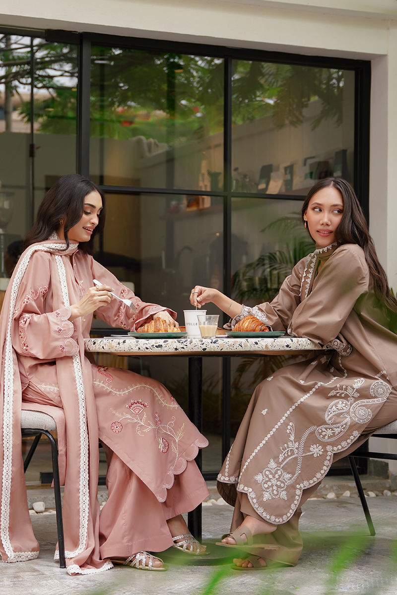 Soft yet striking, this pink long shirt is a celebration of intricate artistry and feminine charm. Adorned with delicate embroidery in tones of ivory, blush pink, and rich reds, the design weaves geometric and floral patterns together for a modern yet timeless look. Paired with coordinated pants for an effortlessly elegant silhouette, the ensemble is elevated further with an optional silk dupatta — luxuriously lightweight and beautifully finished with lace detailing for a graceful, refined touch. Perfect for luncheons or intimate gatherings! maximum shirt length:46 Model height:5'5 Style: Loose Fit Shirt: Cambric Lawn Dupatta: Tissue Silk Trouser: Cambric Lawn