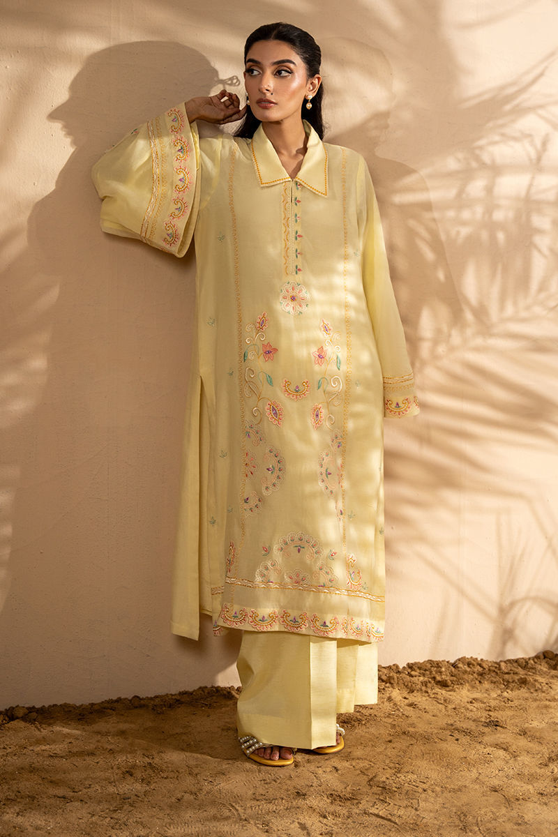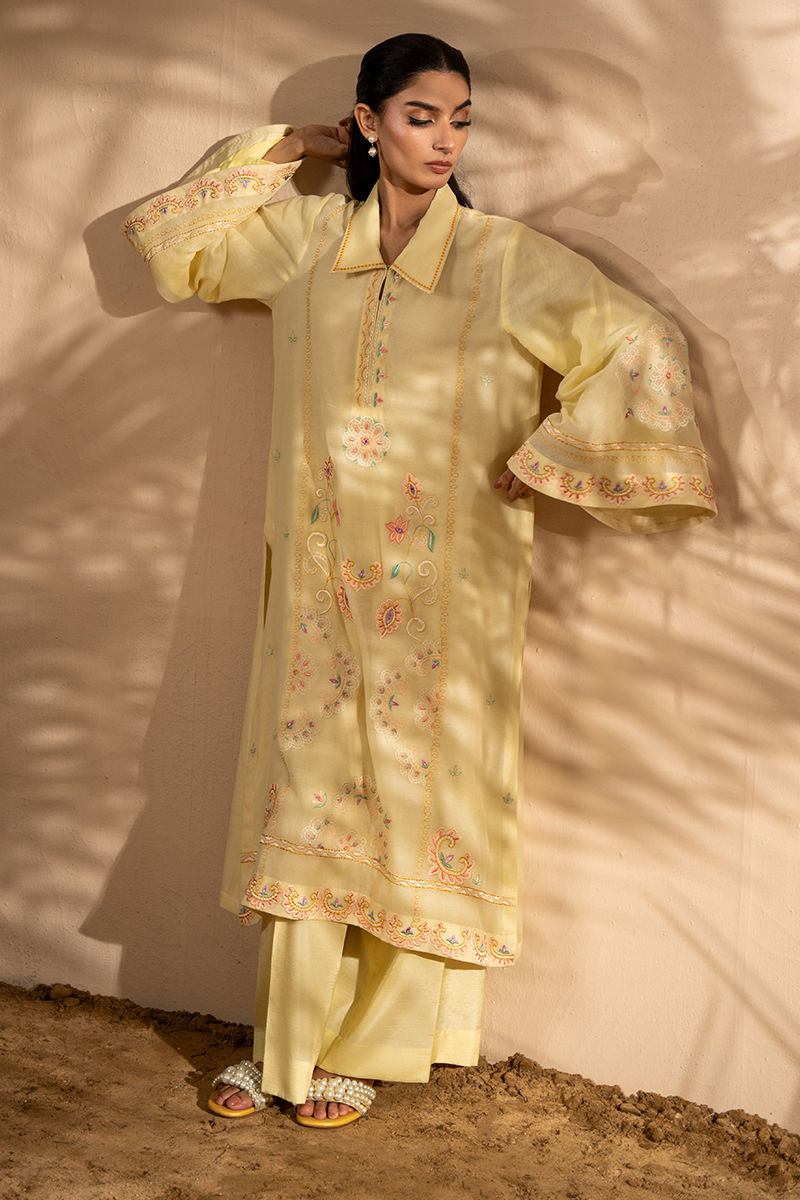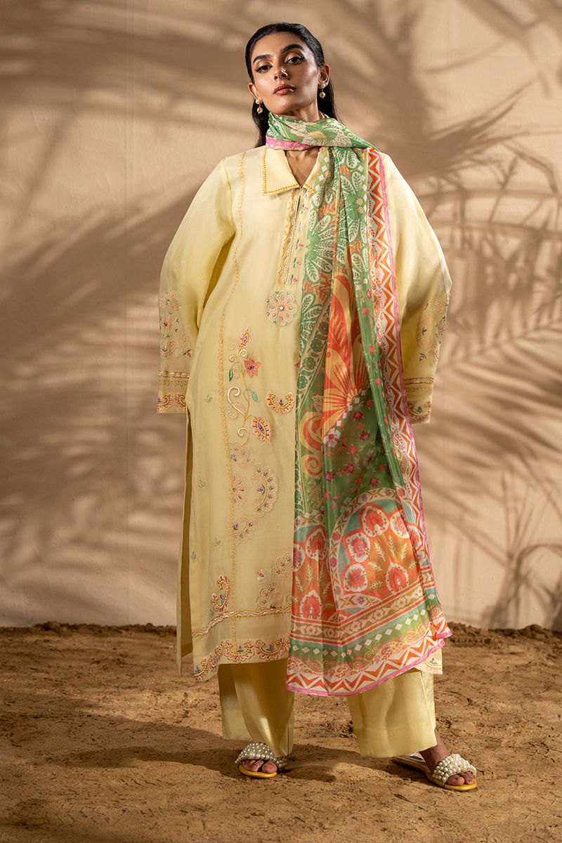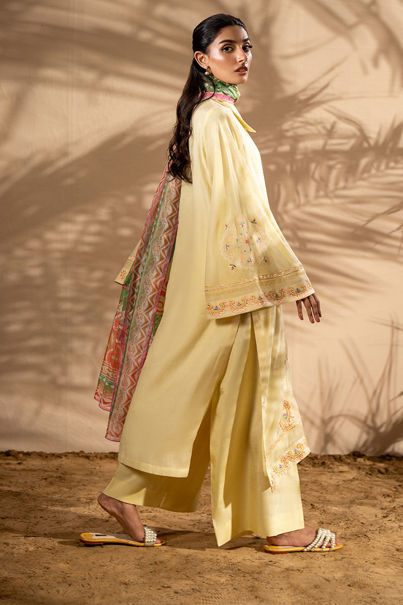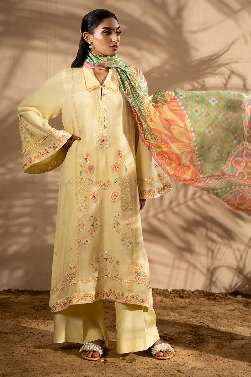 This radiant shirt is adorned with intricate embroidery and delicate sheesha work, creating a soft shimmer that catches the light effortlessly. The trumpet sleeves add a modern, airy touch, enhancing the breezy silhouette. Paired with sleek imported raw silk pants and a contrasting printed silk dupatta, the look strikes the perfect balance between elegance and vibrancy. A must-have for chic summer soirees and festive daytime affairs. Dupatta is an add on.Shirt maximum length 45Model height 5'5
