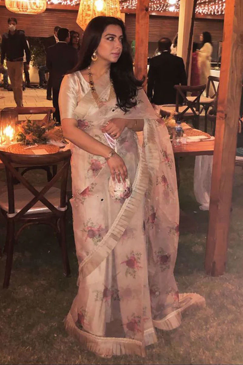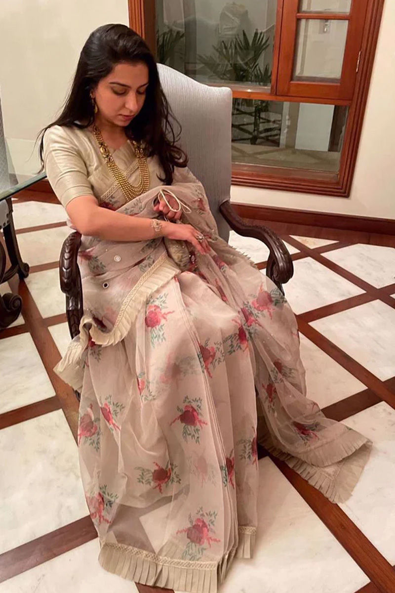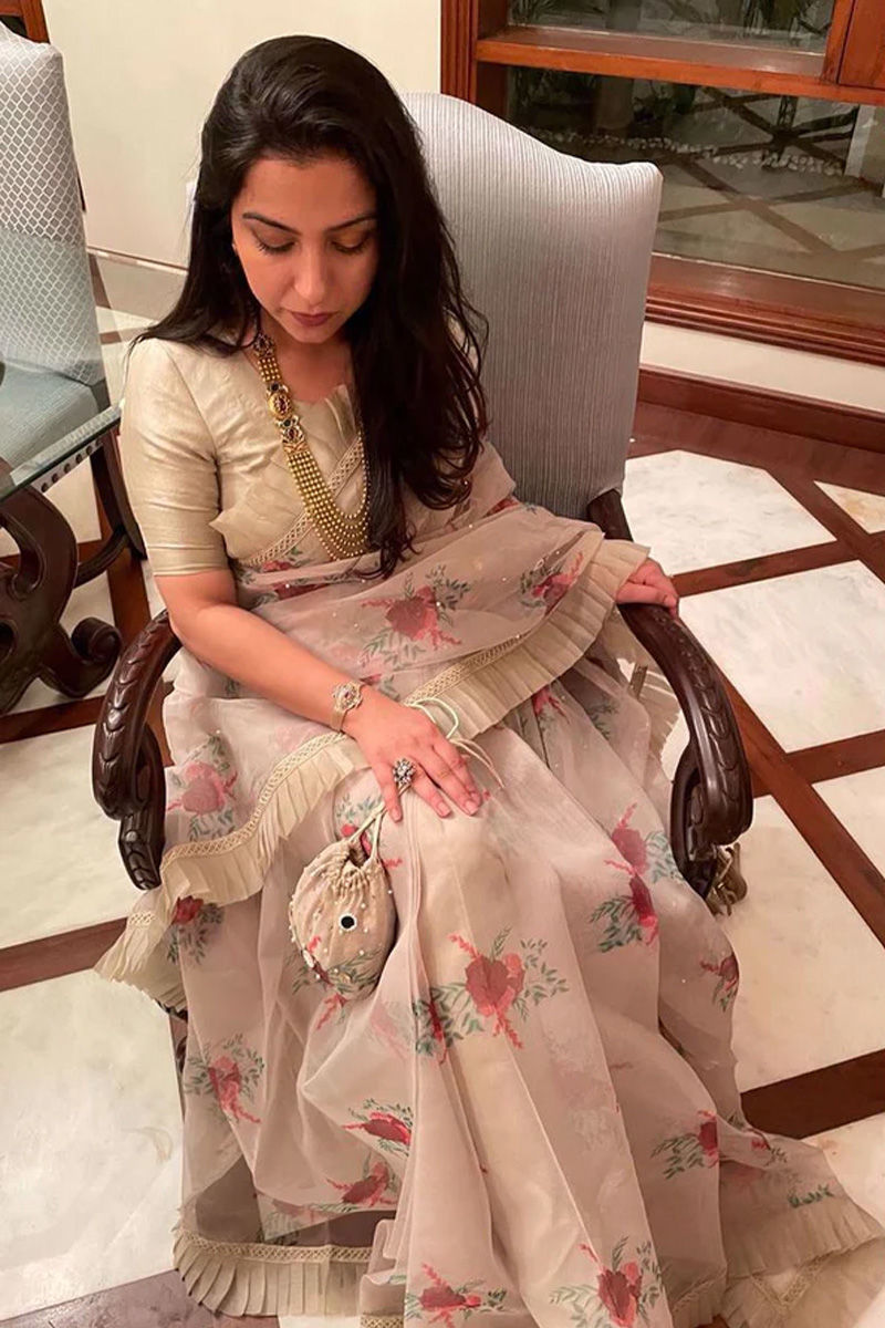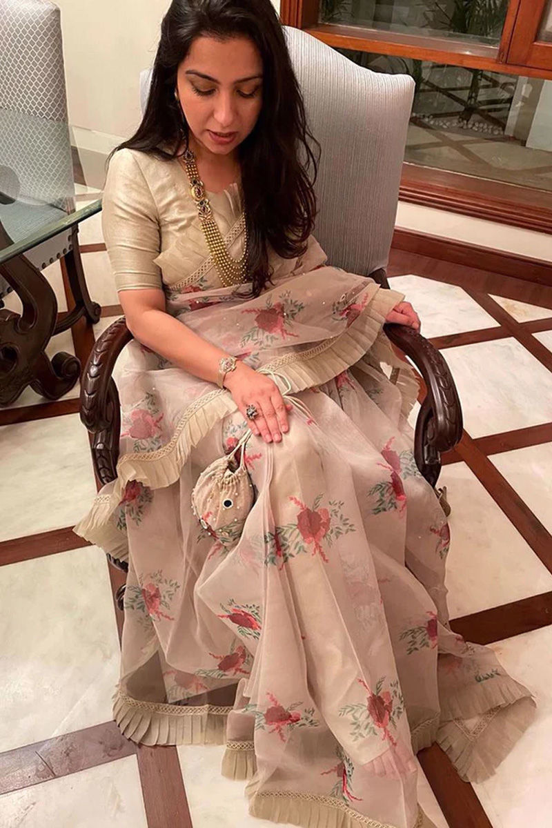 An exquisite saree with festive floral digital printing. Intricate ganga jamna handwork and gota detailing give makes this outfit not be missed. There’s a spray of sequins mirrors and gota. Saree: Orgnaza