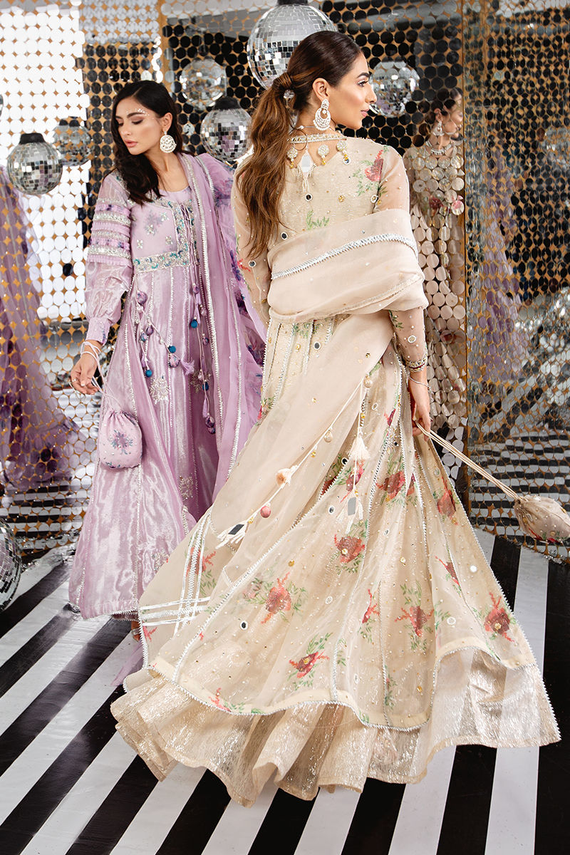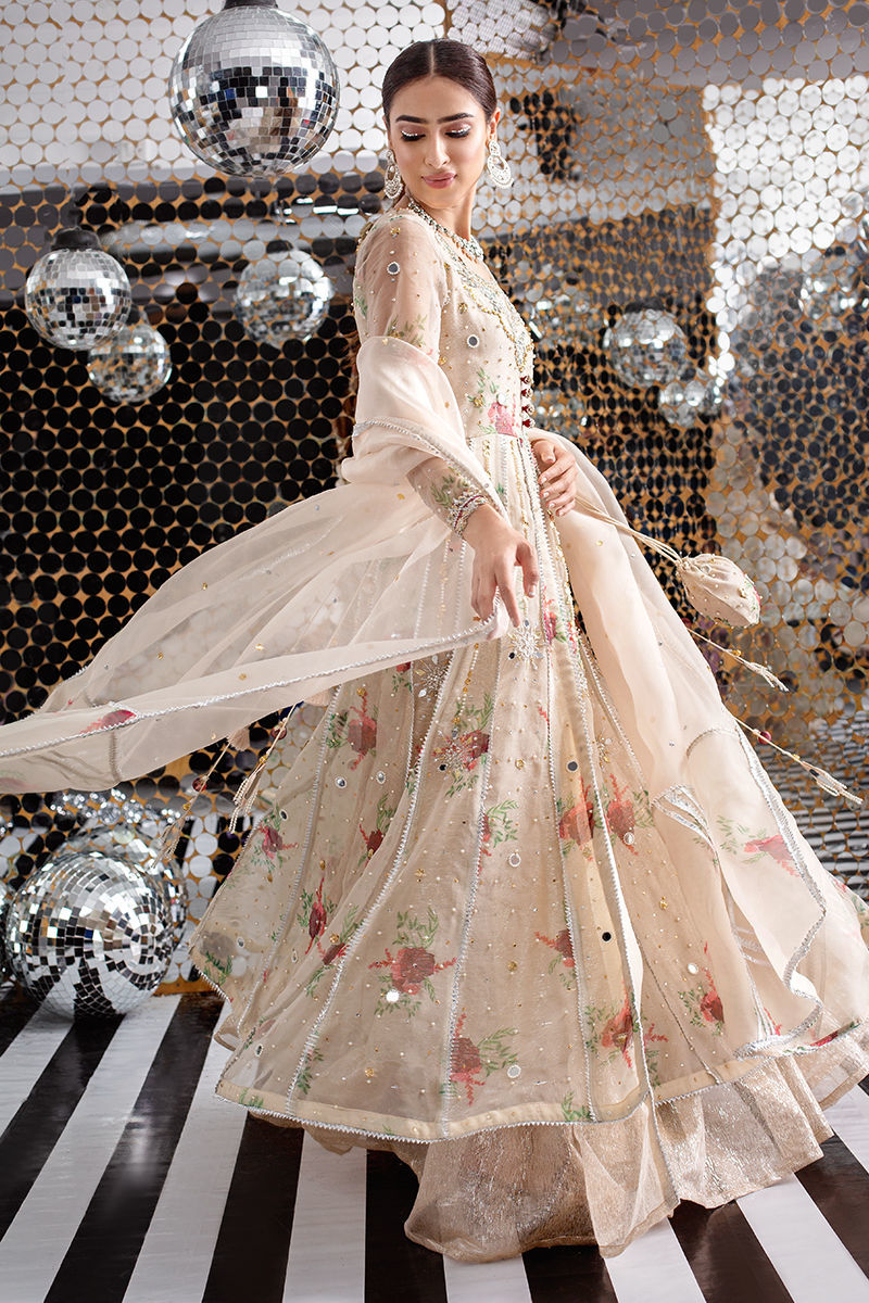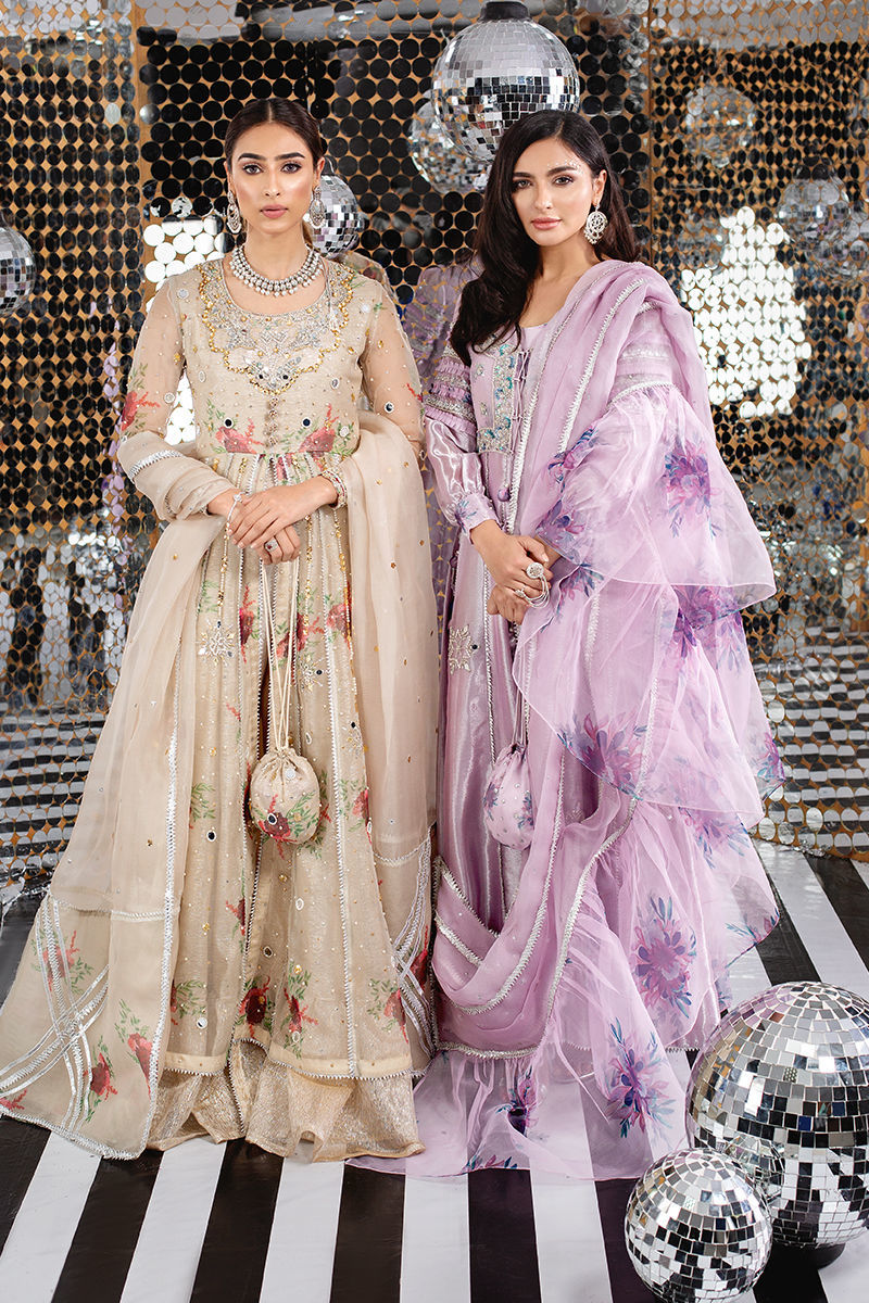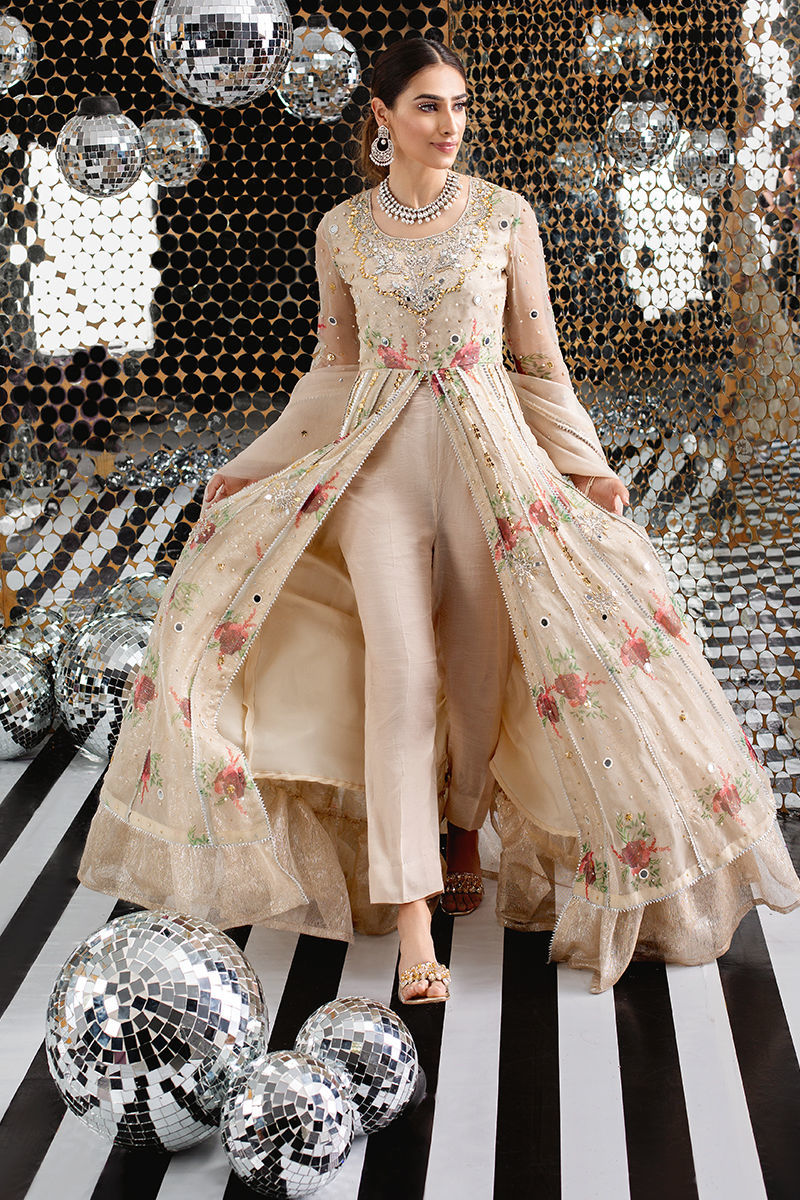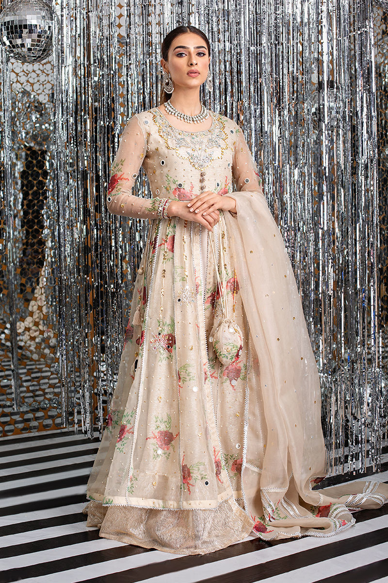An exquisite front open kalidar with festive floral digital printing. And plush shimmer lining to make your occasion dreamy. Intricate ganga jamna hand work and gota detailing gives makes this outfit not be missed. There’s a spray of sequins mirrors and gota. Shirt: Raw Silk Dupatta: Raw Silk Pant: Raw Silk