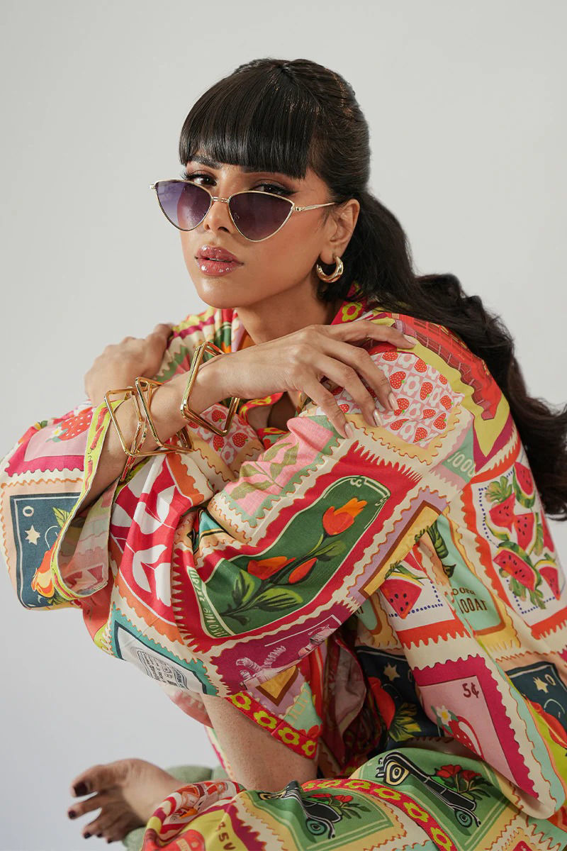 This vibrant Khaddi Silk co-ord set brings a playful, artistic touch to your wardrobe. Featuring a unique postcard-inspired print with funky patterns in shades of orange, peach, pink, and green, the set offers a fresh, eclectic vibe. The rich texture of the Khaddi Silk elevates the colorful design, creating a perfect balance between casual comfort and creative flair. Whether you're dressing for a laid-back day or a fun outing, this co-ord set stands out with its bold patterns and lively hues, making a statement while maintaining a relaxed, chic aesthetic. Model height 5'8, maximum shirt length 27" Shirt: Khaddi Silk Pant: Khaddi Silk