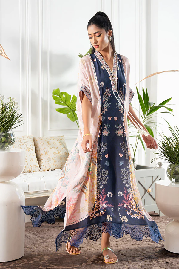 Crepe silk fusion kaftan with bohemian and floral luxe print. Hand worked neckline and our signature pearl tassles are enough to turn heads around. Lace details on daaman ties up the ensemble together.